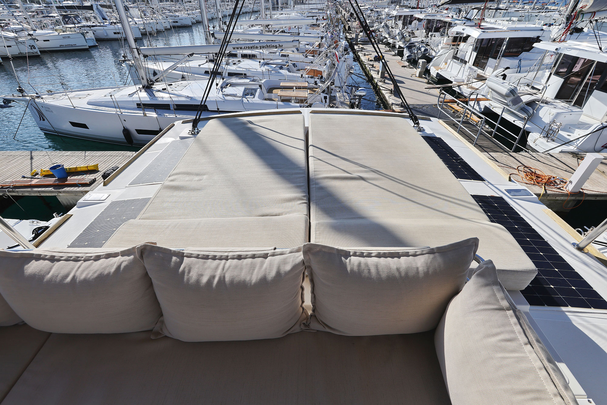 | Outside | Bathing platform, Bimini top, Cockpit shower, Cockpit speakers, Cockpit cushions, Cockpit table, Deck cushions, Flybridge, BBQ, Cushions for flybridge, Solar panels |