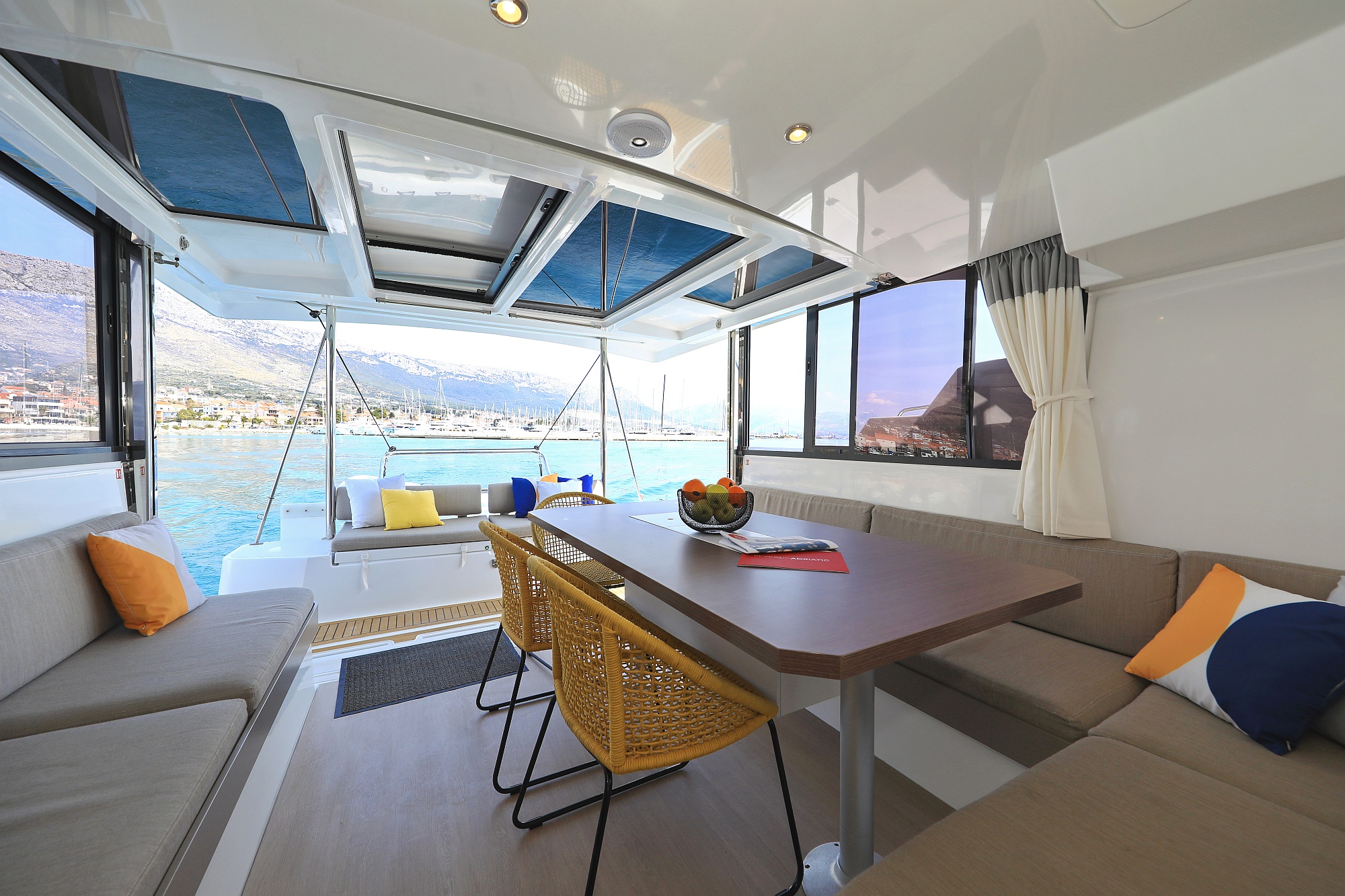 | Outside | Bathing platform, Bimini top, Cockpit shower, Cockpit speakers, Cockpit cushions, Cockpit table, Deck cushions, Flybridge, Cushions for flybridge, Solar panels |