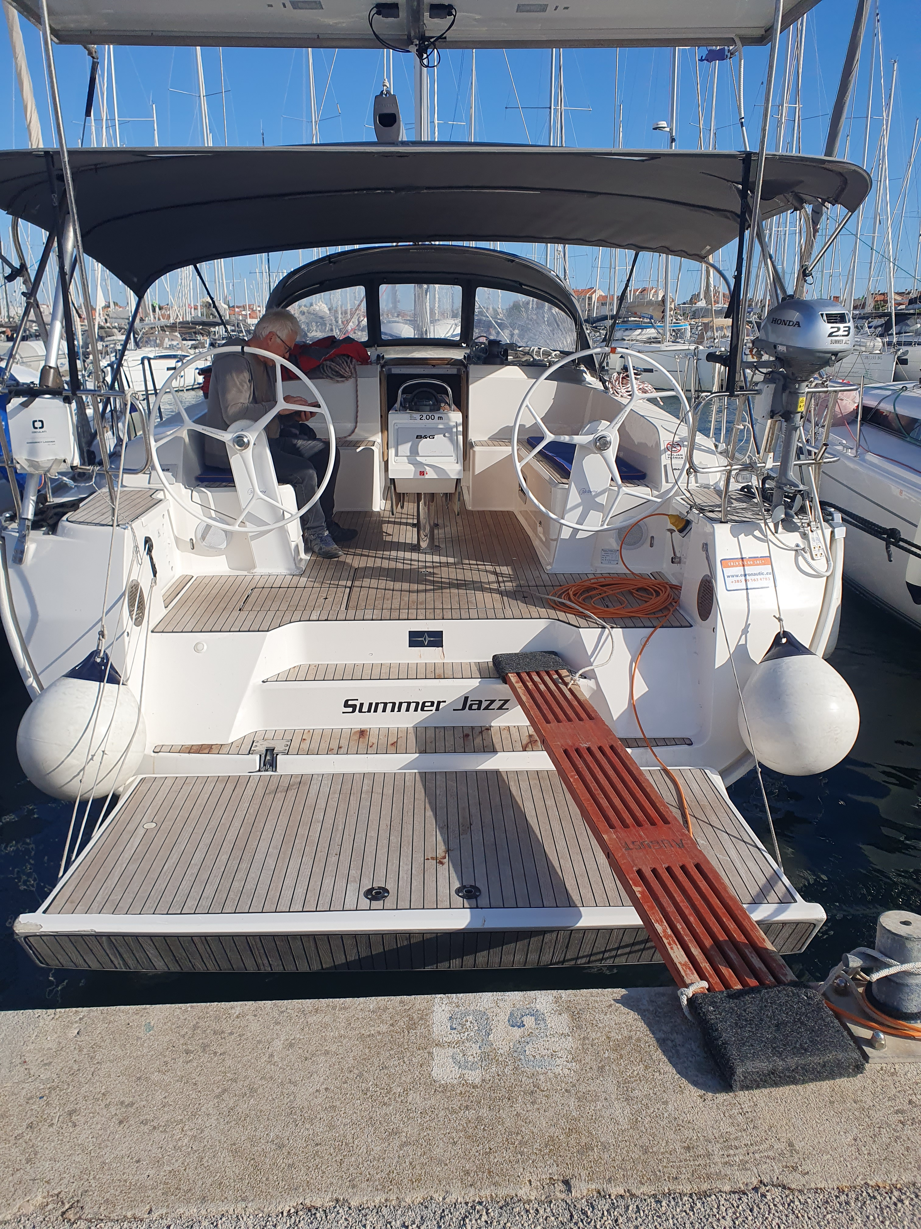 | Outside | 220V shore connection, Anchor with chain, Bathing platform, Bimini top, Cockpit shower, Cockpit speakers, Cockpit cushions, Cockpit table, Electr. anchor windlass, Fender, Mooring lines, Solar panels, Sprayhood, Drift anchor , Windex |