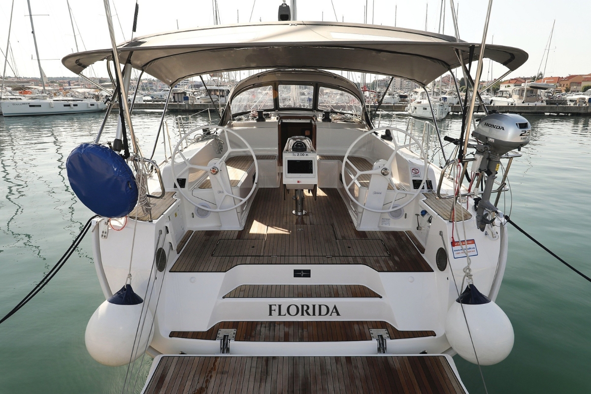 | Outside | 220V shore connection, Anchor with chain, Bathing platform, Bimini top, Cockpit shower, Cockpit cushions, Cockpit table, Electr. anchor windlass, Sprayhood, Teak in cockpit |