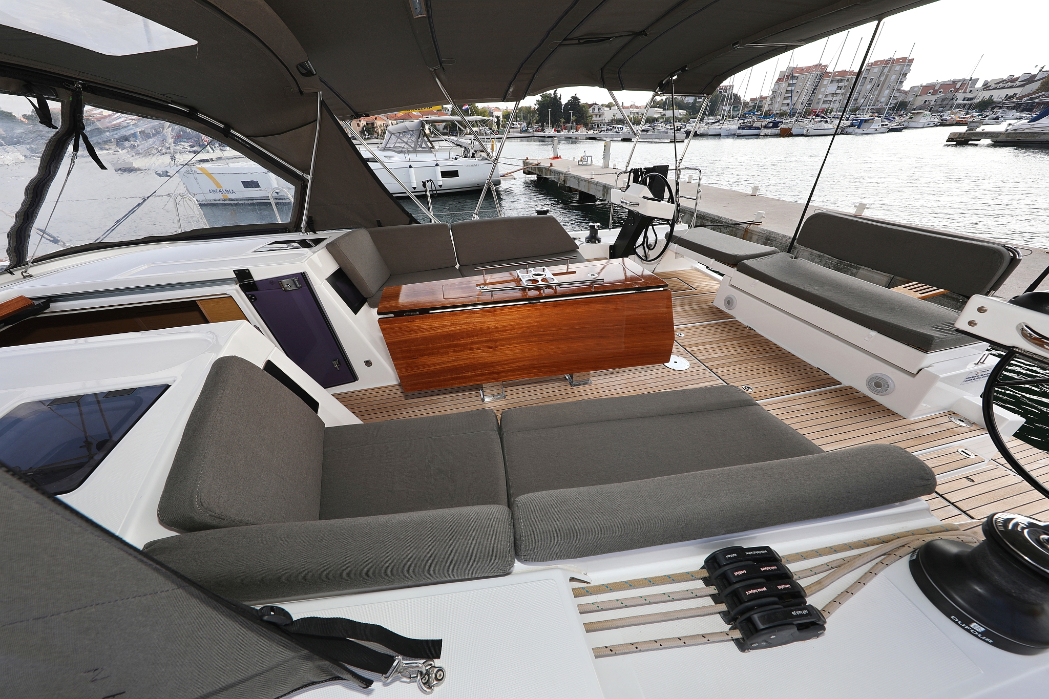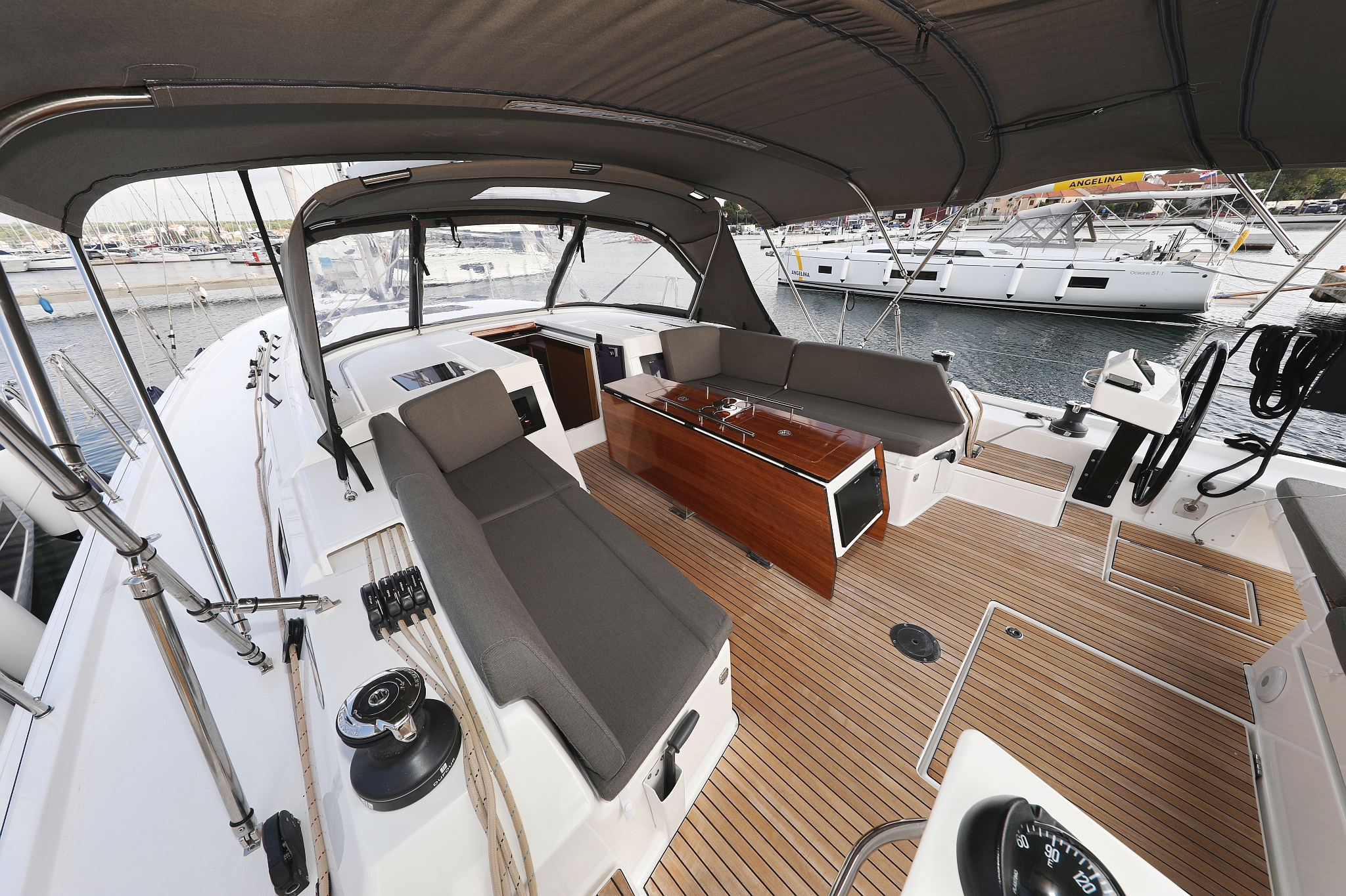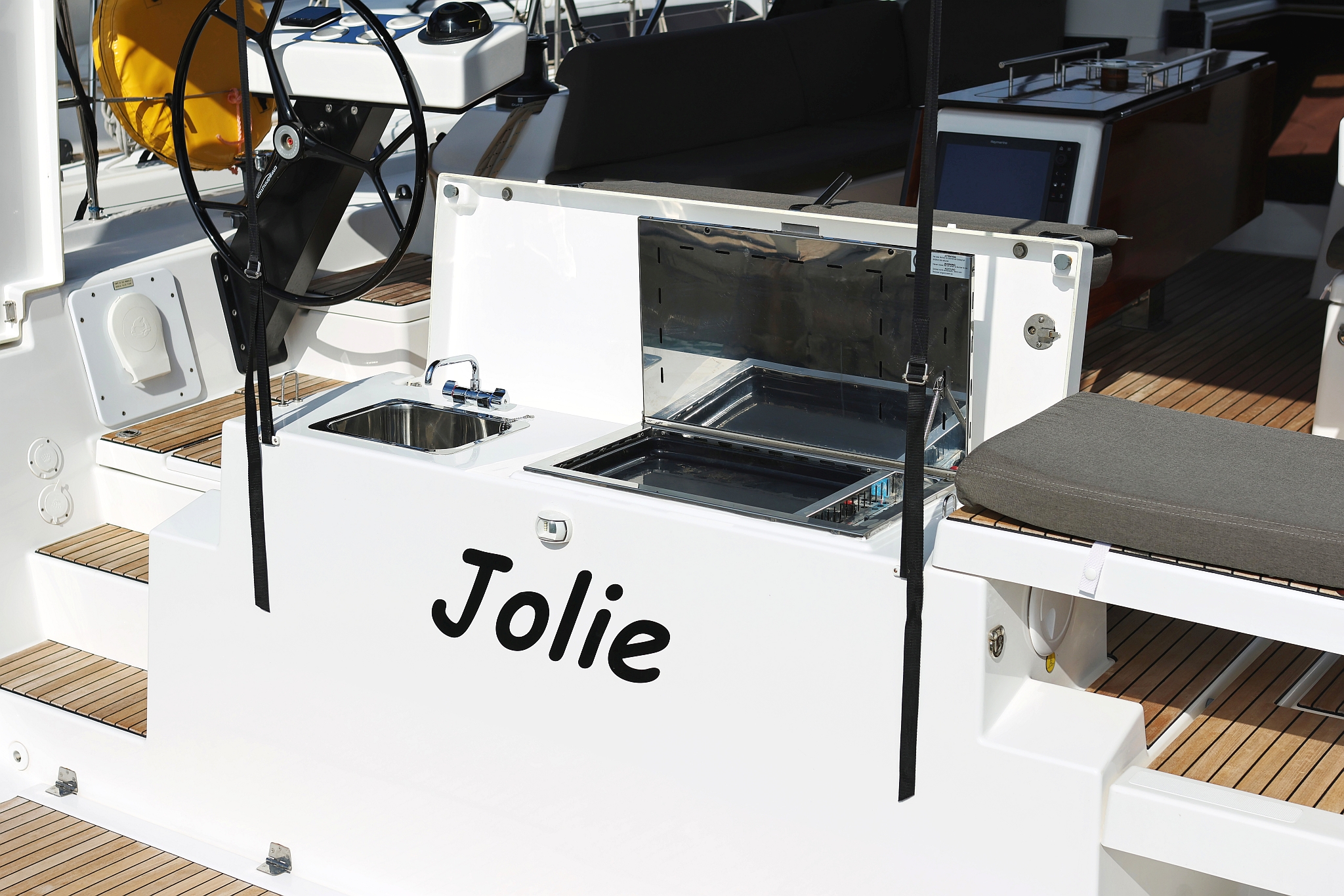 | Outside | 220V shore connection, Anchor with chain, Bathing platform, Bimini top, Boat hook, Cockpit shower hot/cold, Refrigerator in cockpit, Cockpit speakers, Cockpit cushions, Cockpit table, Electr. anchor windlass, Fender, Mooring lines, Gangway, BBQ, Solar panels, Sprayhood, Teak in cockpit, Water hose, Winches |