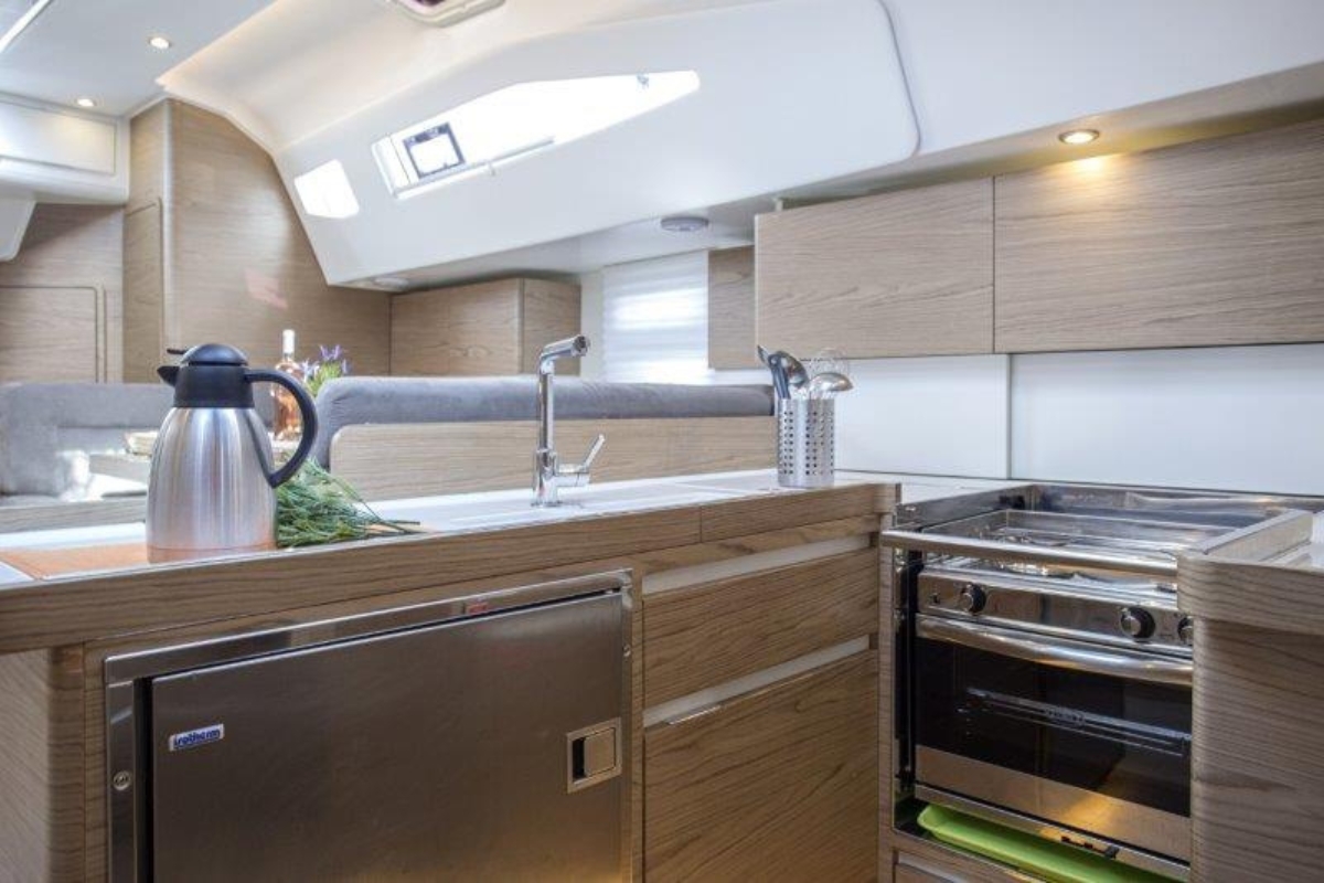 | Outside | 220V shore connection, Anchor with chain, Bathing ladder, Bathing platform, Bimini top, Boat hook, Cockpit shower, Refrigerator in cockpit, Cockpit speakers, Cockpit light, Cockpit cushions, Cockpit table, Electr. anchor windlass, electr. winch, Fender, Sprayhood, Teak in cockpit |