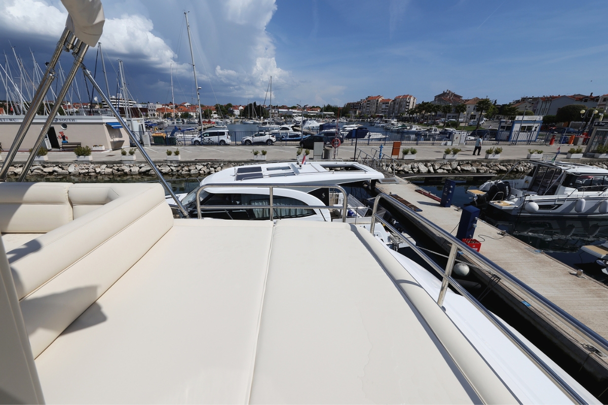 | Outside | Large bimini on flybridge, Cockpit cushions, Deck lights, Electr. anchor windlass, BBQ and fridge on flybridge, HiFi Speaker in Flybridge, Cushions for flybridge, Solar panels, Sun deck, sink on flybridge, Teak on bathing platform, Teak in cockpit |