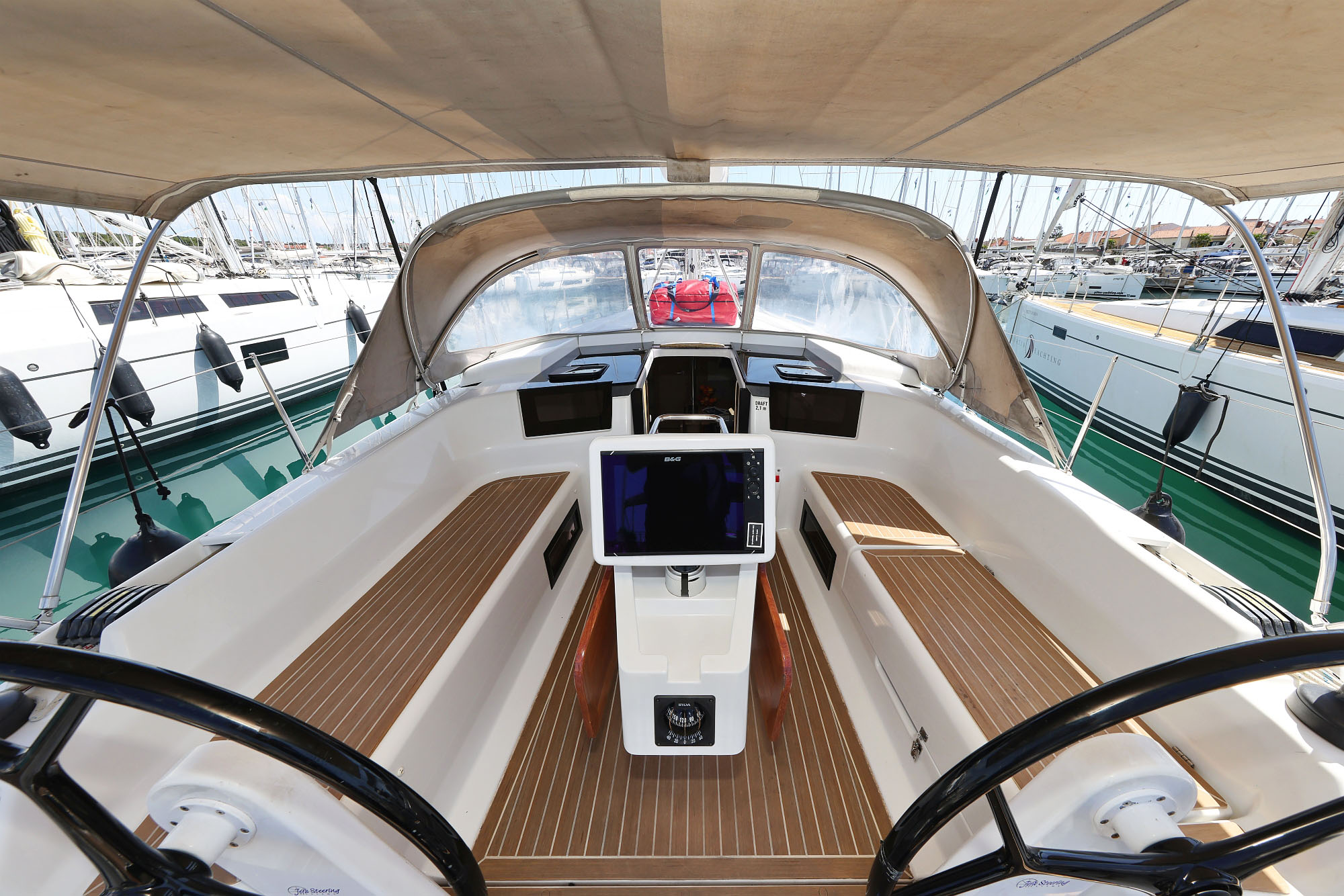 | Outside | Bathing platform, Bimini top, Cockpit shower, Refrigerator in cockpit, Cockpit speakers, Cockpit table, Electr. anchor windlass, Sprayhood, Teak in cockpit |