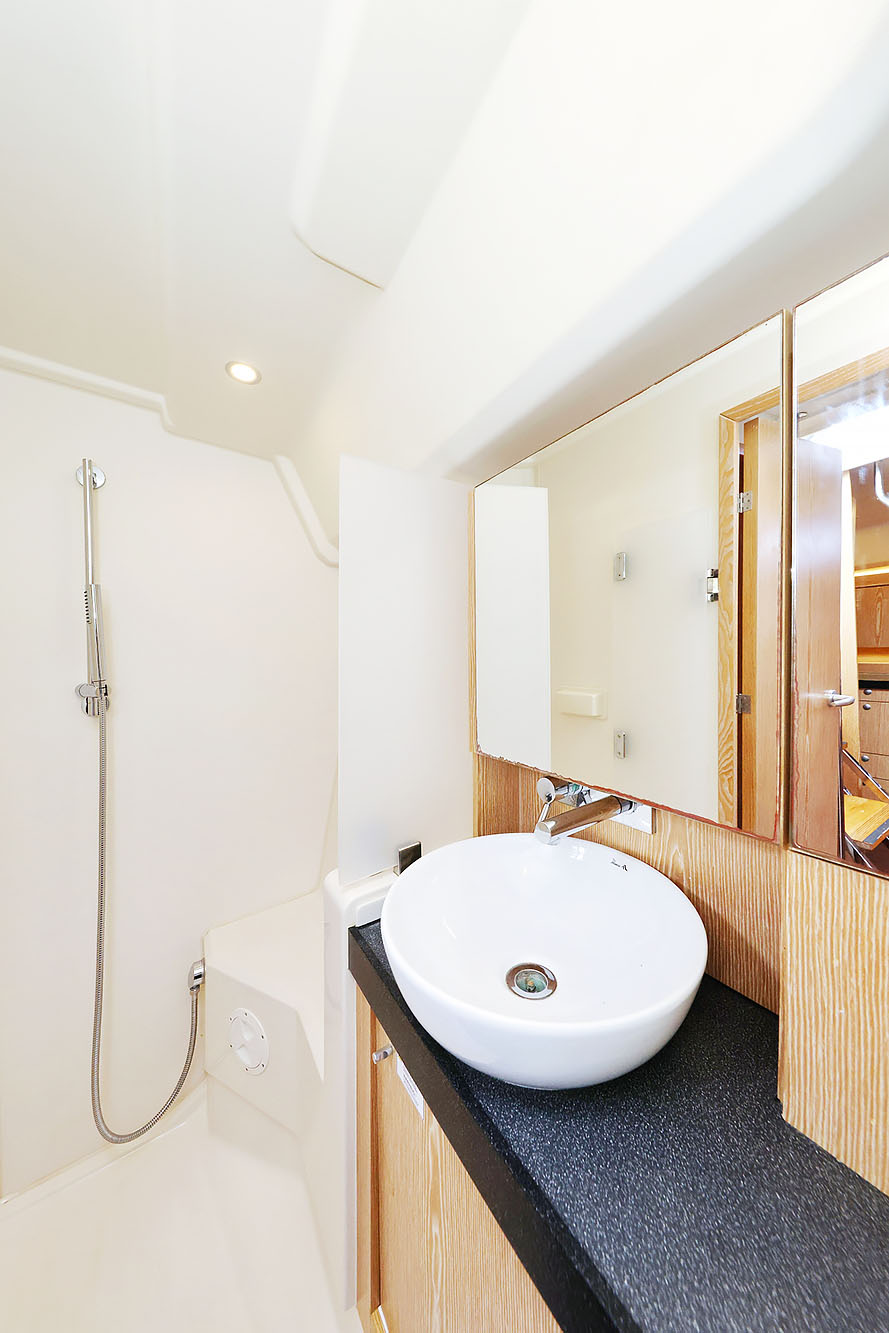 | Outside | Bathing platform, Bimini top, Cockpit shower, Cockpit speakers, Cockpit table, Electr. anchor windlass, Sprayhood, Teak in cockpit |