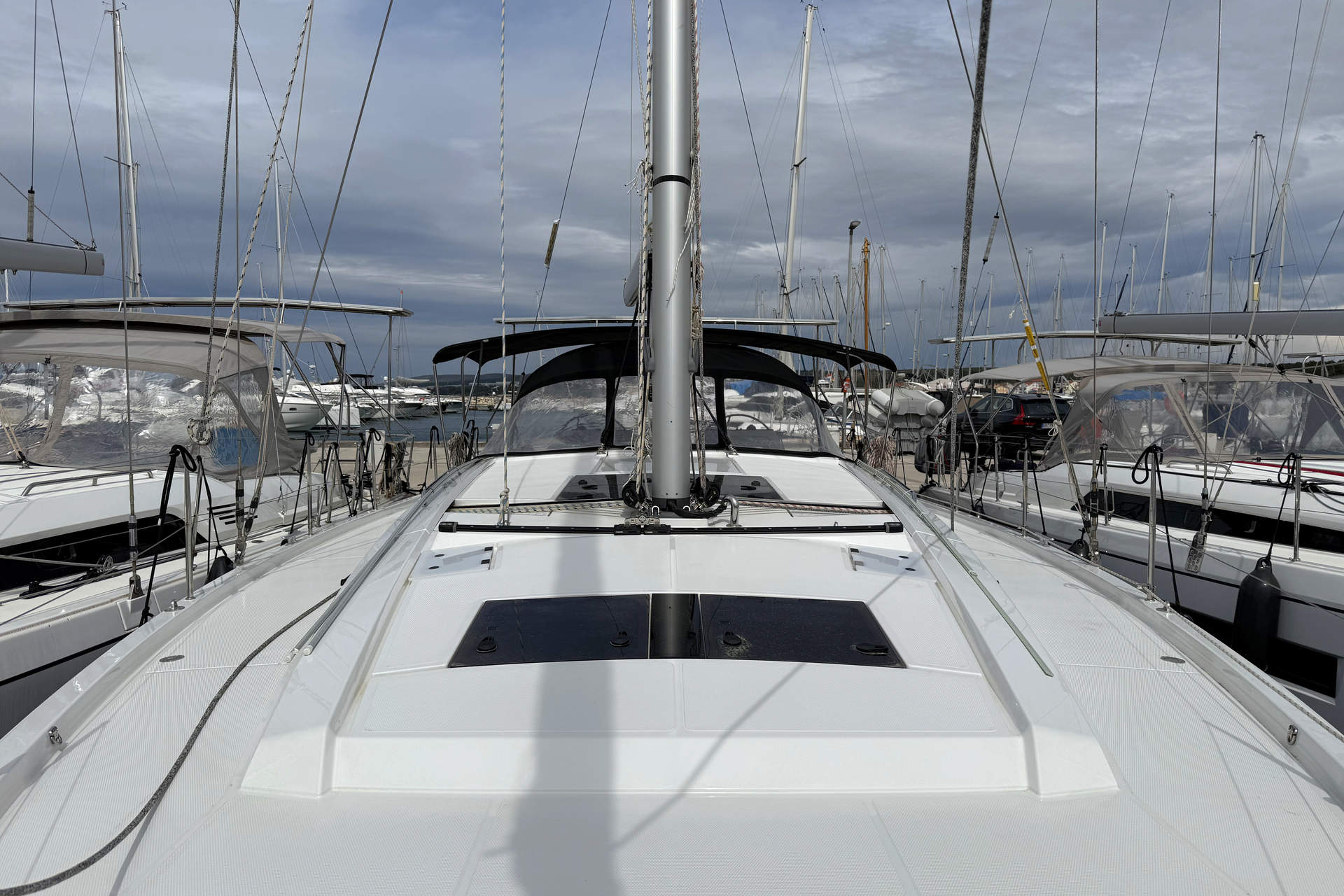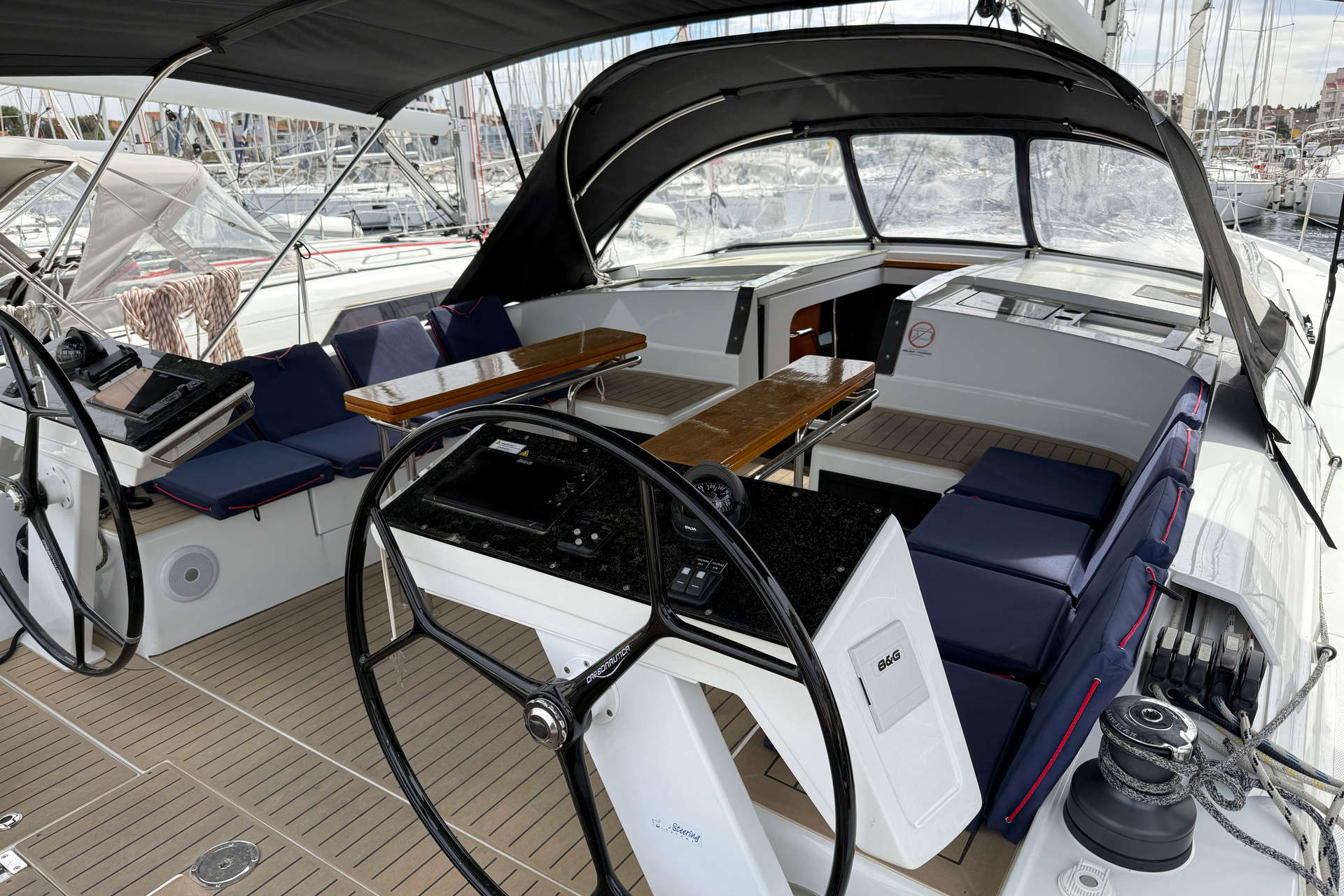 | Outside | 220V shore connection, Bathing ladder, Bathing platform, Bimini top, Boat hook, Cockpit shower, Cockpit speakers, Cockpit cushions, Cockpit table, Cover brush, Electr. anchor windlass, electr. winch, Fender, Mooring lines, Gangway, Lifeline system, Snorkeling gear, Solar panels, Sprayhood, Teak on bathing platform, Teak in cockpit, Wire (shroud) cutter, Windex |