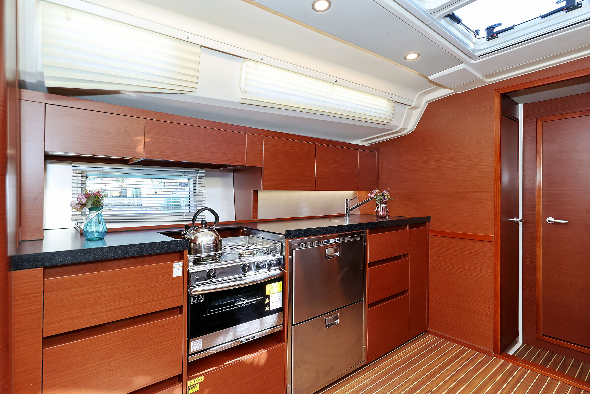 | Outside | Bathing platform, Bimini top, Cockpit shower, Cockpit speakers, Cockpit table, Electr. anchor windlass, Electr. main sail winch, Sprayhood, Teak in cockpit |