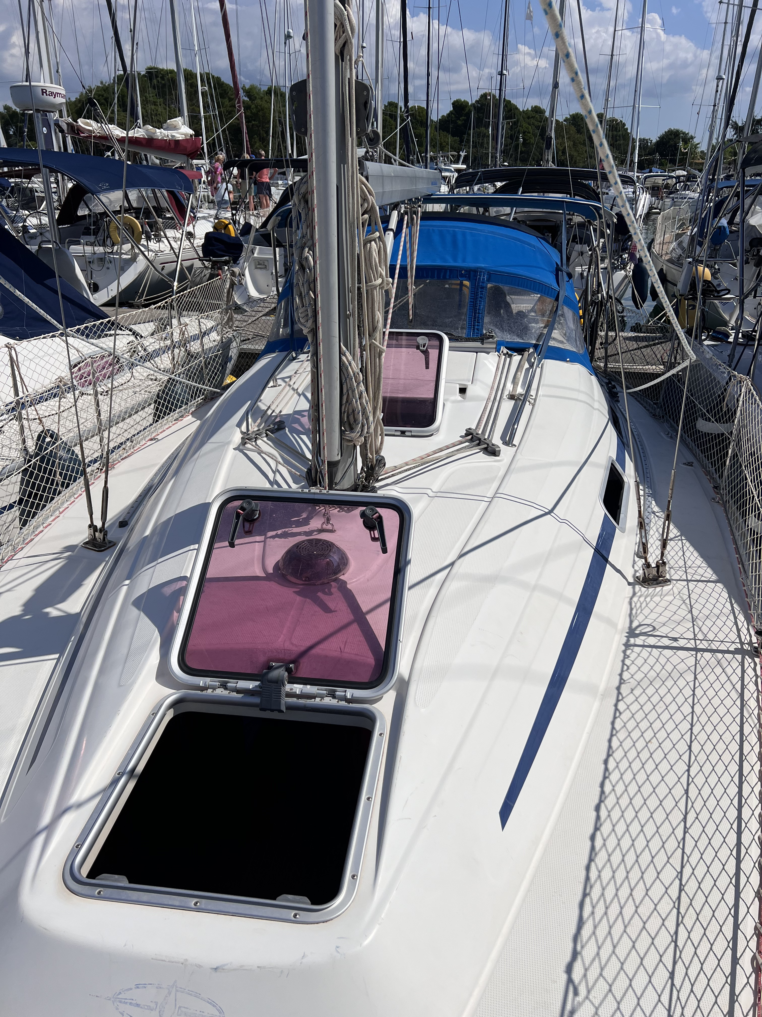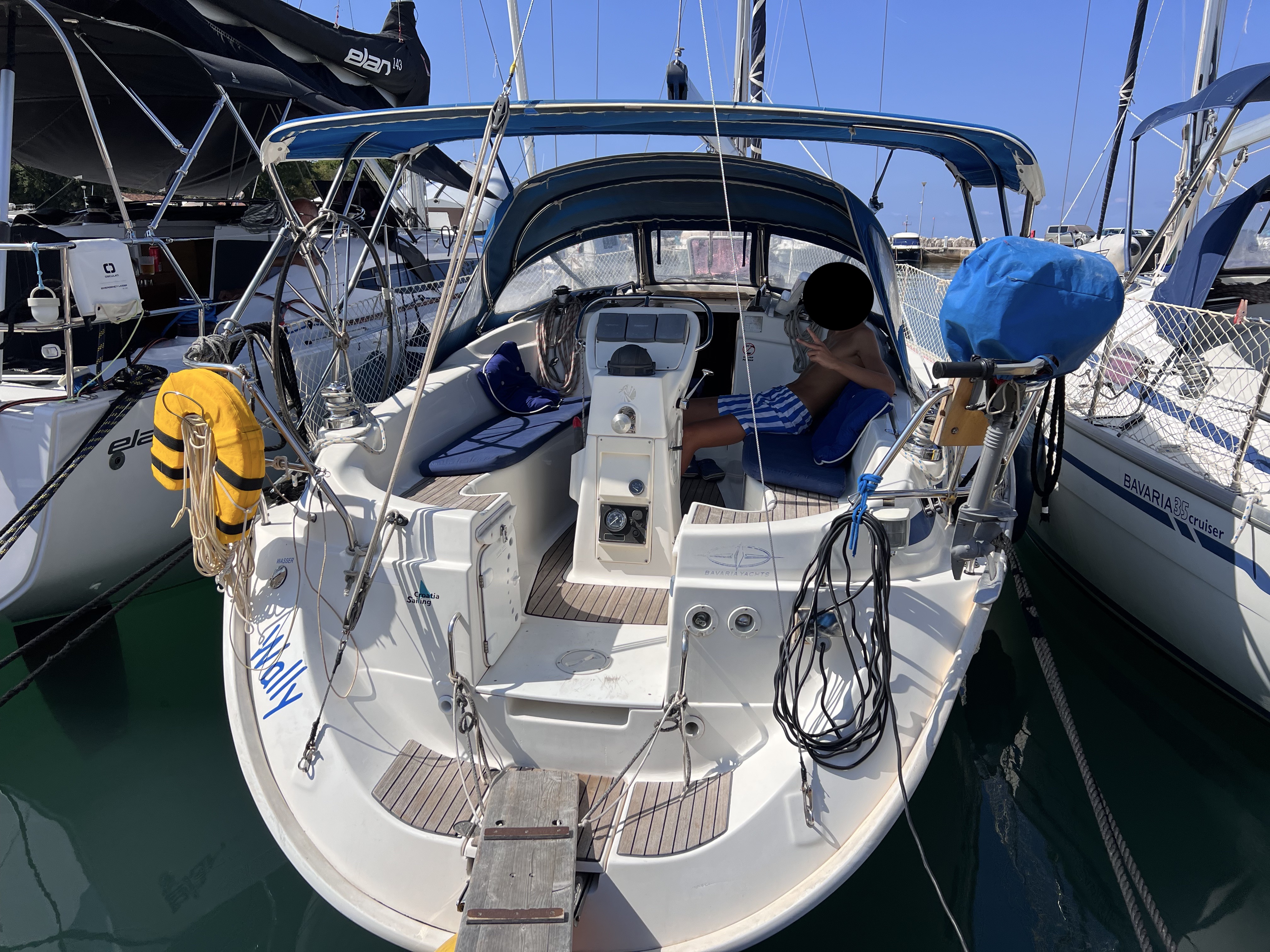 | Outside | 12V - connection, 220V shore connection, Bimini top, Boat hook, Deck cushions, Electr. anchor windlass, Fender, Mooring lines, Stern shower, Sprayhood, Water hose, Winches |