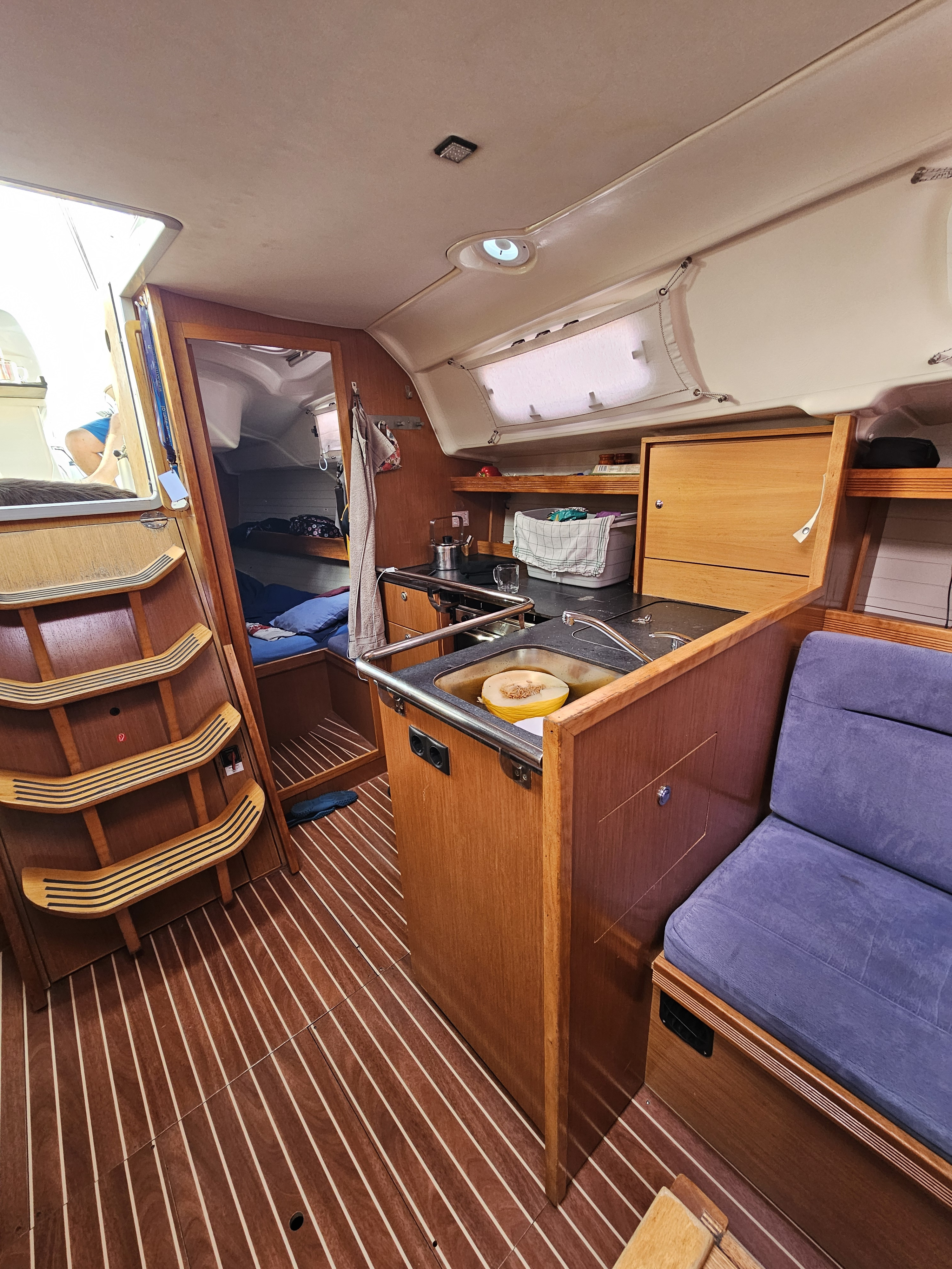 | Outside | 12V - connection, 220V shore connection, Bimini top, Boat hook, Cockpit speakers, Deck cushions, Electr. anchor windlass, Fender, Mooring lines, Stern shower, Sprayhood, Water hose, Winches |
