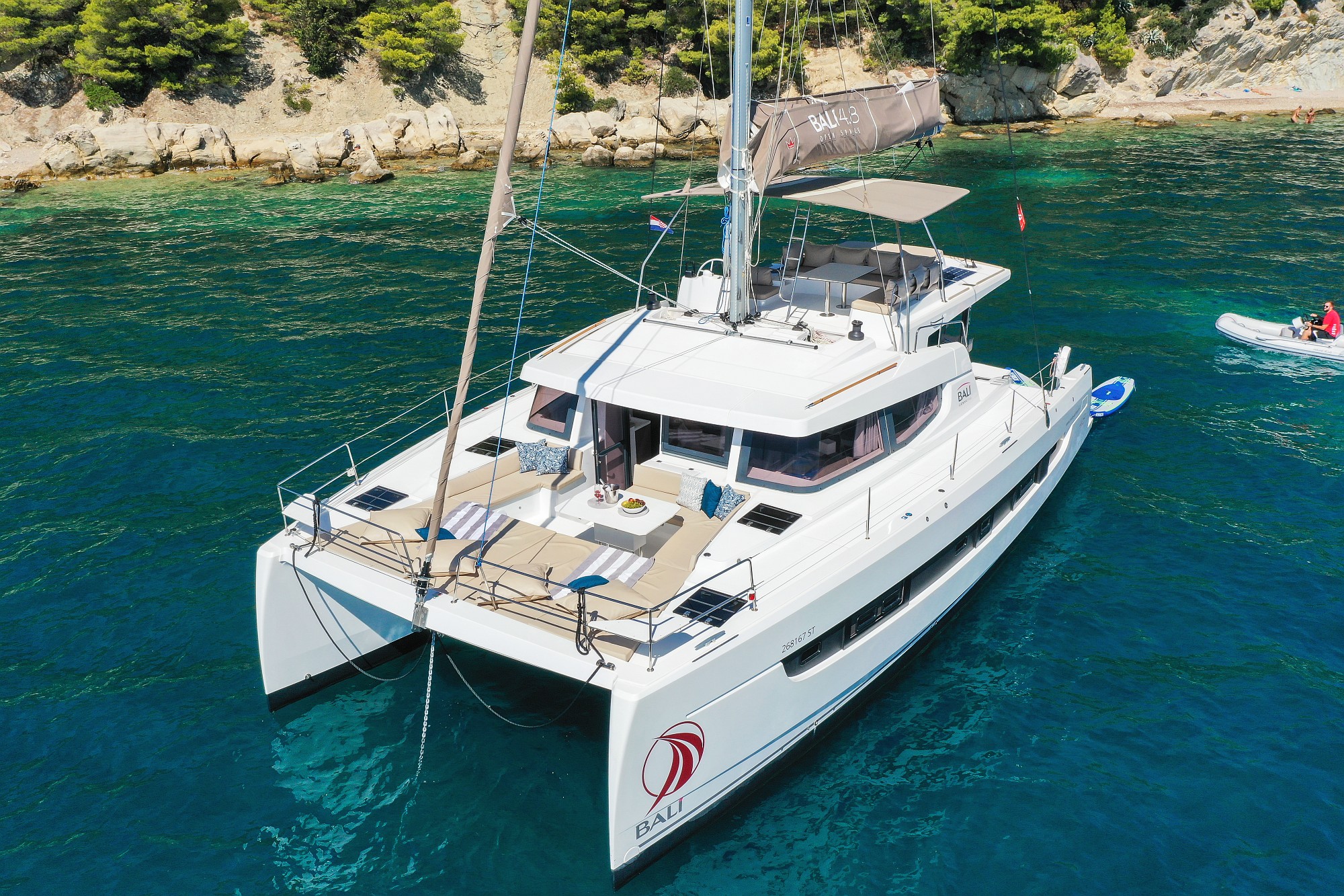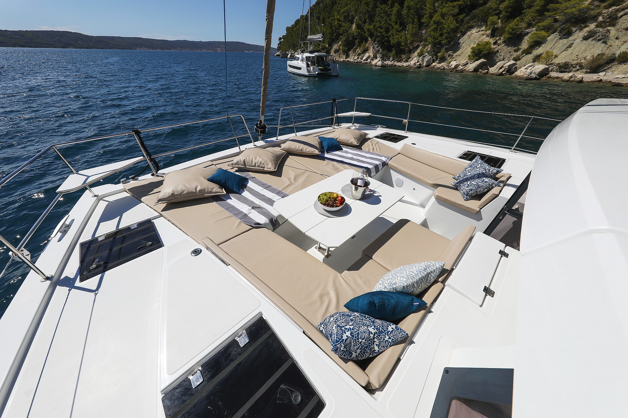 | Outside | Bathing platform, Bimini top, Cockpit shower, Cockpit speakers, Cockpit cushions, Cockpit table, Deck cushions, Flybridge, Solar panels |