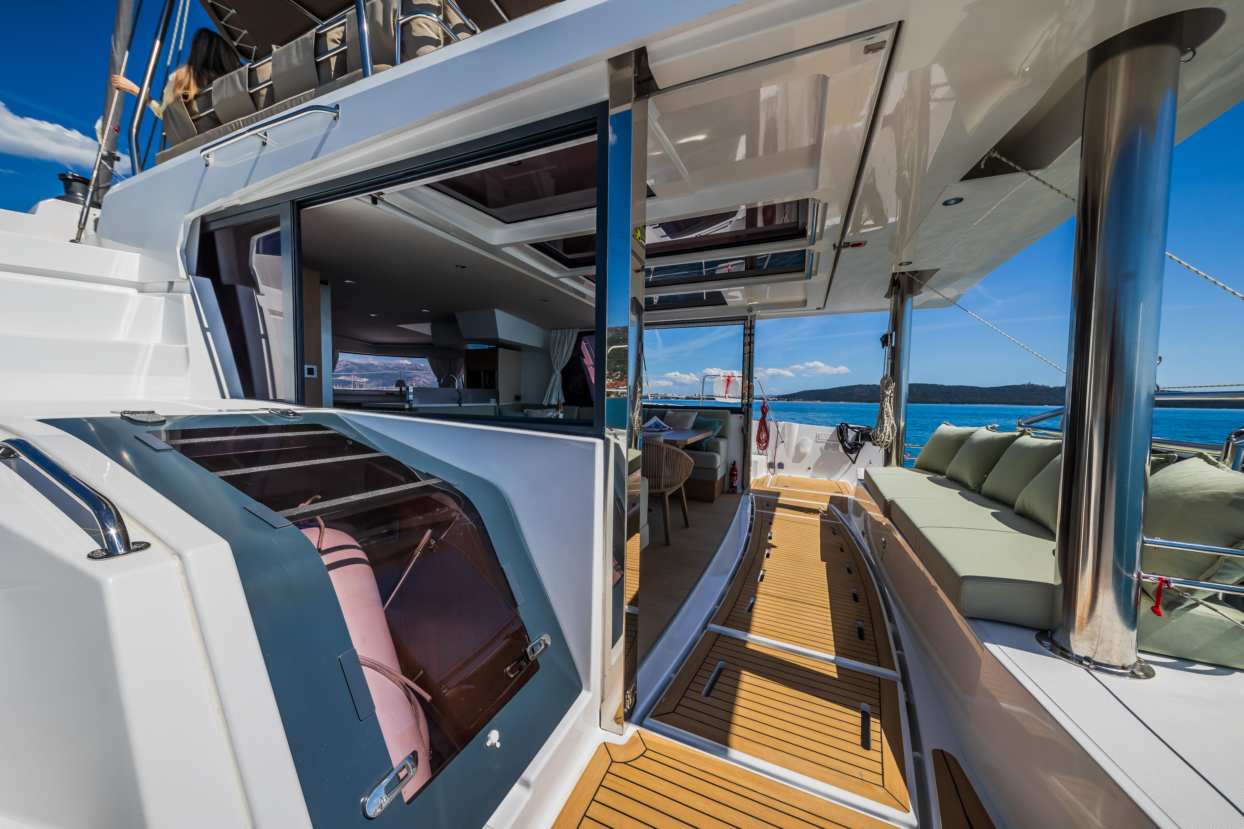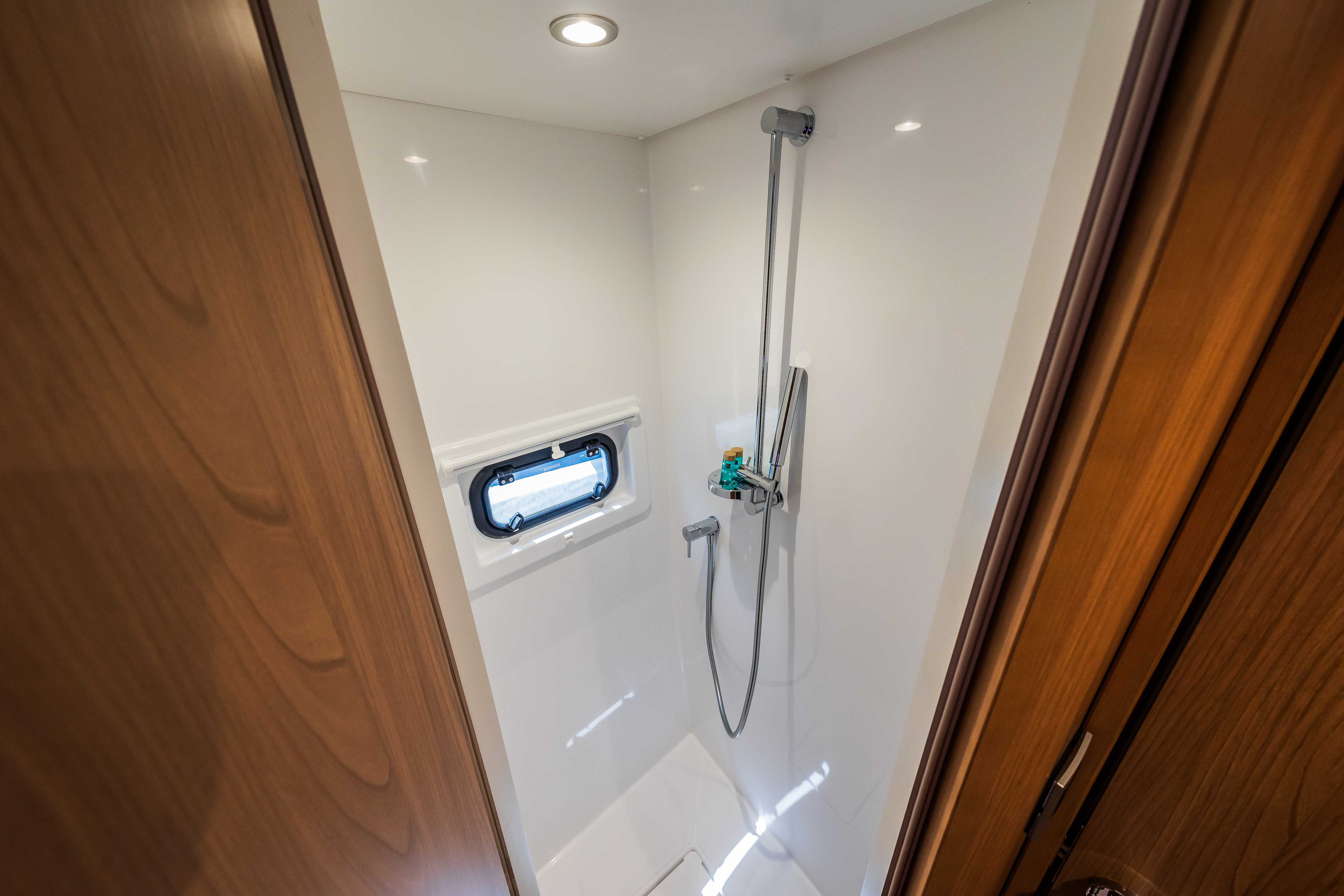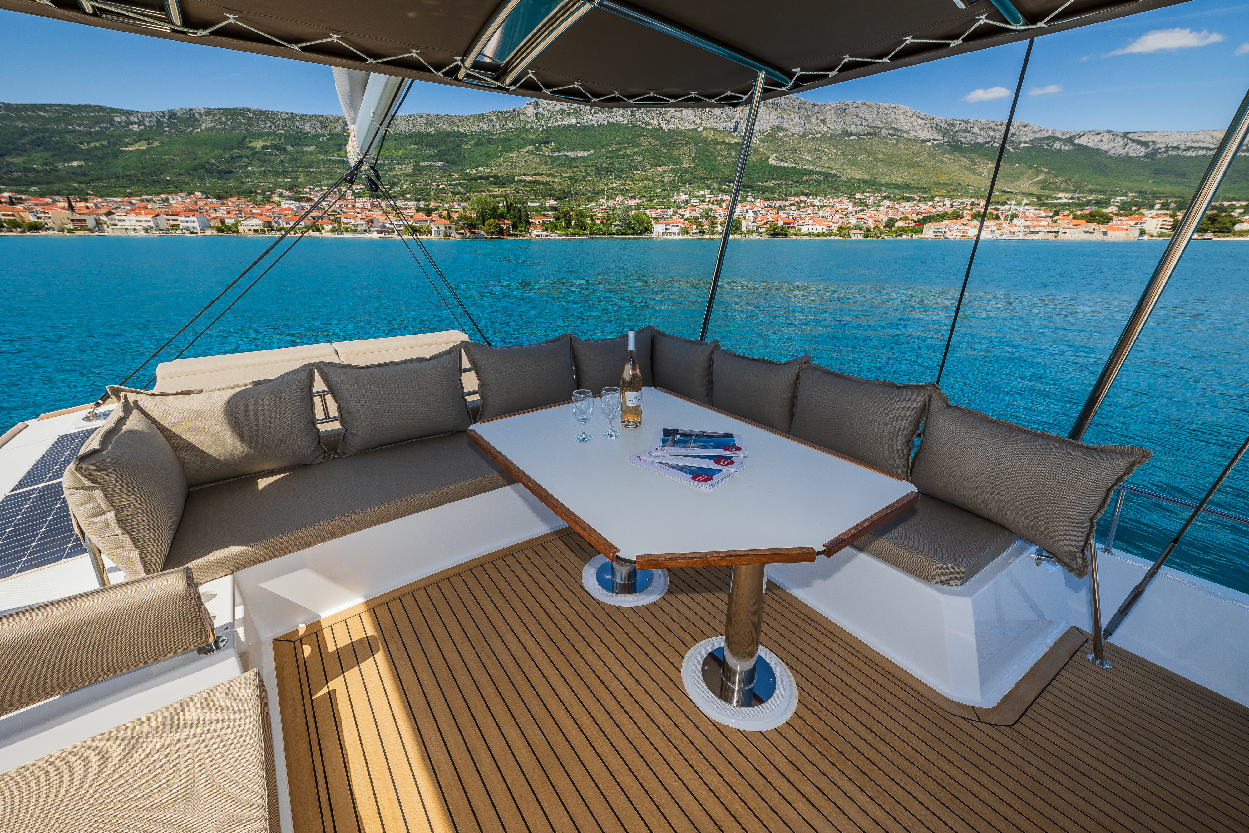 | Outside | Bathing platform, Bimini top, Cockpit shower, Cockpit speakers, Cockpit table, Deck cushions, Solar panels, Teak in cockpit |