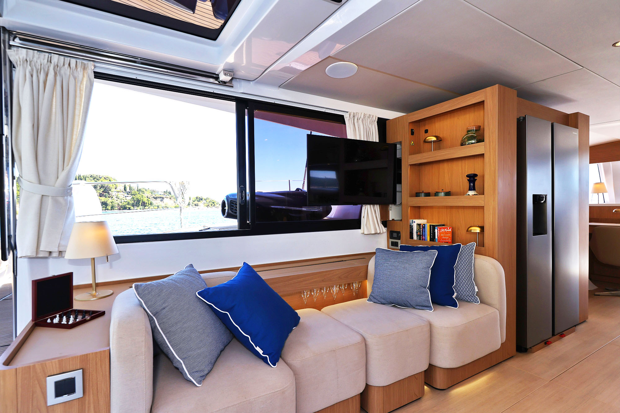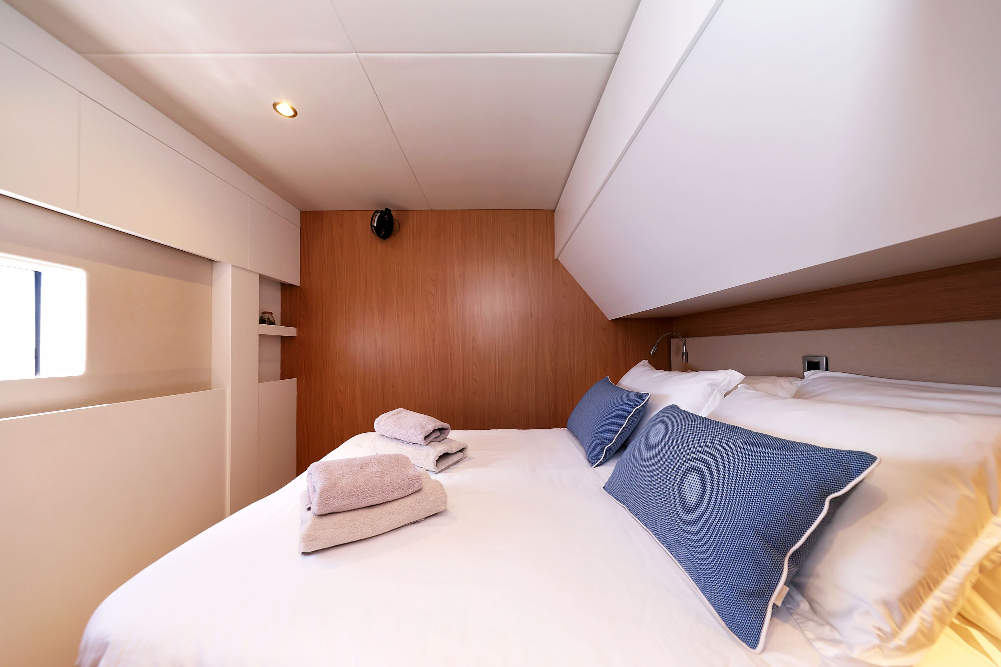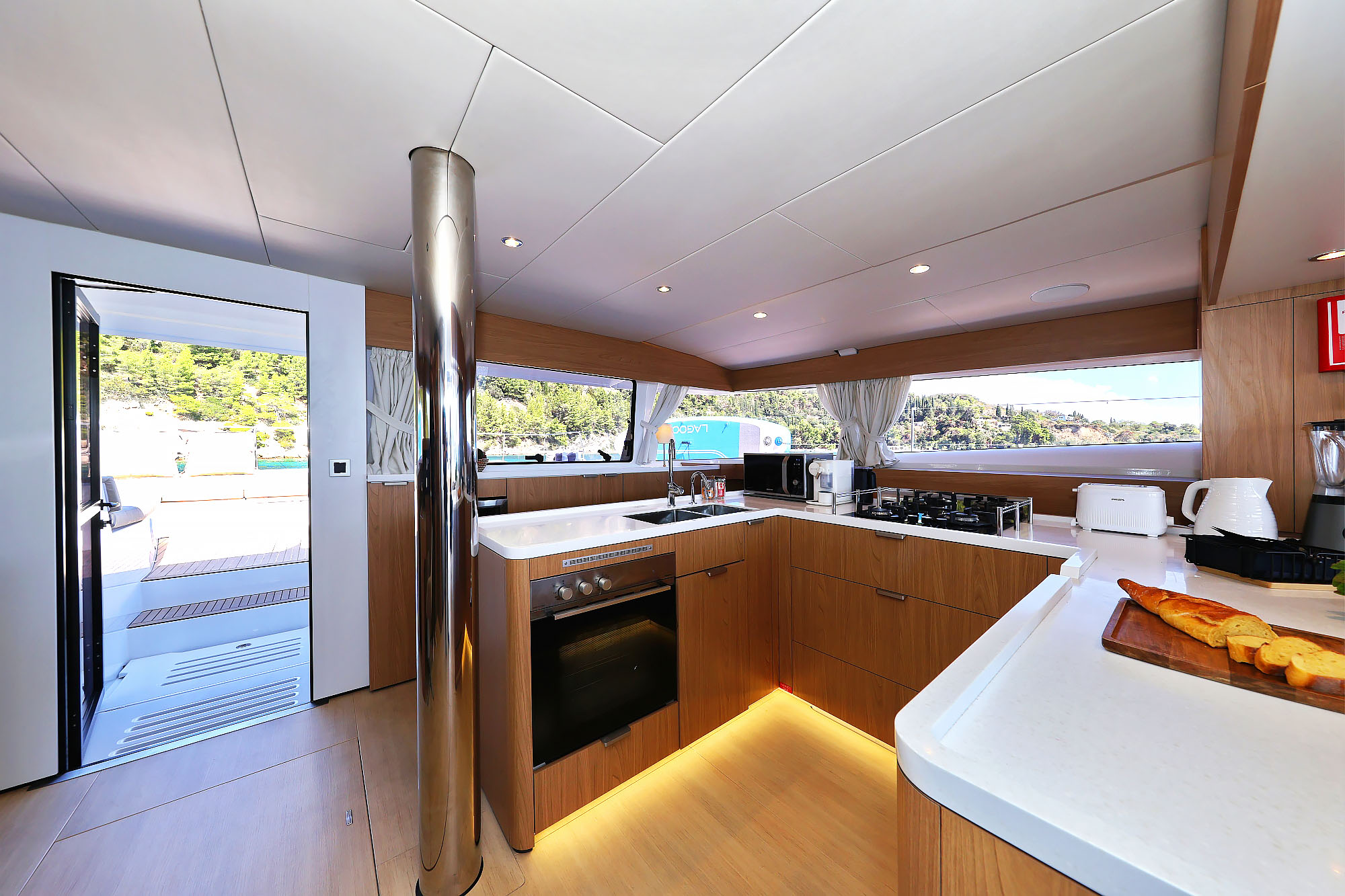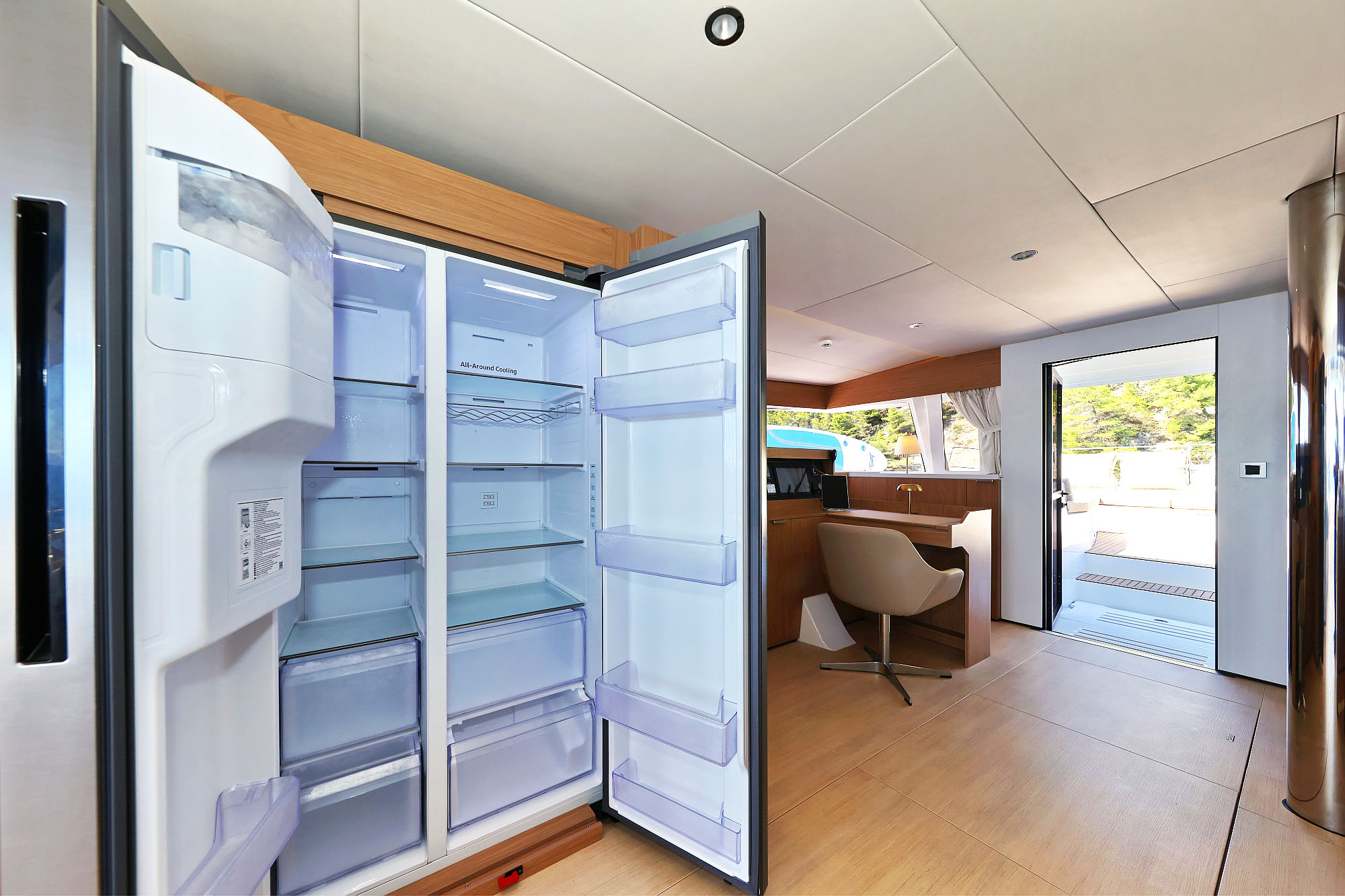 | Inside | Oven, Ice cube machine, Fusion sound system , Gas oven, Freezer, Generator, Dishwasher, Heating, Inverter 12V/220V, Coffee machine, Airconditioning (independent from shore power), fridge and freezer, Battery charger, Microwave oven, Pantry equipment, TV, fans in cabins, Warm water, Watermaker, WC (electr.), Wine fridge |