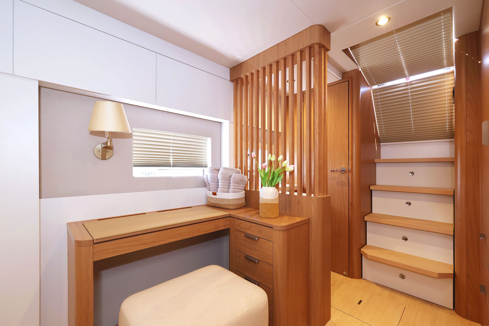 | Outside | Bathing platform (hydr.), Cockpit shower hot/cold, Cockpit speakers, Cockpit cushions, Cockpit table, Davits, BBQ, Hardtop, Refrigerator on flybridge, Cushions for flybridge, Solar panels, Teak on Flybridge, Teak in cockpit, Teak deck, LED submarine lights |