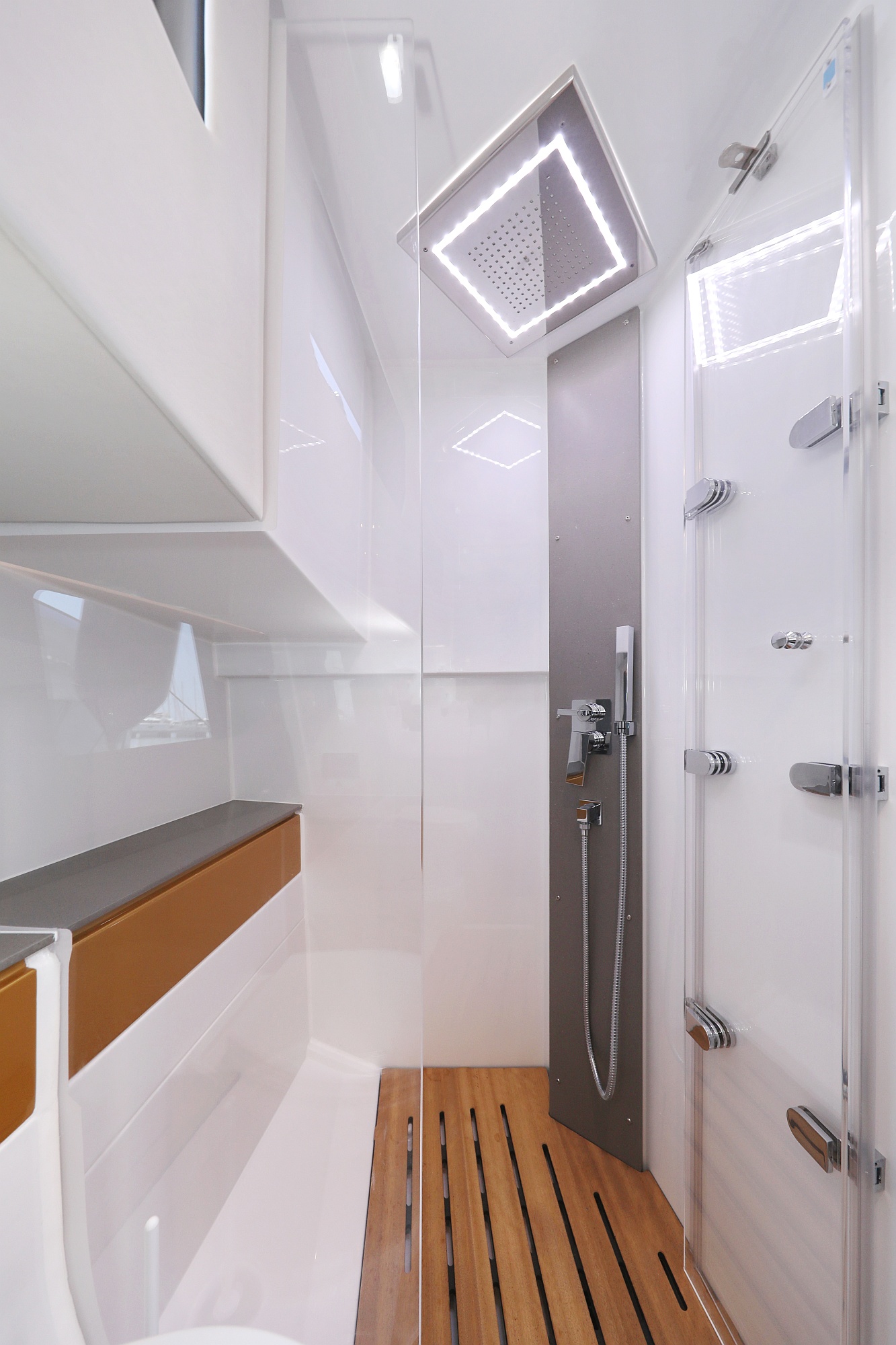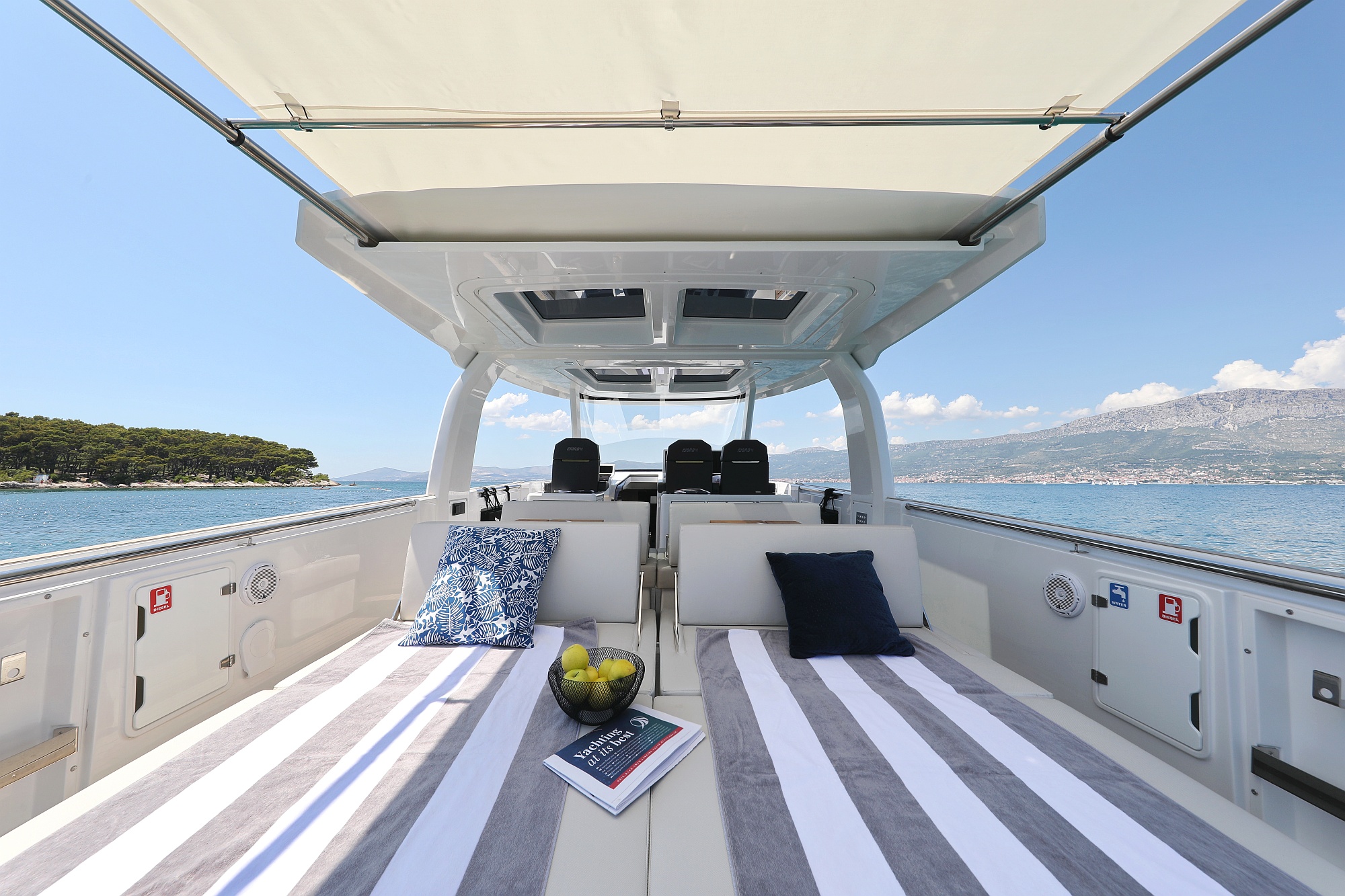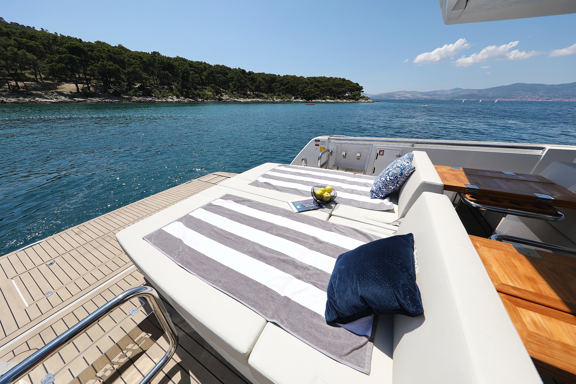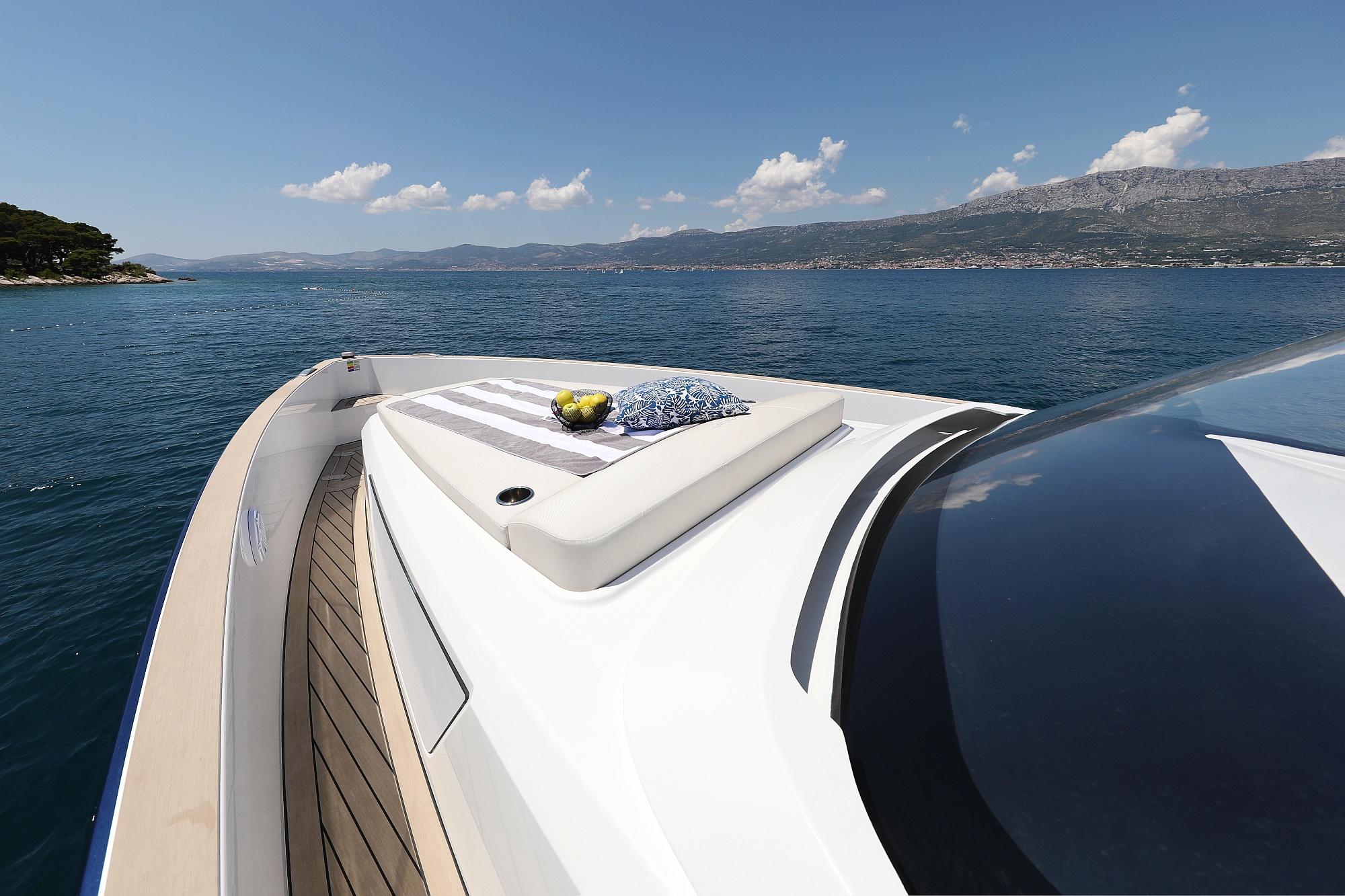 | Outside | Bathing platform (hydr.), Bimini top, Cockpit shower, Electr. anchor windlass, Sun deck, Teak on bathing platform, Teak in cockpit, Teak deck, LED submarine lights |