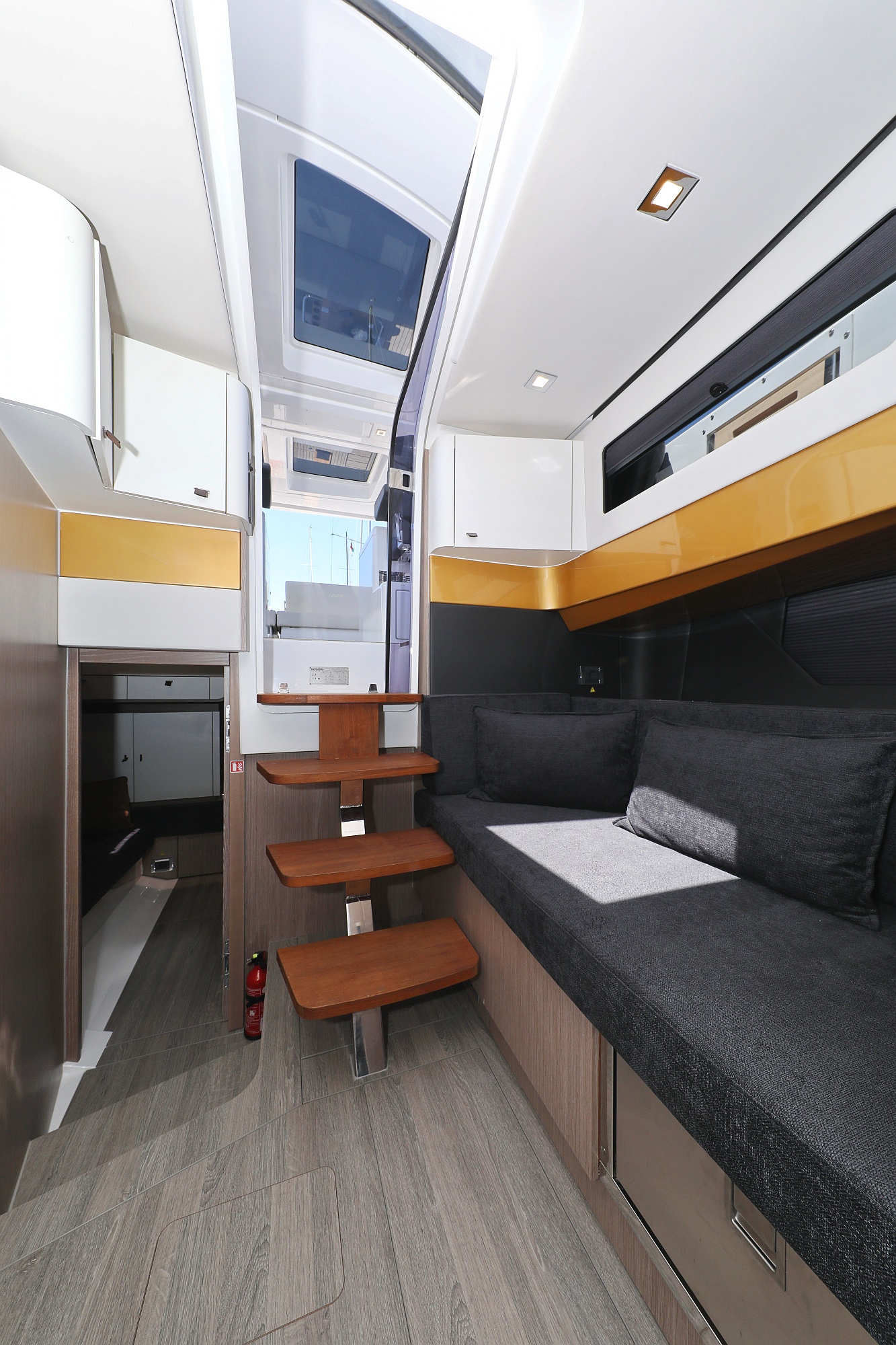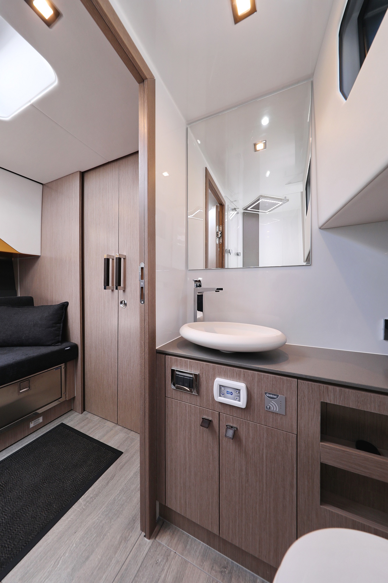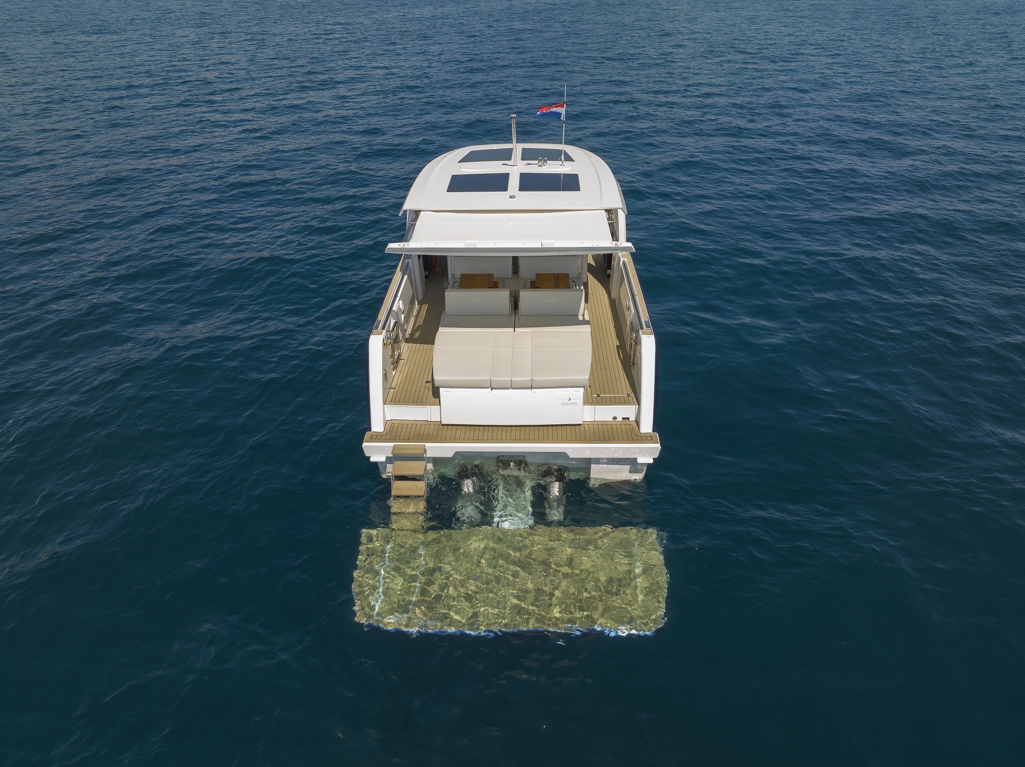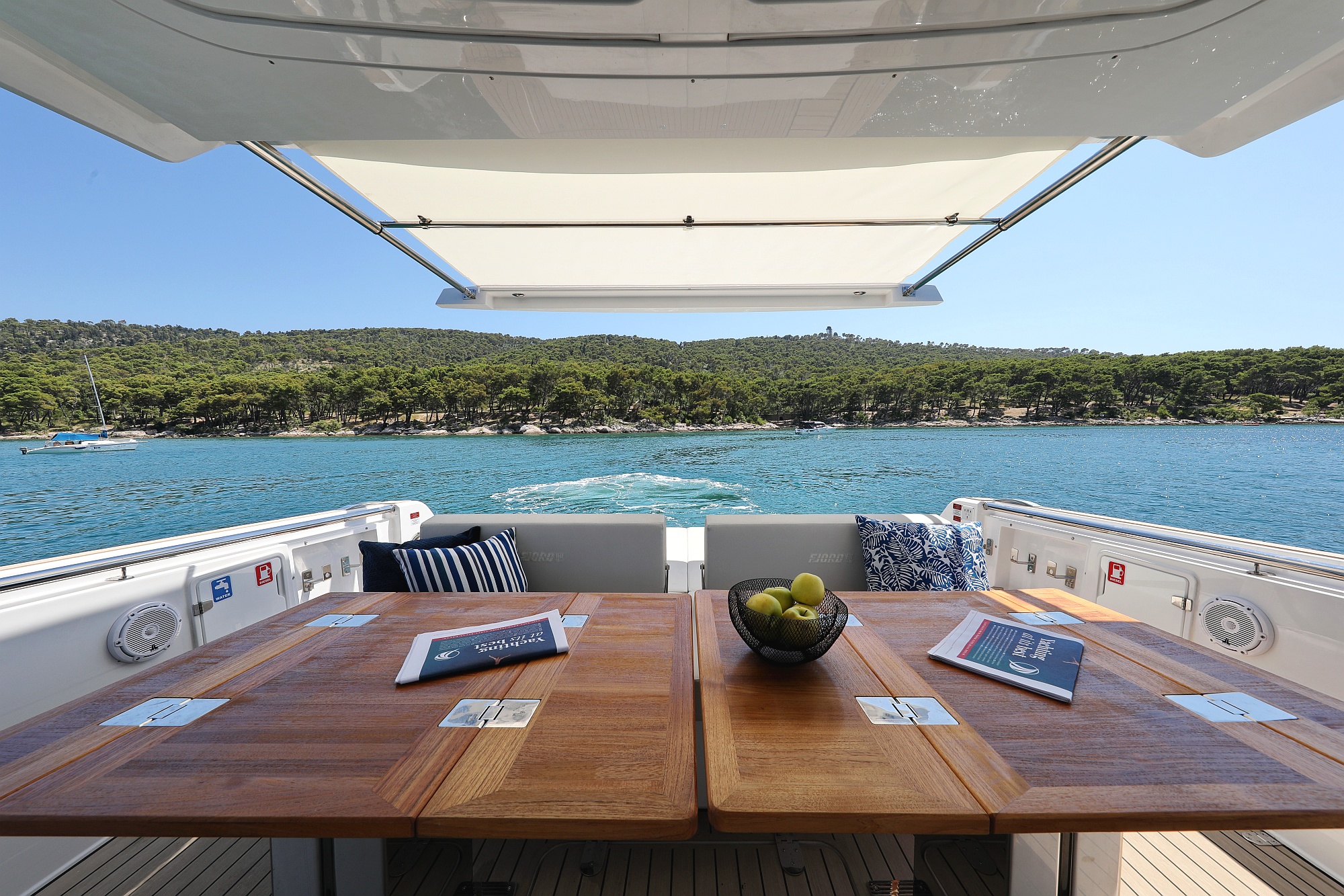 | Outside | Bathing platform (hydr.), Bimini top, Cockpit shower, Electr. anchor windlass, Sun deck, Teak on bathing platform, Teak in cockpit, Teak deck, LED submarine lights |
