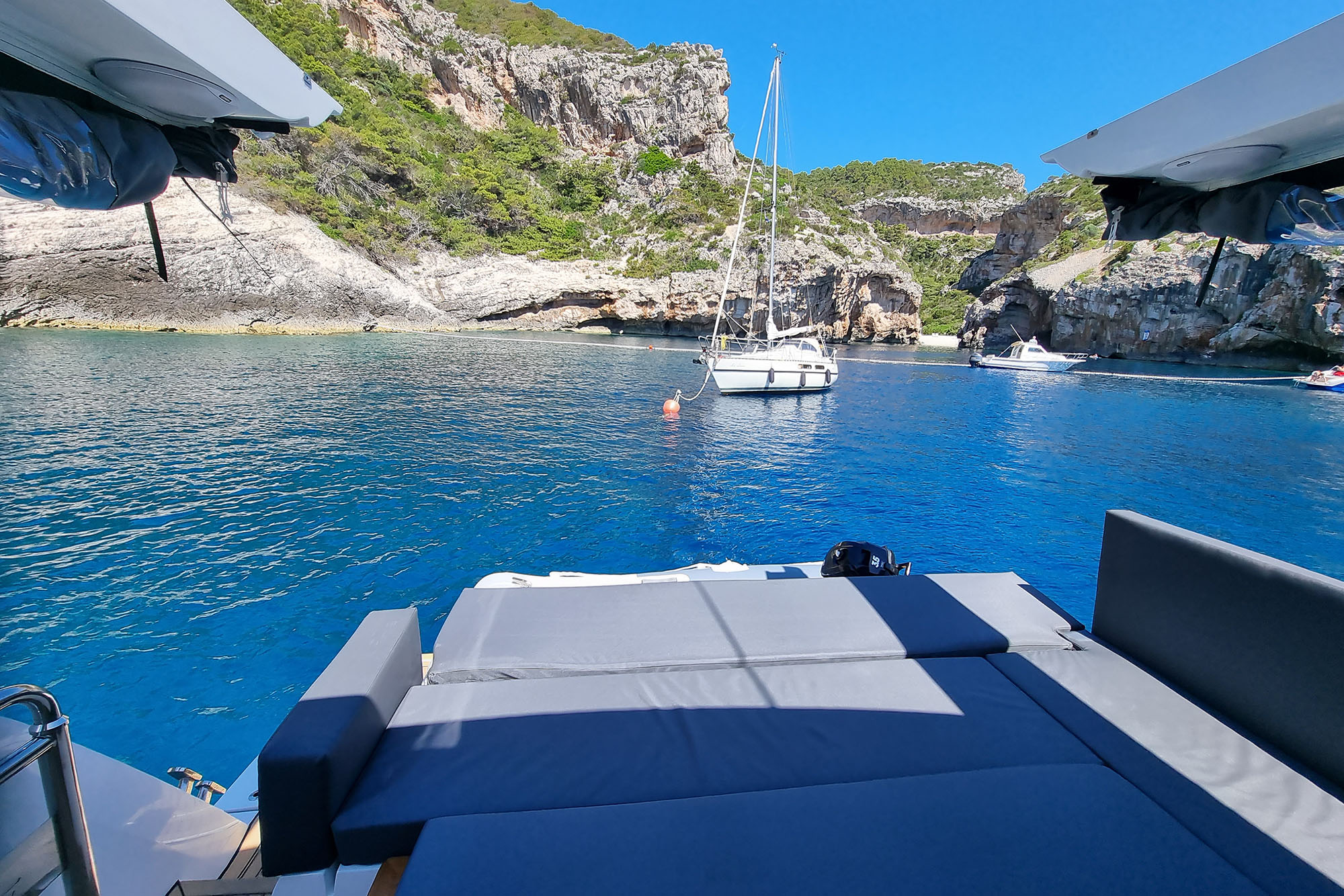 | Outside | Bathing platform, Bathing platform (hydr.), Cockpit shower, Cockpit speakers, Electr. anchor windlass, Awning, Teak in cockpit, LED submarine lights |
