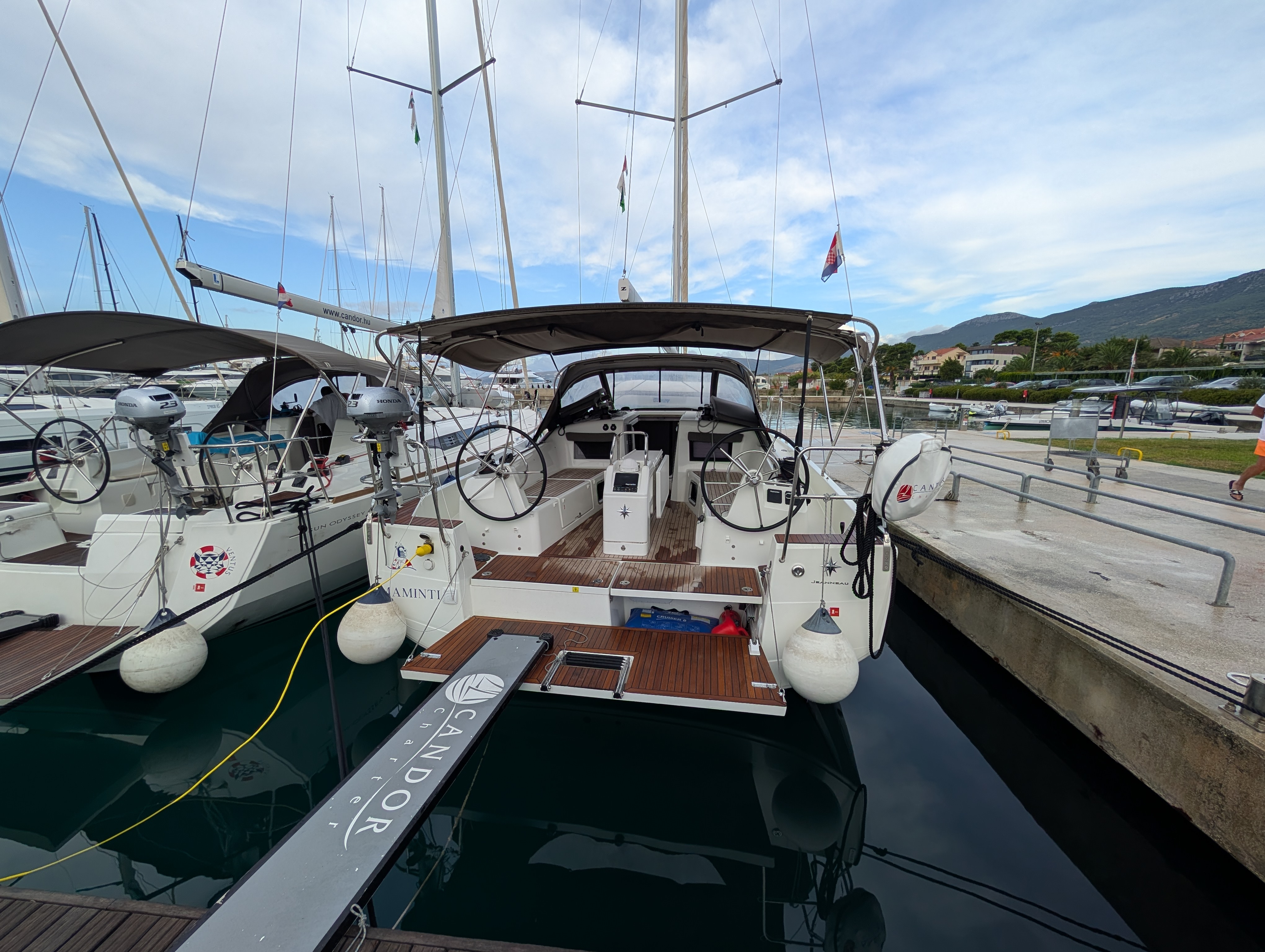 | Outside | 220V shore connection, Anchor with chain, Bathing ladder, Bimini top, Cockpit shower, Cockpit speakers, Electr. anchor windlass, Mooring lines, Gangway, Sprayhood, Teak in cockpit, Water hose, Windex |