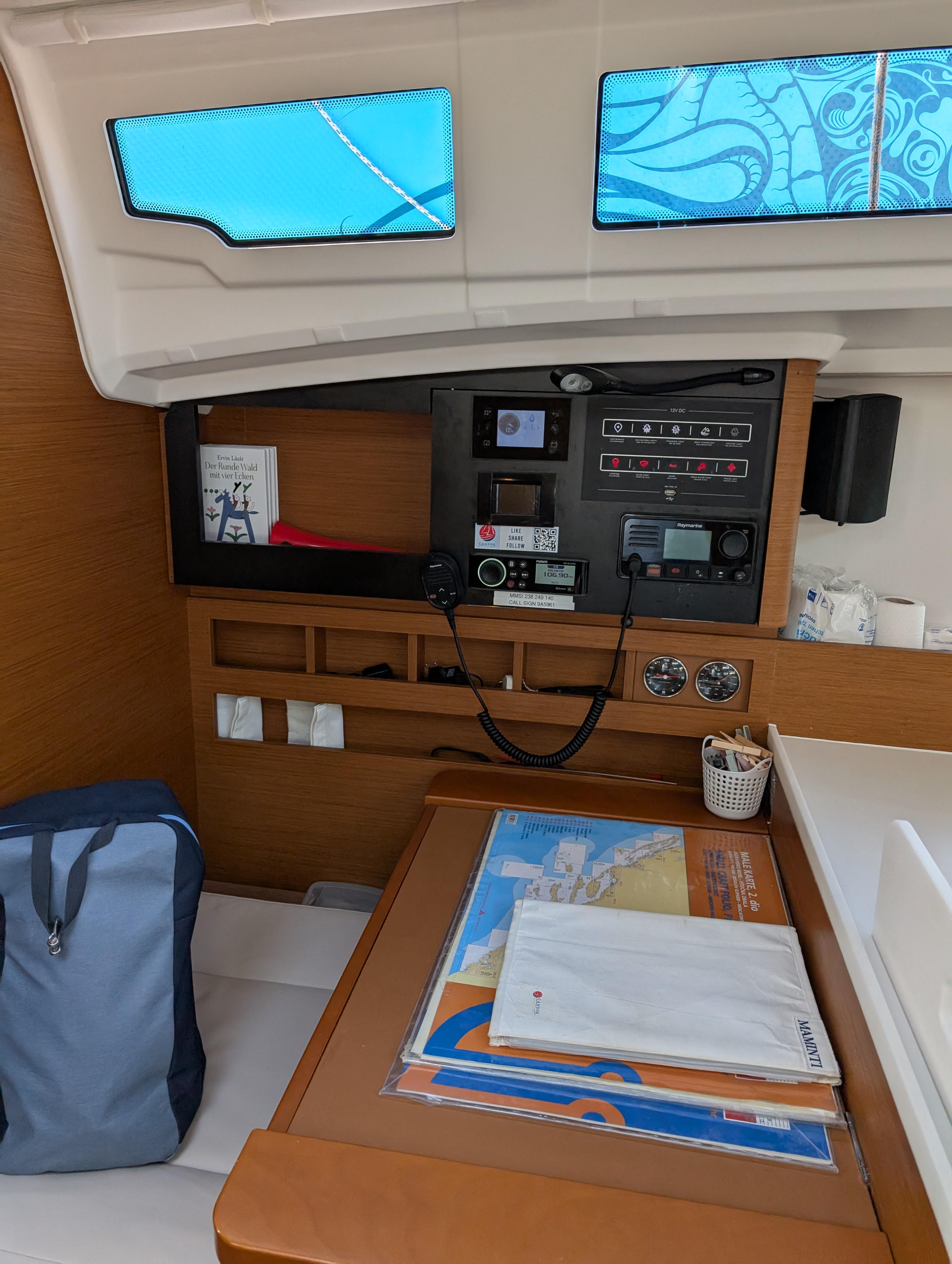 | Navigation | Barometer, Echo sounder, GPS with chart plotter in cockpit, Harbour books, Hand bearing compass, Compass, Navigation set, Nautical charts, Log, Anemometer |
