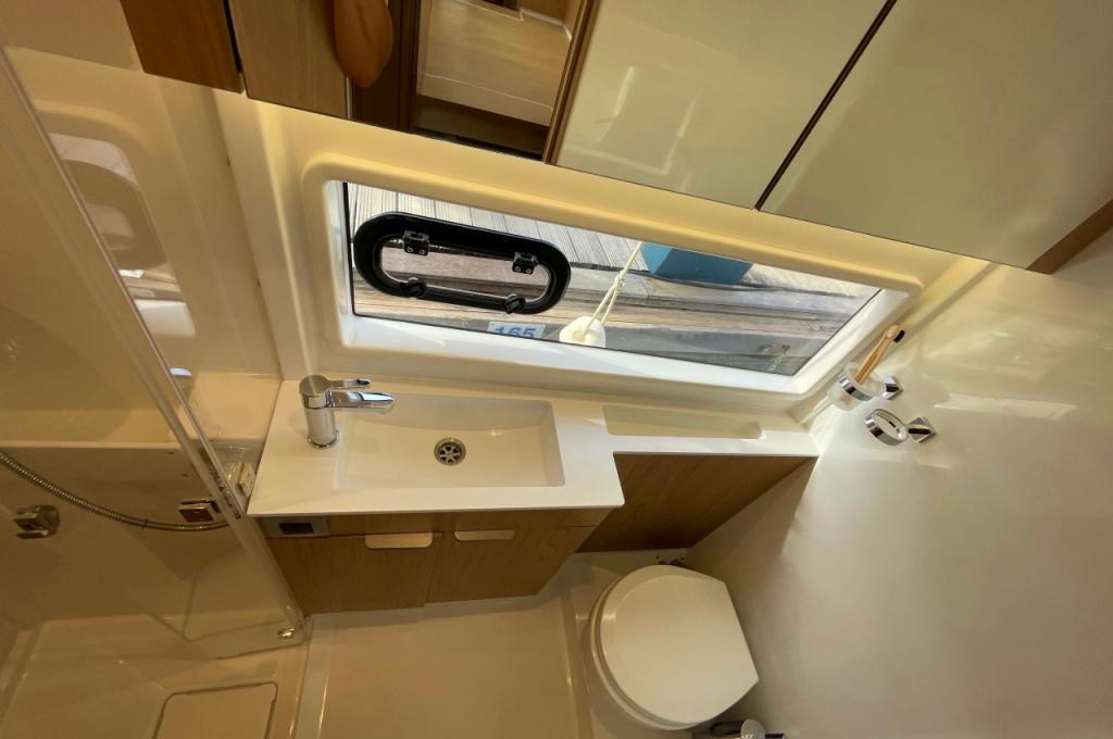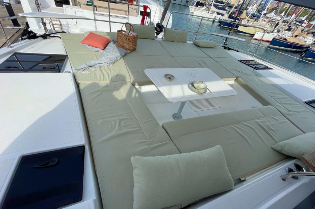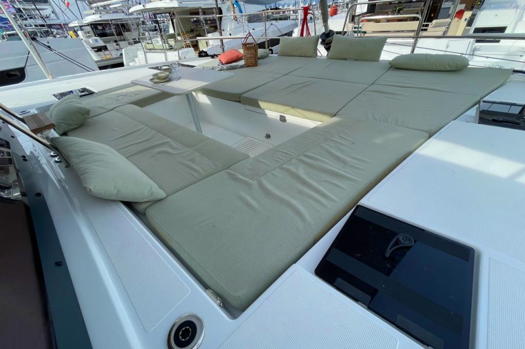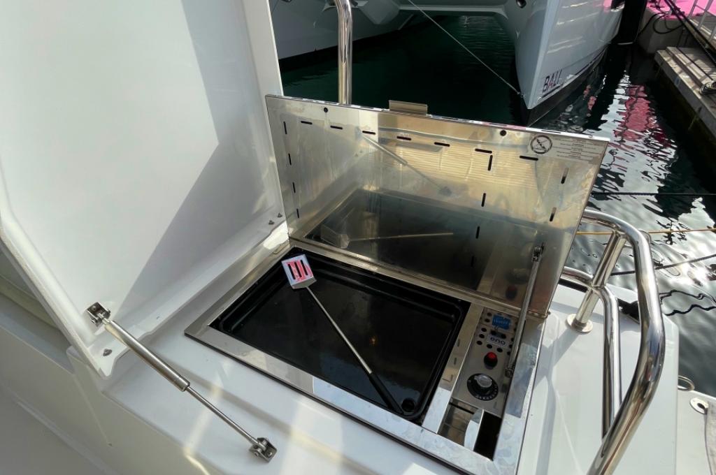 | Outside | 12V - connection, Anchor chain counter, Bathing ladder, Cockpit shower, Cockpit speakers, Cockpit cushions, Cockpit table, Davits, Deck lights, Deck cushions, Electr. anchor windlass, electr. winch, Folding propeller, BBQ, Solar panels, Sun deck, LED submarine lights |