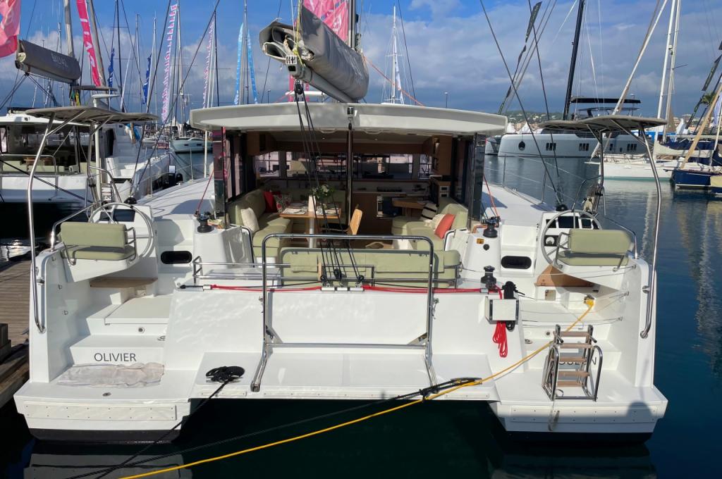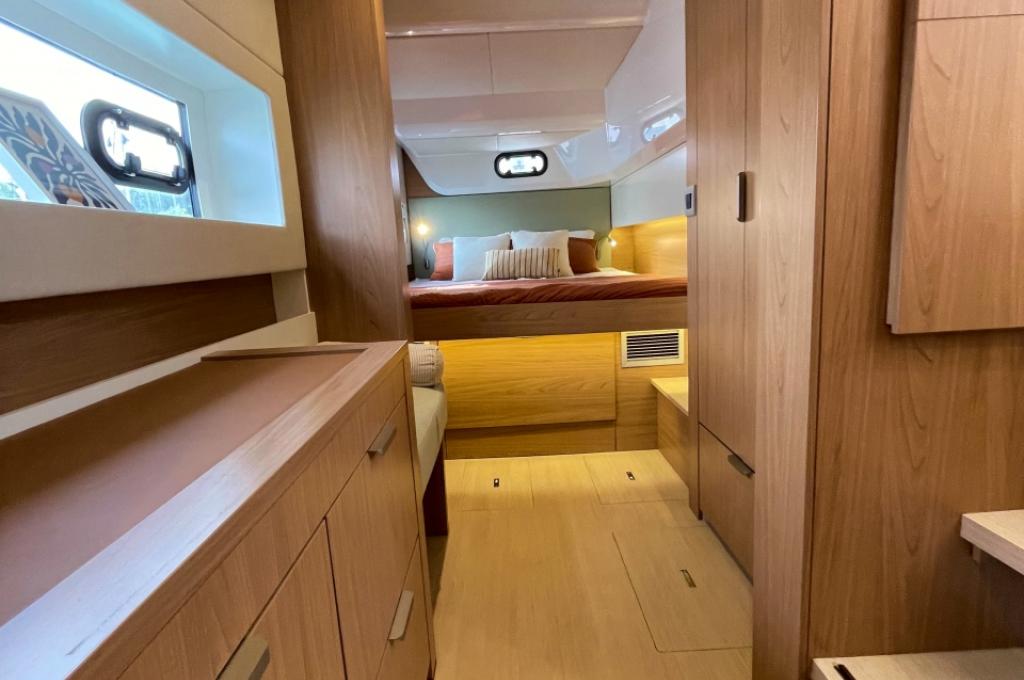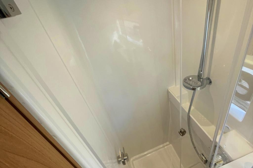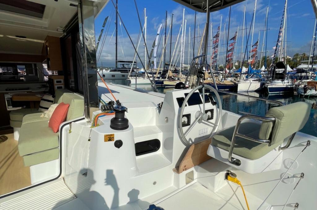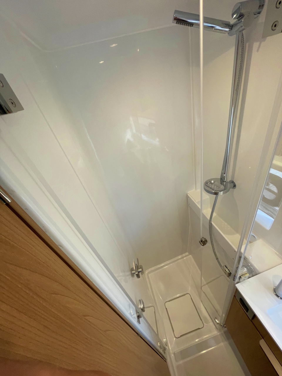 | Outside | 12V - connection, Anchor chain counter, Bathing ladder, Cockpit shower, Cockpit speakers, Cockpit cushions, Cockpit table, Davits, Deck lights, Deck cushions, Electr. anchor windlass, electr. winch, Folding propeller, BBQ, Solar panels, Sun deck, LED submarine lights |