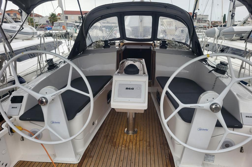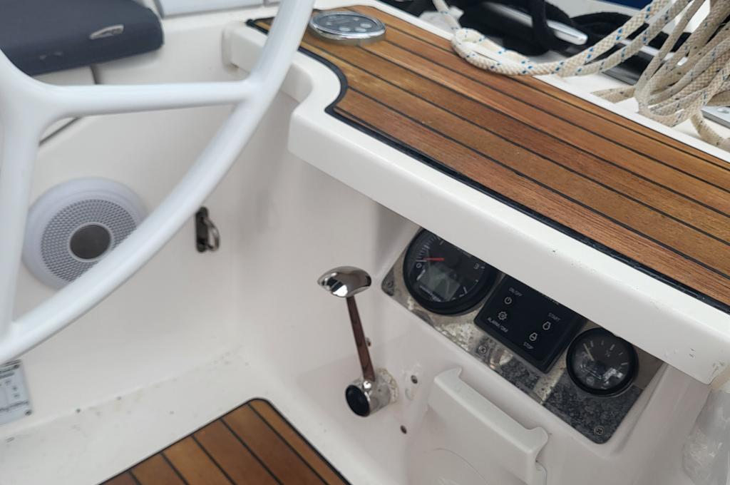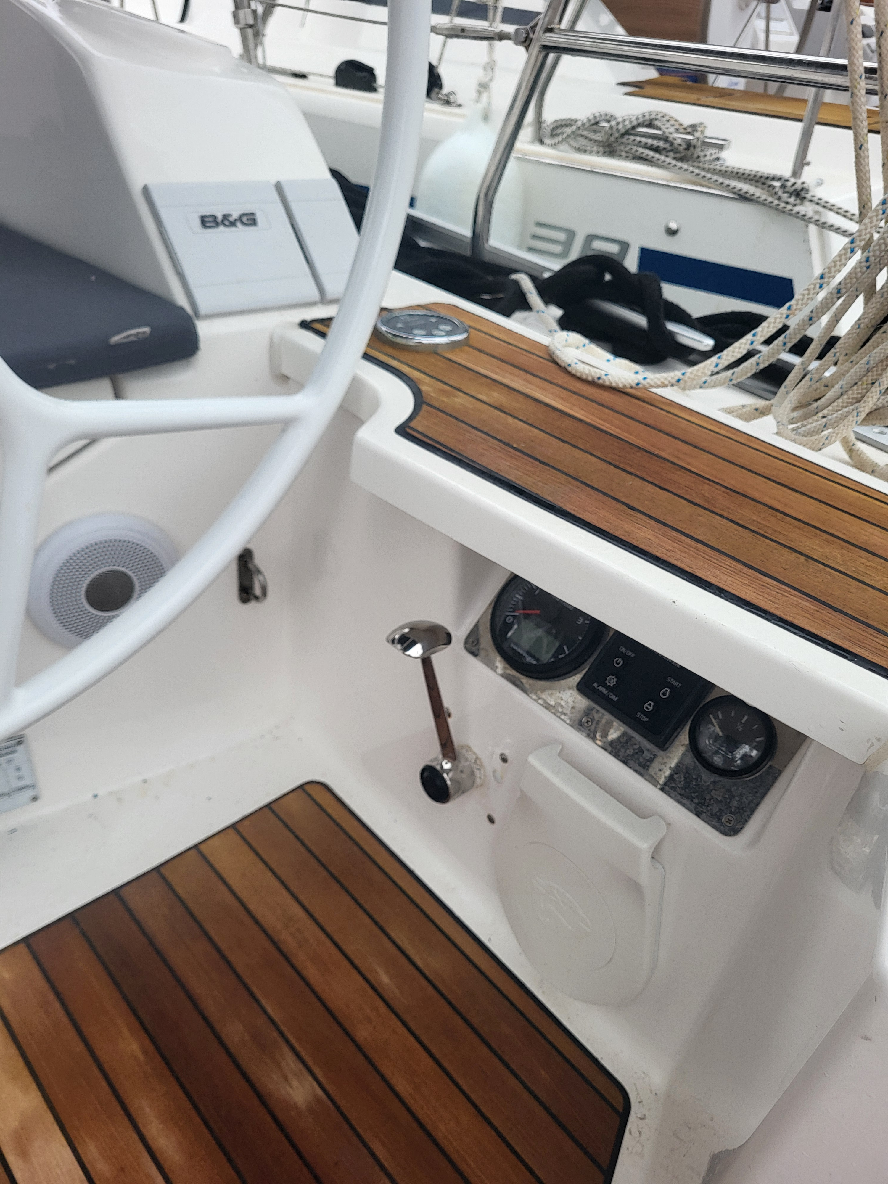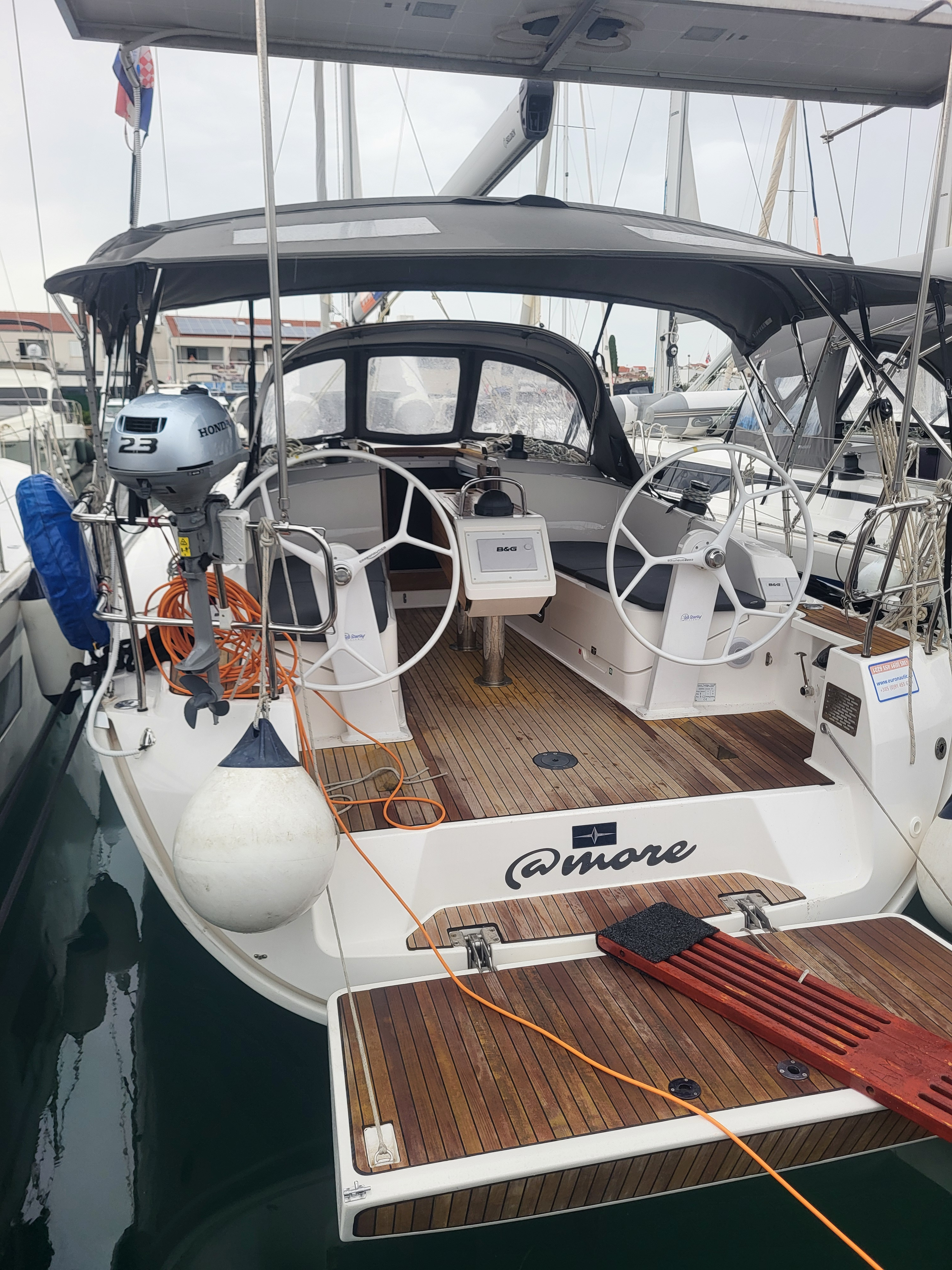 | Outside | 220V shore connection, Anchor with chain, Bimini top, Cockpit shower, Cockpit speakers, Cockpit cushions, Cockpit table, Electr. anchor windlass, Fender, Mooring lines, Solar panels, Sprayhood, Teak in cockpit, Drift anchor , Windex |