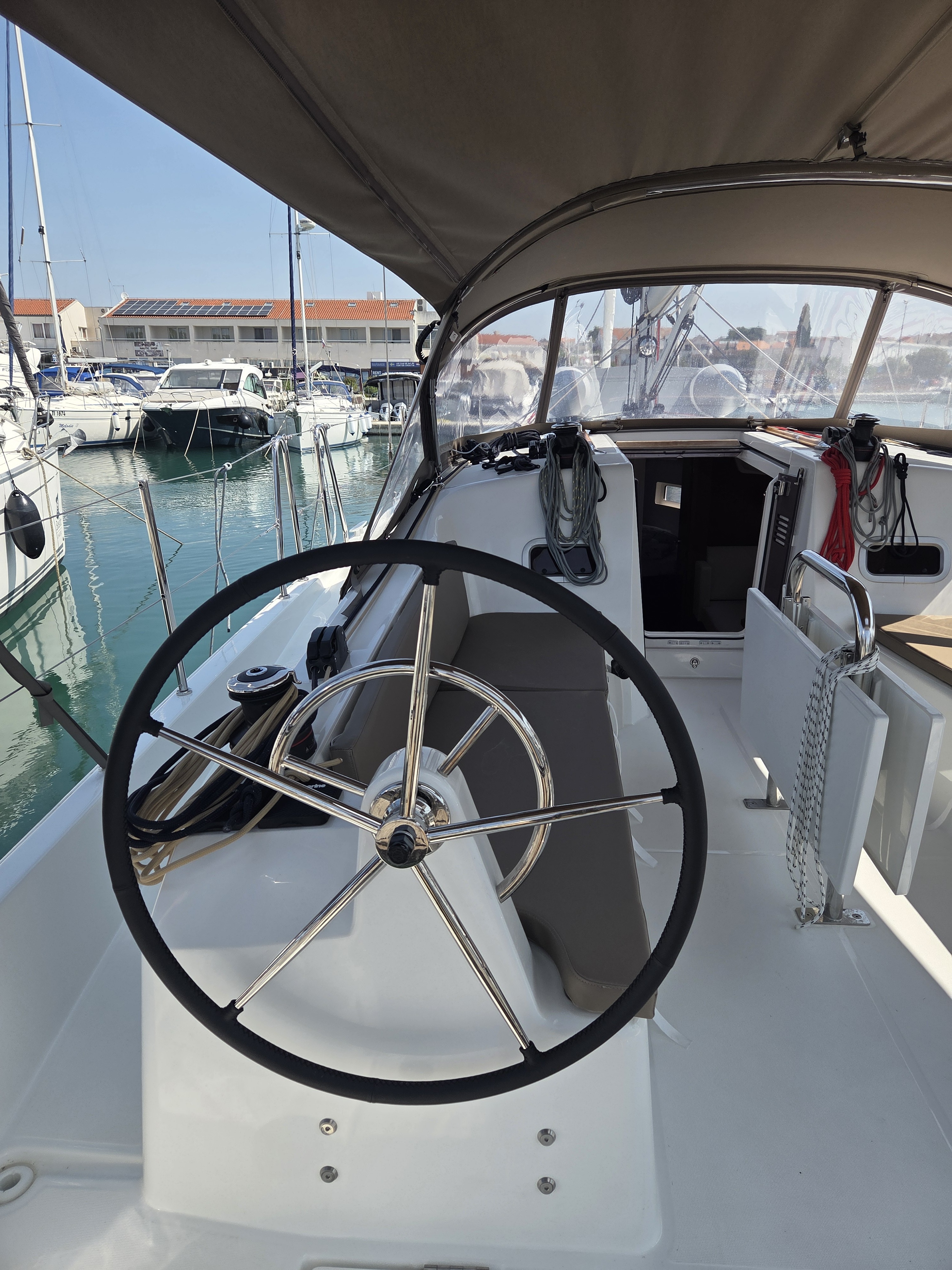 | Outside | Anchor chain counter, Bathing ladder, Bimini top, Cockpit shower, Cockpit speakers, Cockpit cushions, Electr. anchor windlass, Anchor winch remote control, Gangway, Solar panels, Sprayhood, Windex, Winches |
