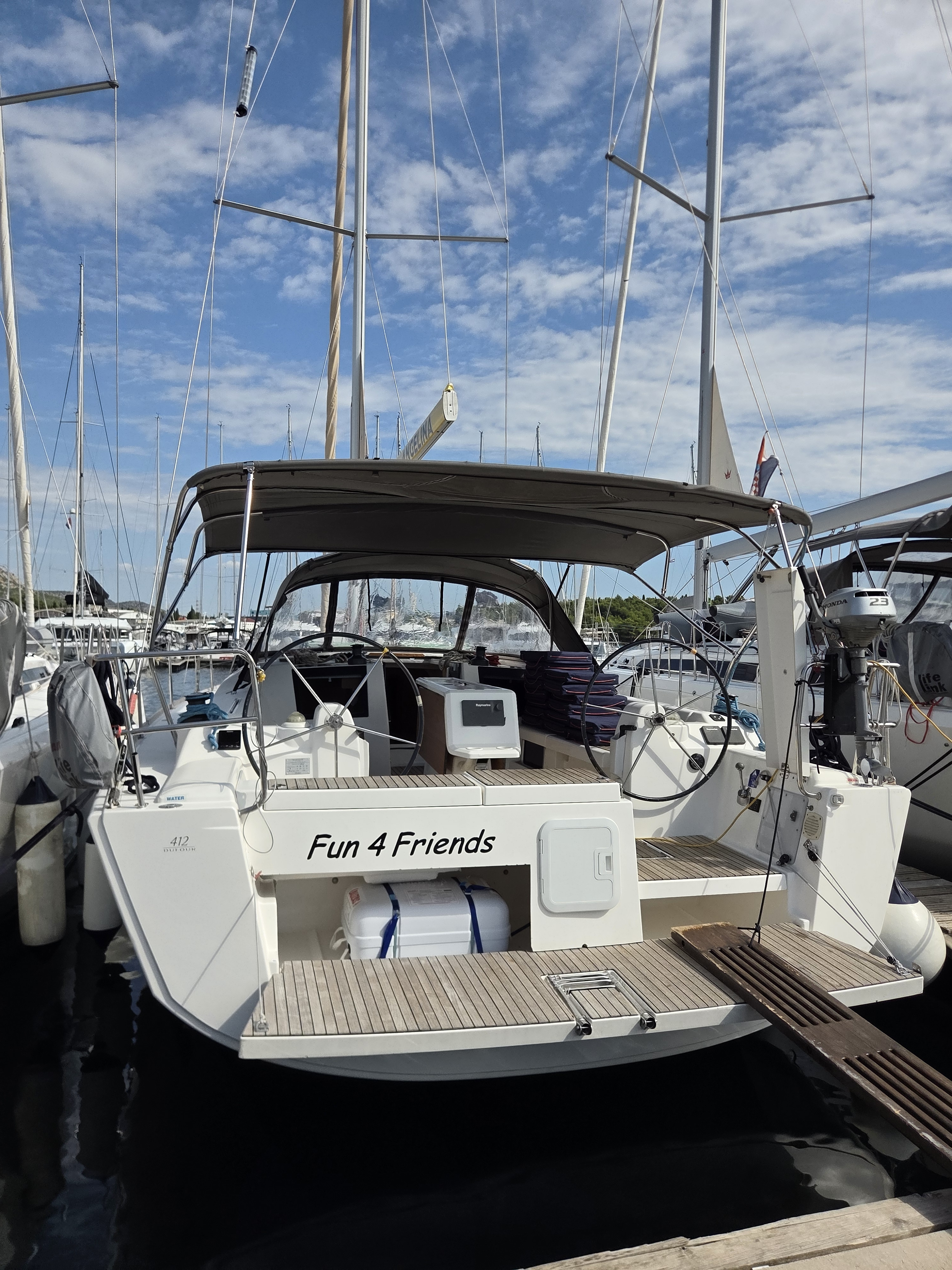 | Outside | Anchor with chain, Bathing platform, Bimini top, Boat hook, Cockpit shower, Cockpit speakers, Cockpit cushions, Cockpit table, Electr. anchor windlass, Fender, Mooring lines, Gangway, BBQ, Ball fender, Solar panels, Sprayhood, Sink on cockpit , Teak in cockpit, Water hose, Winches |