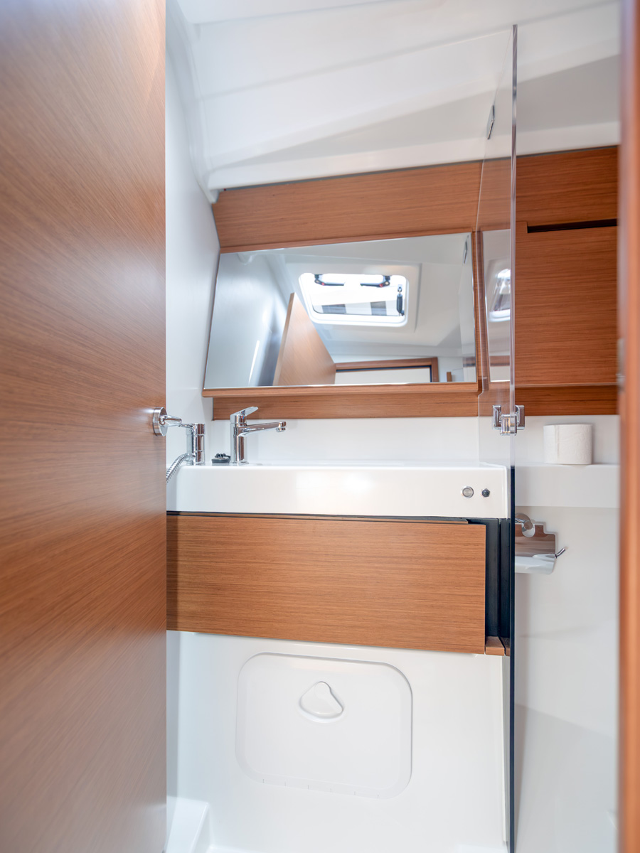 | Outside | 12V - connection, 220V shore connection, Anchor with chain, Bathing ladder, Bathing platform, Cockpit shower, Cockpit speakers, Cockpit cushions, Cockpit table, Deck lights, Electr. anchor windlass, Solar panels, Sprayhood, Teak in cockpit, Windex |