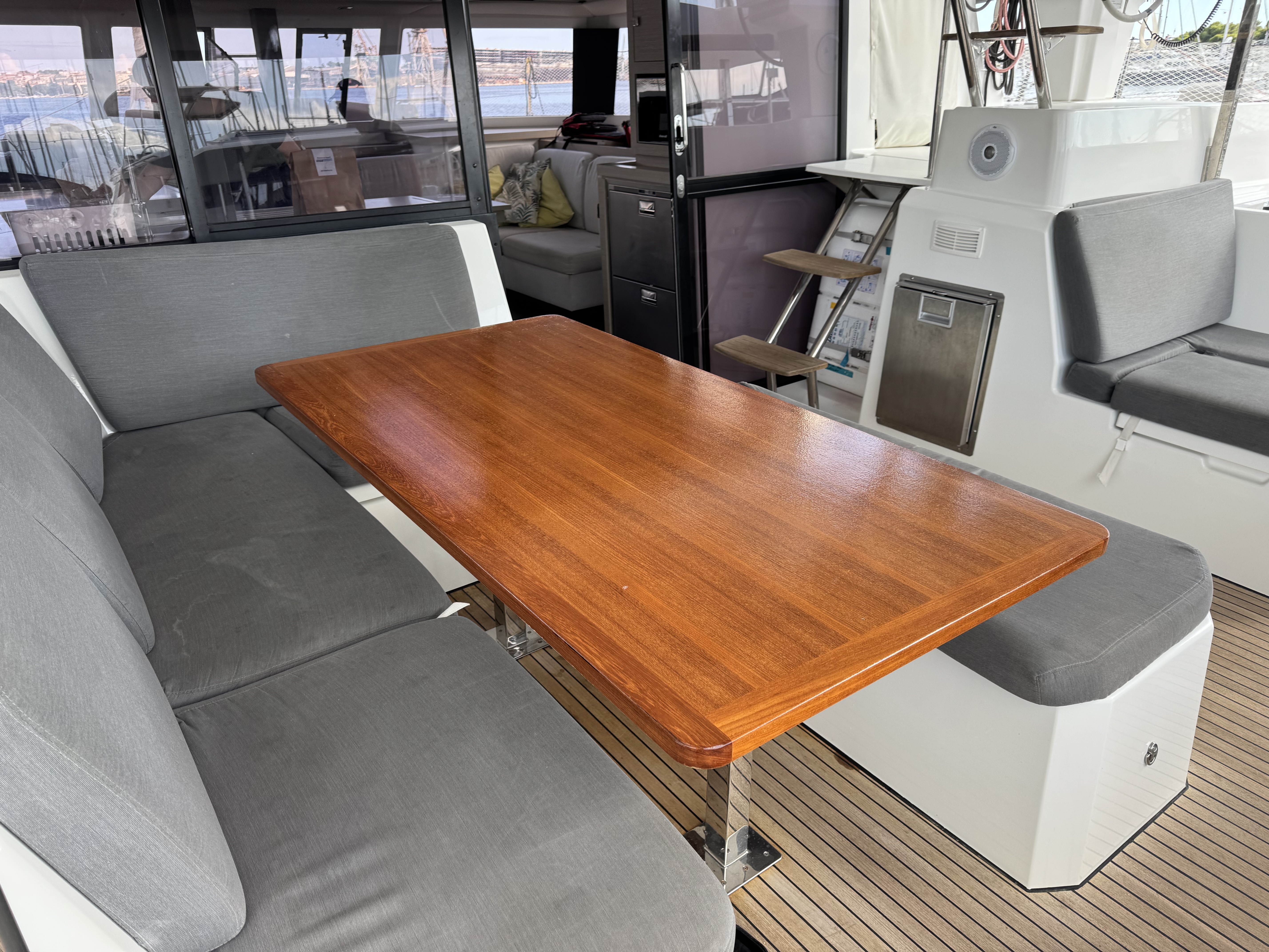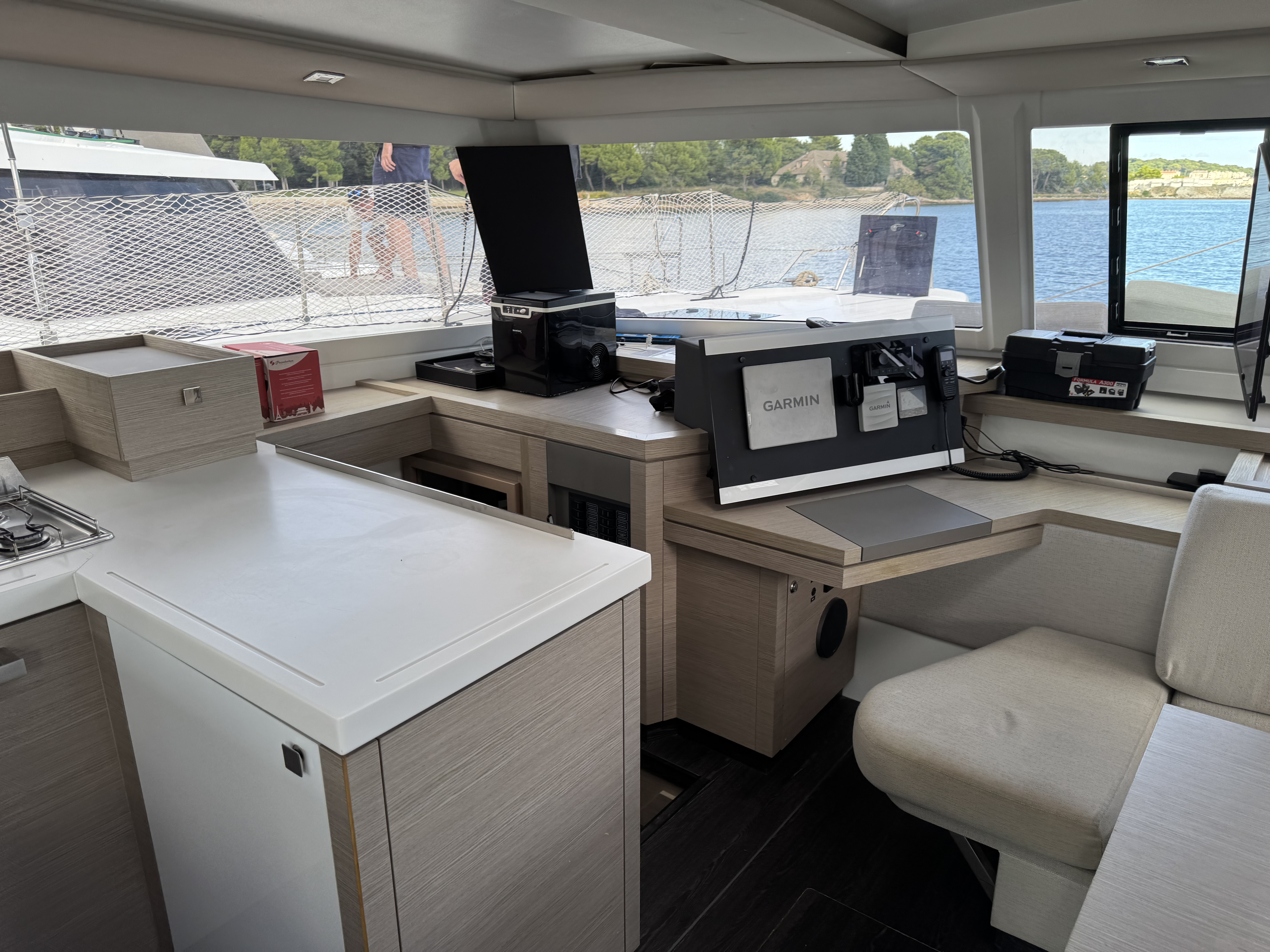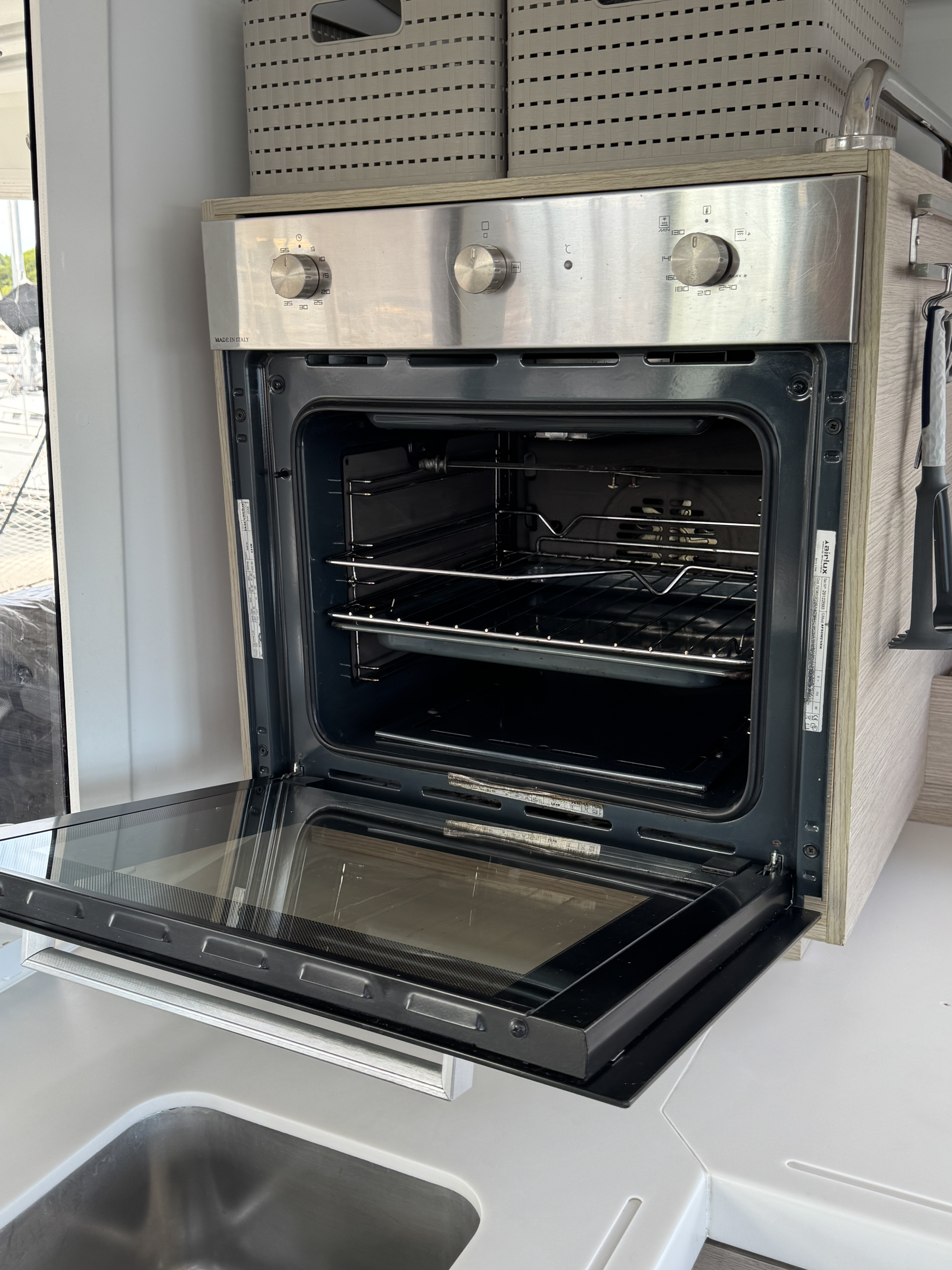 | Inside | Oven, Clock, Generator, Heating, Inverter 12V/220V, Coffee machine, Airconditioning (independent from shore power), Refrigerator, Battery charger, Dinghy (byboat) pump, Microwave oven, Pantry equipment, Radio, Convertible salon table, USB sockets in saloon and cabins, fans in cabins, Warm water, Washing machine, WC (electr.) |