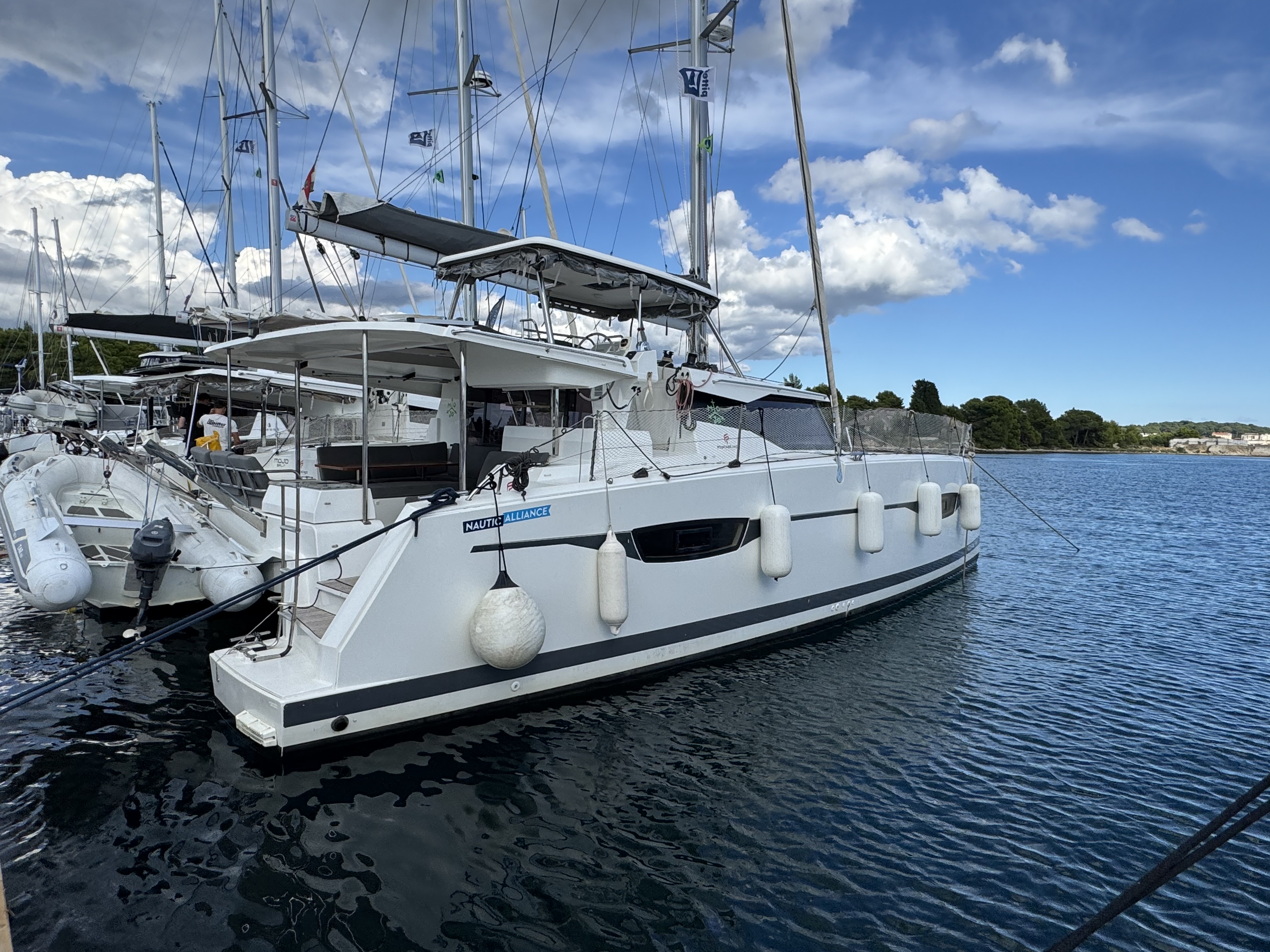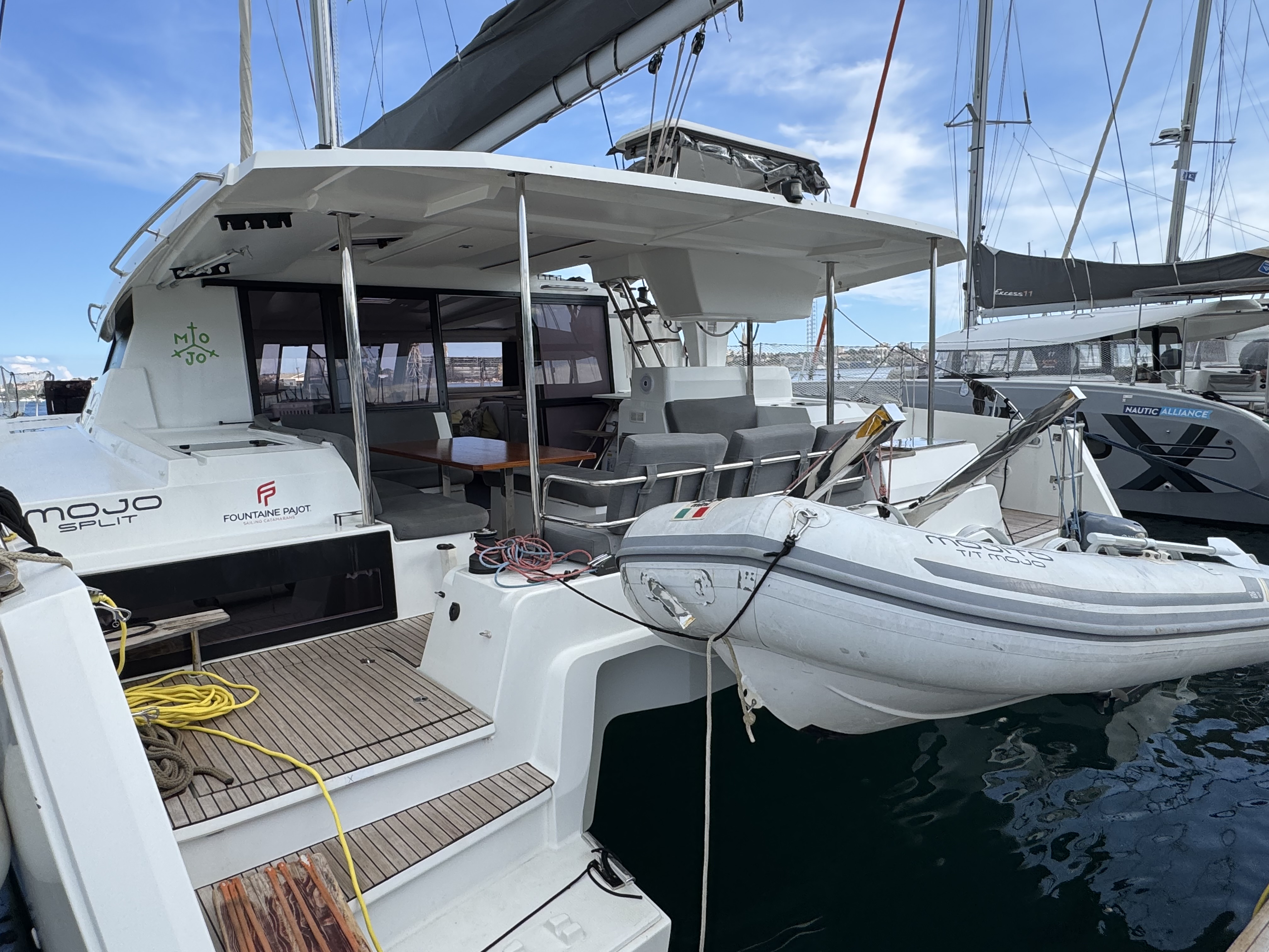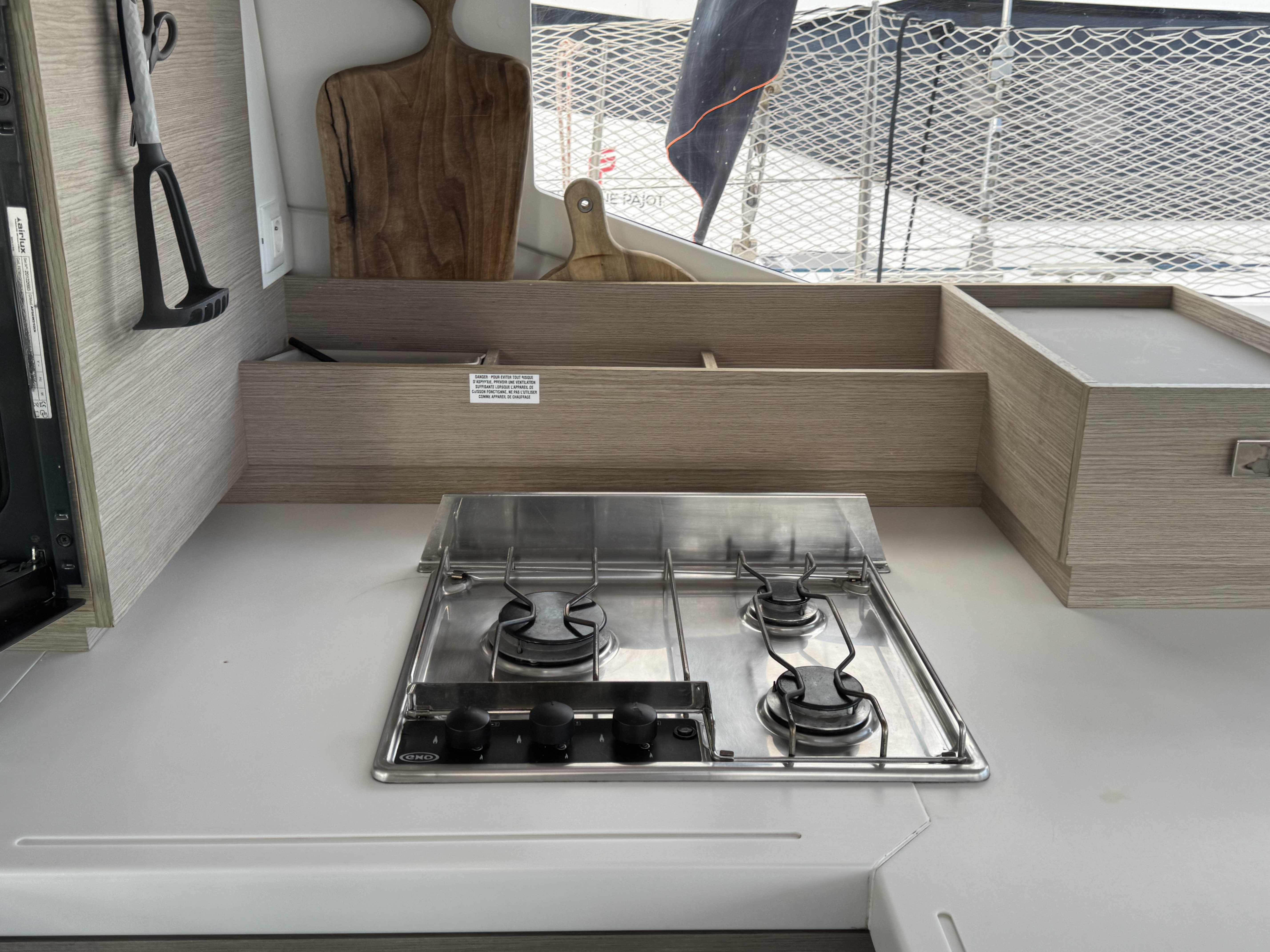 | Inside | Oven, Clock, Generator, Heating, Inverter 12V/220V, Coffee machine, Airconditioning (independent from shore power), Refrigerator, Battery charger, Dinghy (byboat) pump, Microwave oven, Pantry equipment, Radio, Convertible salon table, USB sockets in saloon and cabins, fans in cabins, Warm water, Washing machine, WC (electr.) |