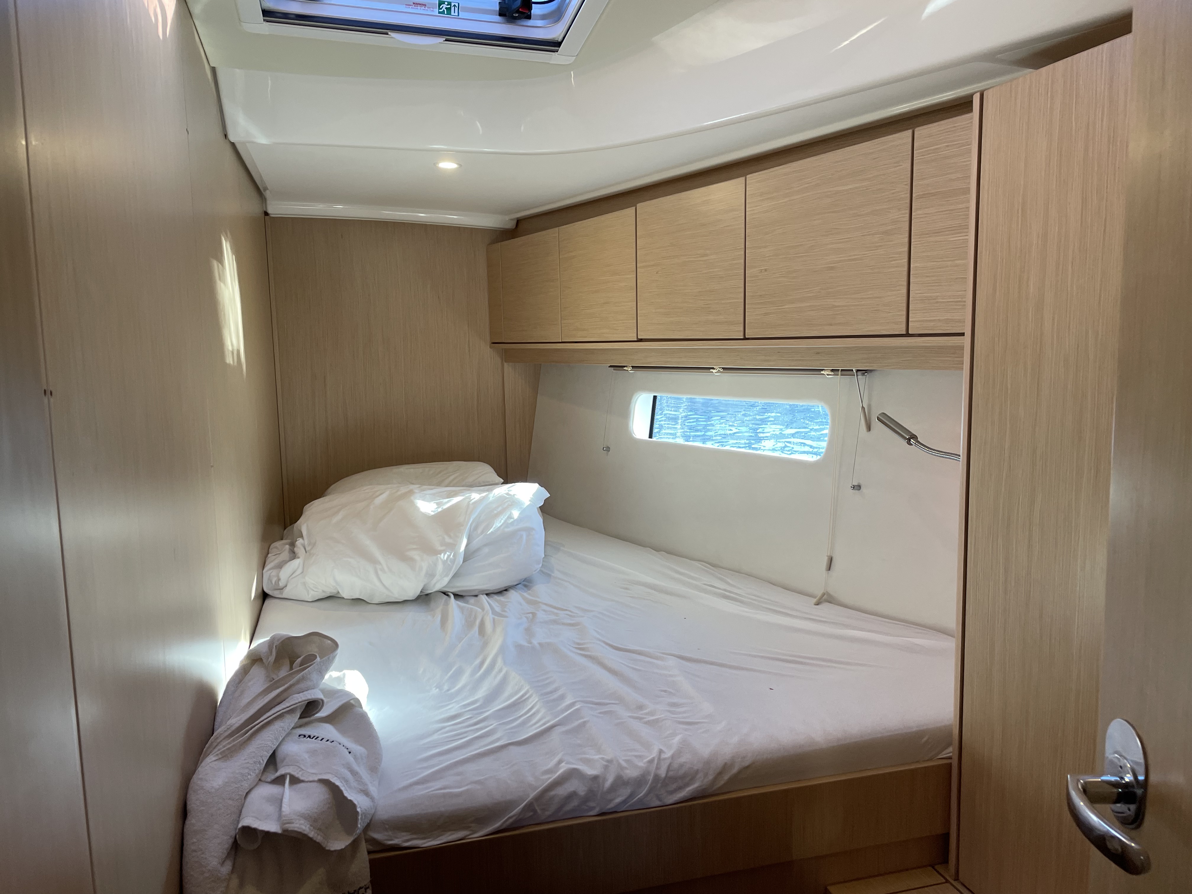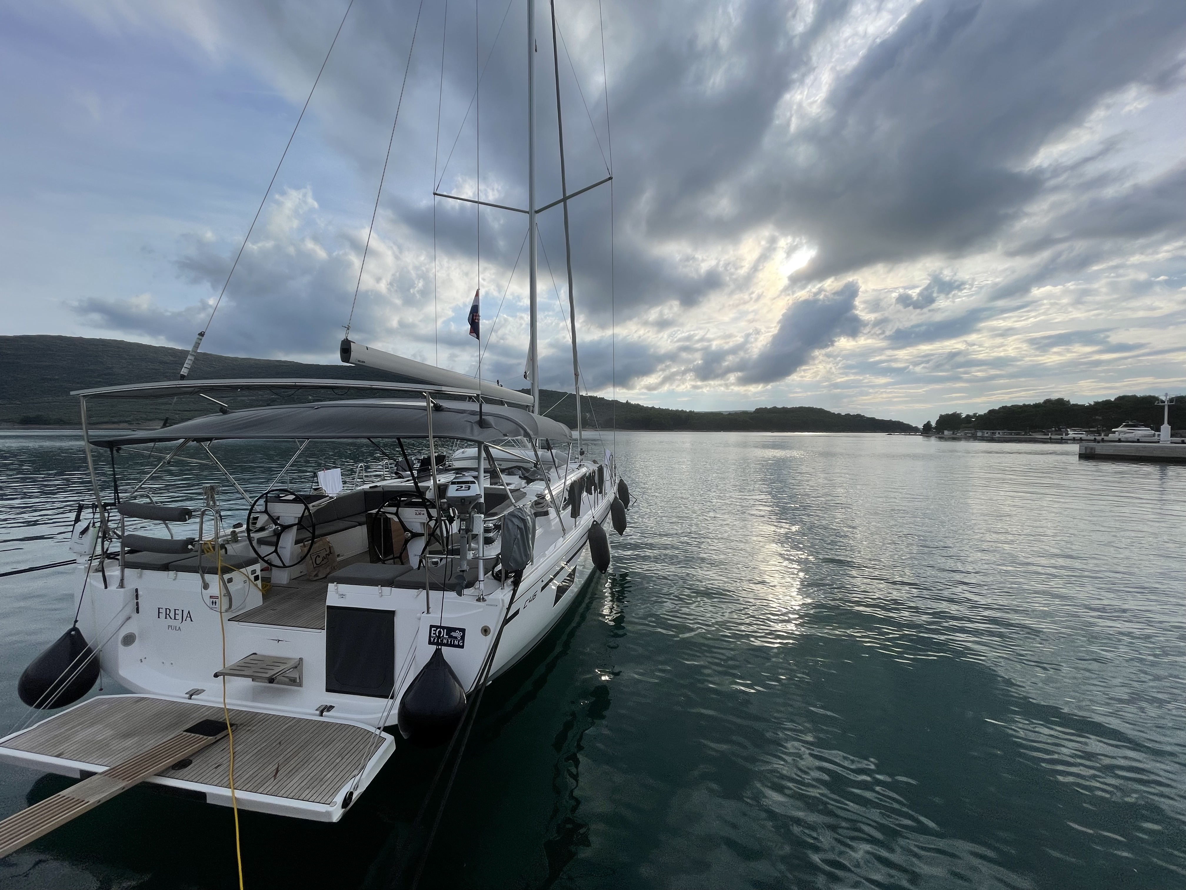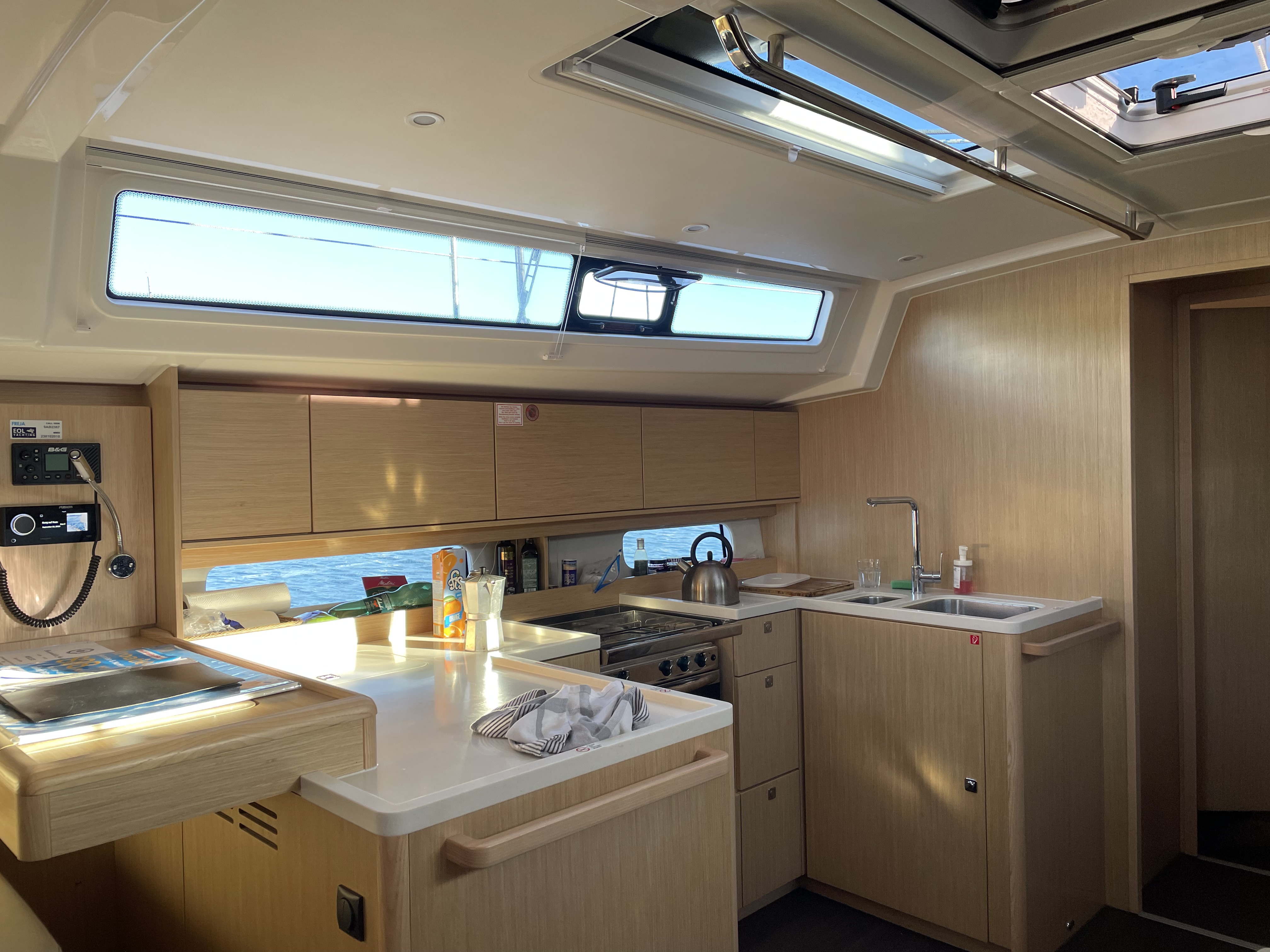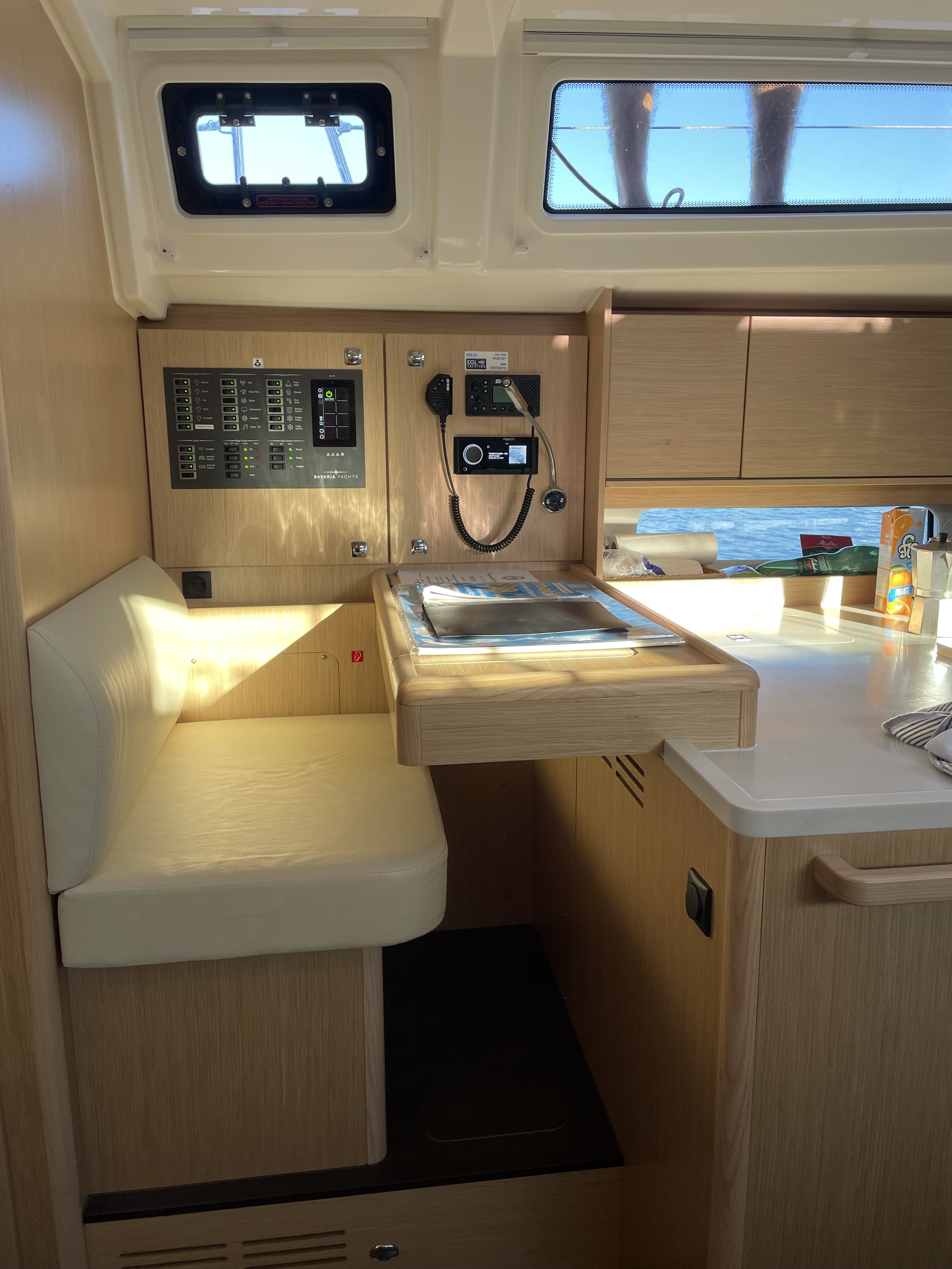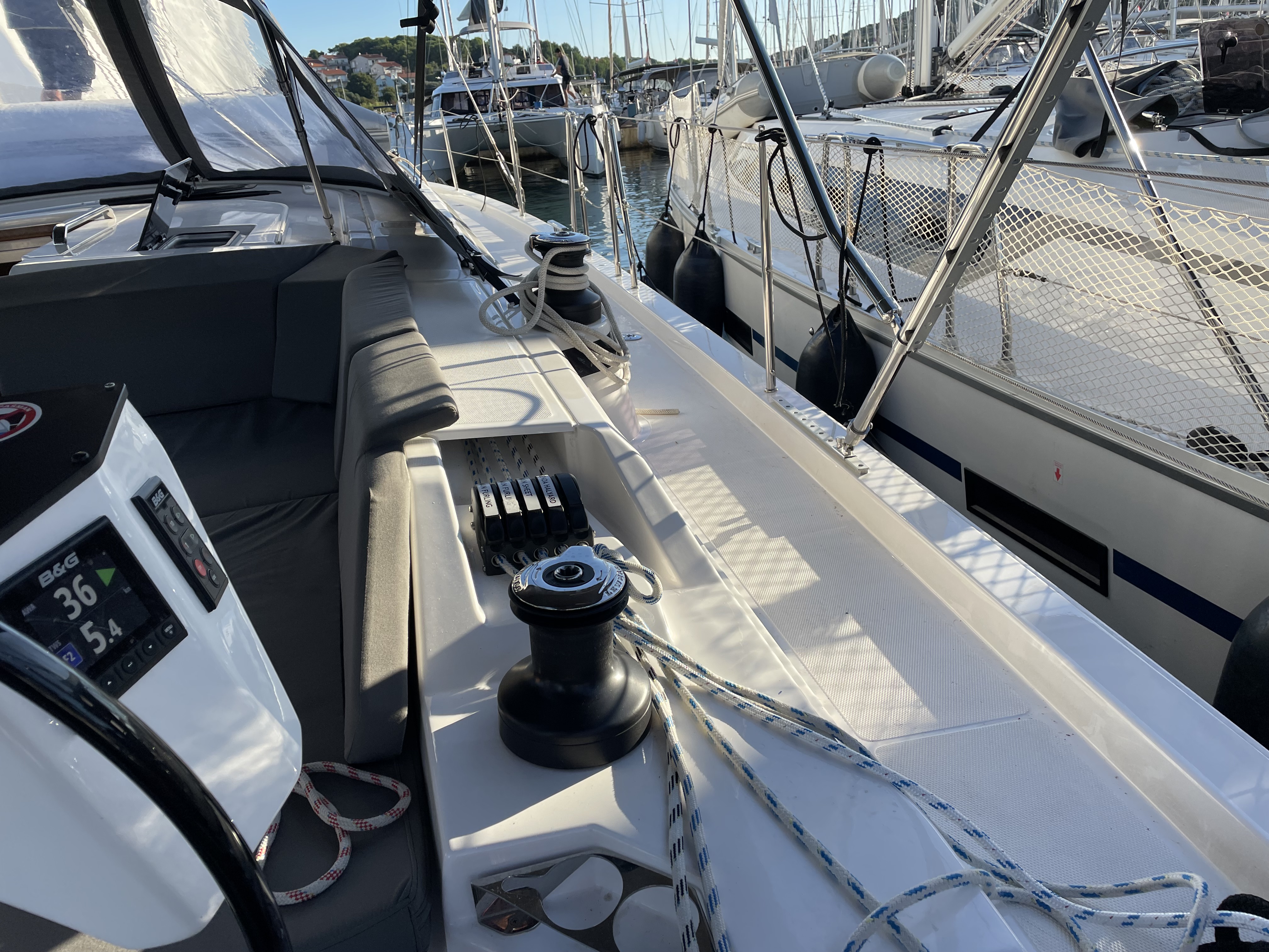 Die Jacht war in einem sauberen segelfertigen Zustand. Kleine Unzulänglichkeiten erschweren das Leben an Bord leider etwas: fehlende Haken um Kleider oder Handtücher aufzuhängen, fehlende Türstopper, so dass die Türen klappern und gegen die Wände krachen, keine Tee- oder Thermoskannen. Also eher Kleinigkeiten die fehlen.
