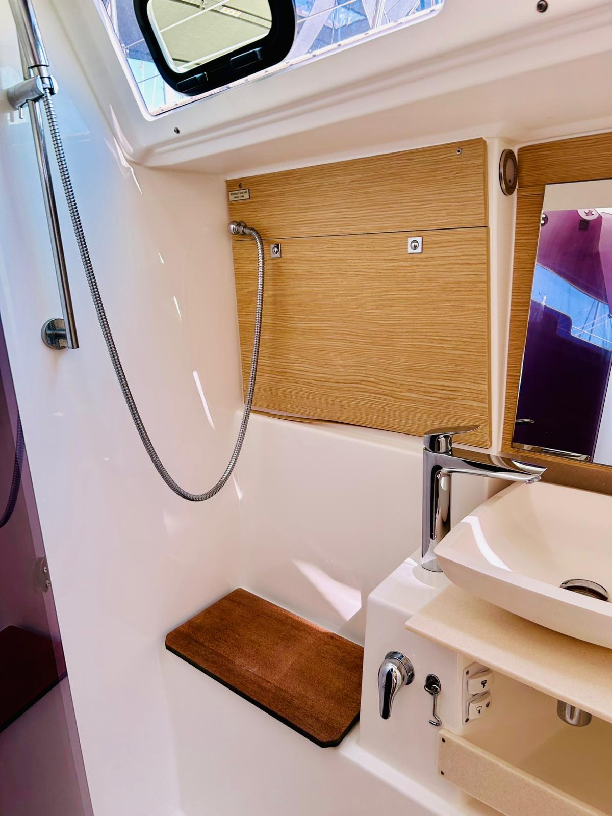| Outside | 12V - connection, 220V shore connection, Anchor with chain, Bathing ladder, Bathing platform, Bimini top, Boat hook, Cockpit shower hot/cold, Cockpit speakers, Cockpit cushions, Cockpit table, Cover brush, Jerry cans for diesel, Electr. anchor windlass, Fender, Mooring lines, Gangway, BBQ, Railing, Solar panels, Sprayhood, Teak on bathing platform, Teak in cockpit, Wire (shroud) cutter, Windex |