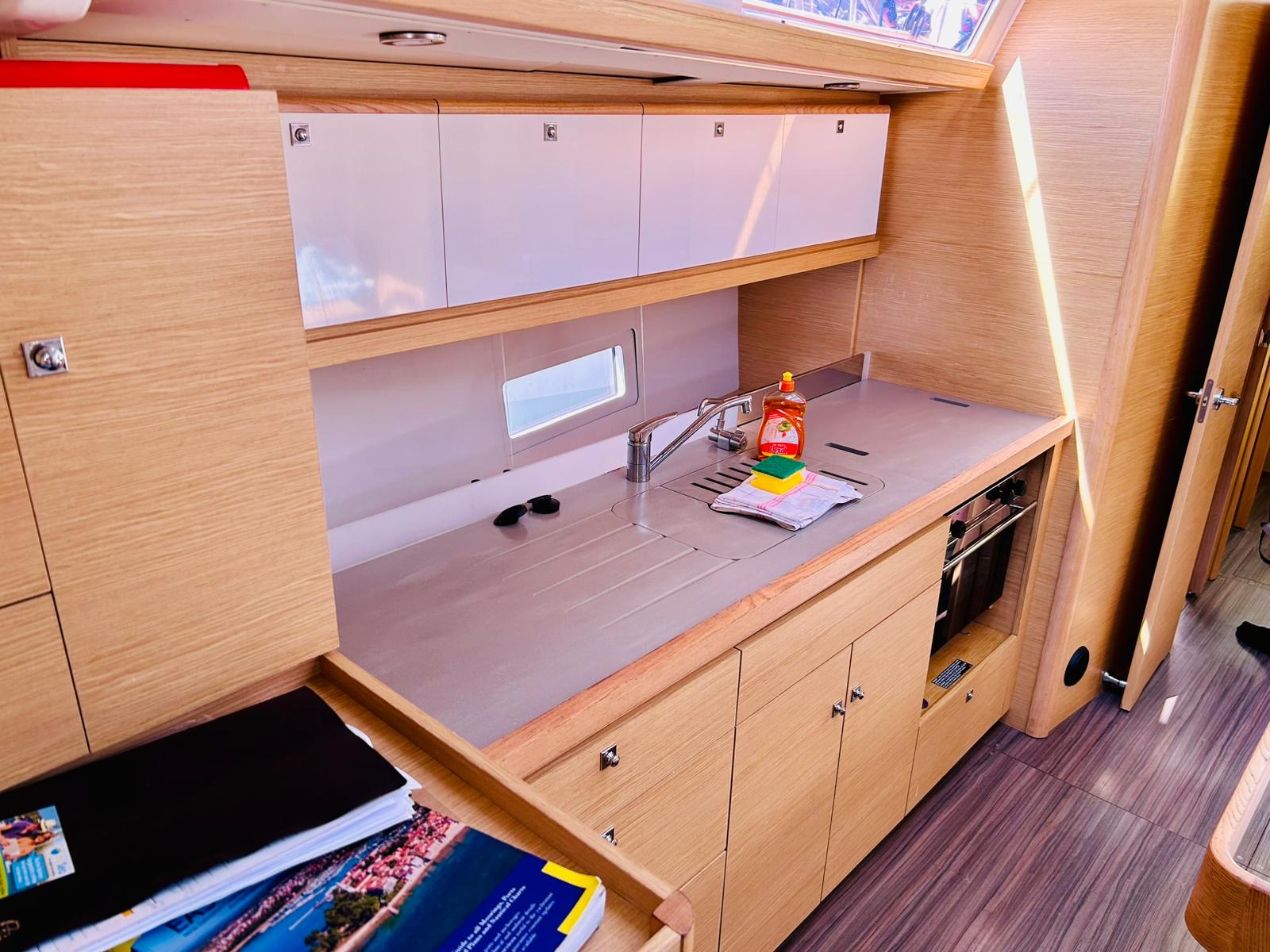 | Inside | 220V sockets, Oven, Clock, Pressurised water, Black water tank, Air heating, Heating, Inverter 12V/220V, Refrigerator, Battery charger, Speakers in saloon, LED interior lights, Mosquito nets, Pantry equipment, Radio with USB and Bluetooth, Safe for valuables, Convertible salon table, Sink, TV, Warm water, WC (electr.), Wine fridge |