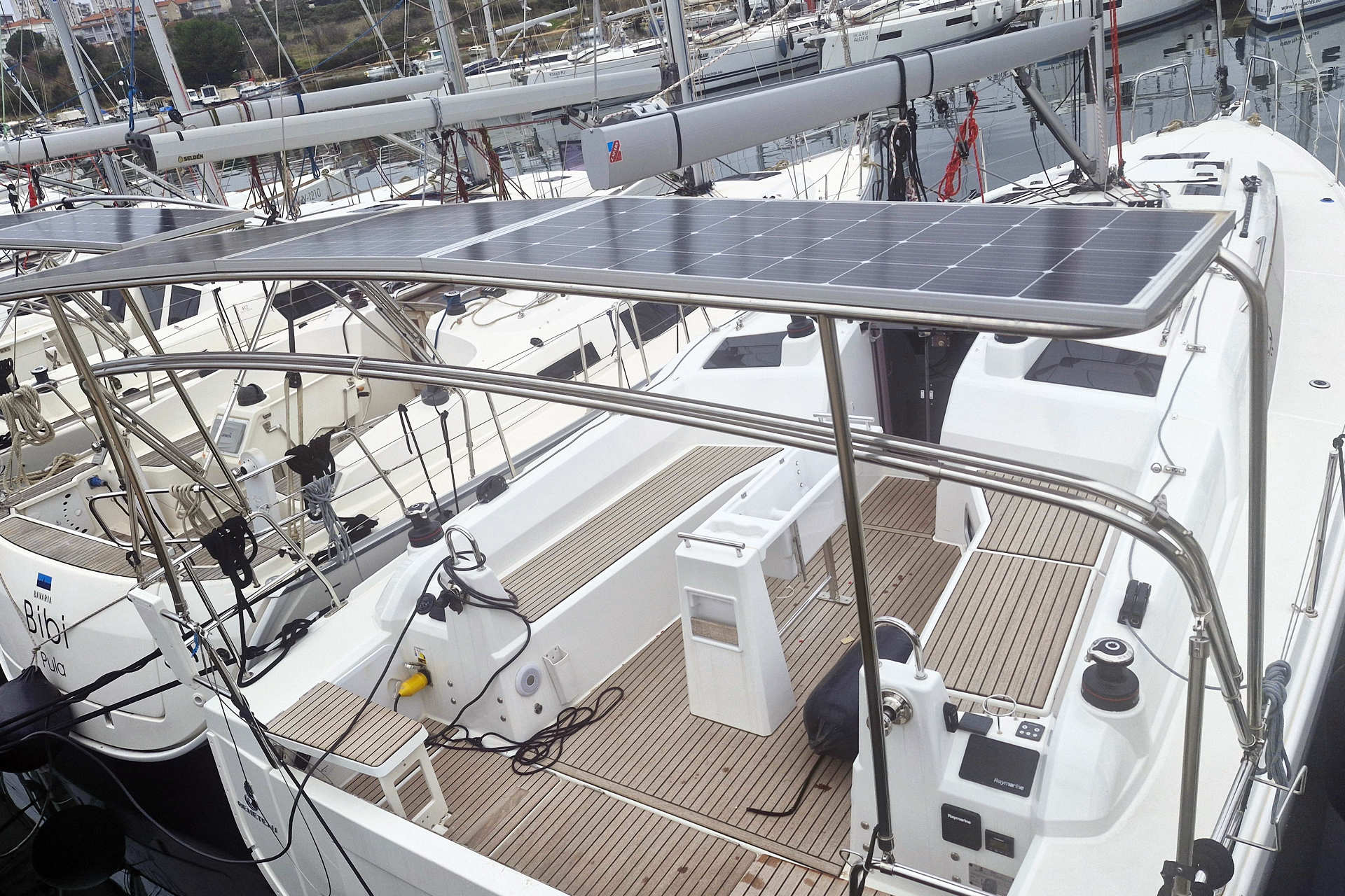 | Outside | 12V - connection, 220V shore connection, Anchor with chain, Bathing ladder, Bathing platform, Bimini top, Boat hook, Cockpit shower, Cockpit speakers, Cockpit cushions, Cockpit table, Jerry cans for diesel, Electr. anchor windlass, Halyard winches, Fender, Mooring lines, Gangway, Lifeline system, Galley in cockpit, Solar panels, Sprayhood, Teak on bathing platform, Teak in cockpit, Wire (shroud) cutter, Windex, Winches |