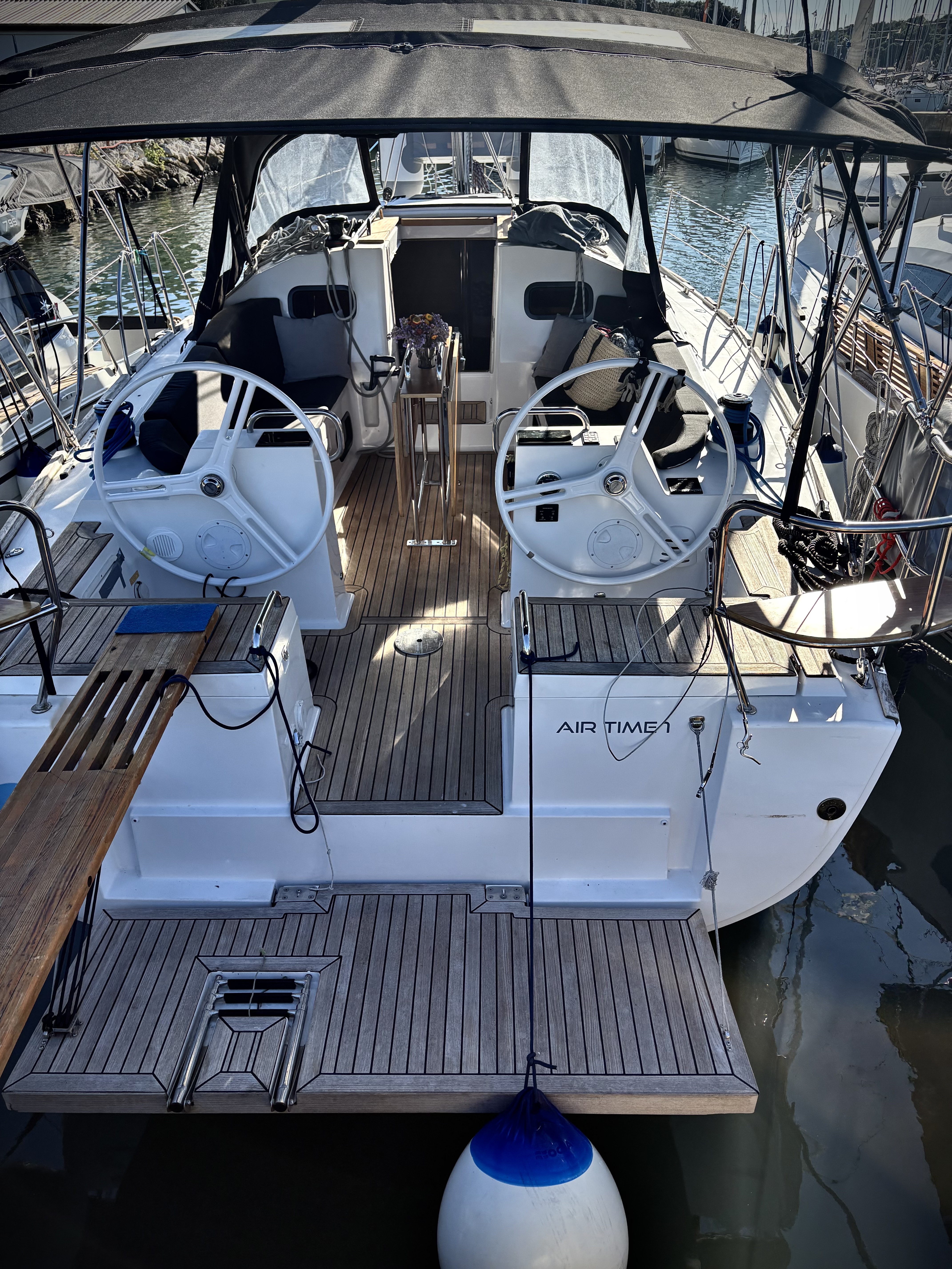 | Outside | Bathing platform, Bimini top, Cockpit shower, Refrigerator in cockpit, Cockpit table, Deck lights, Delta anchor, Electr. anchor windlass, Folding propeller, Propane-BBQ in cockpit, Sprayhood |