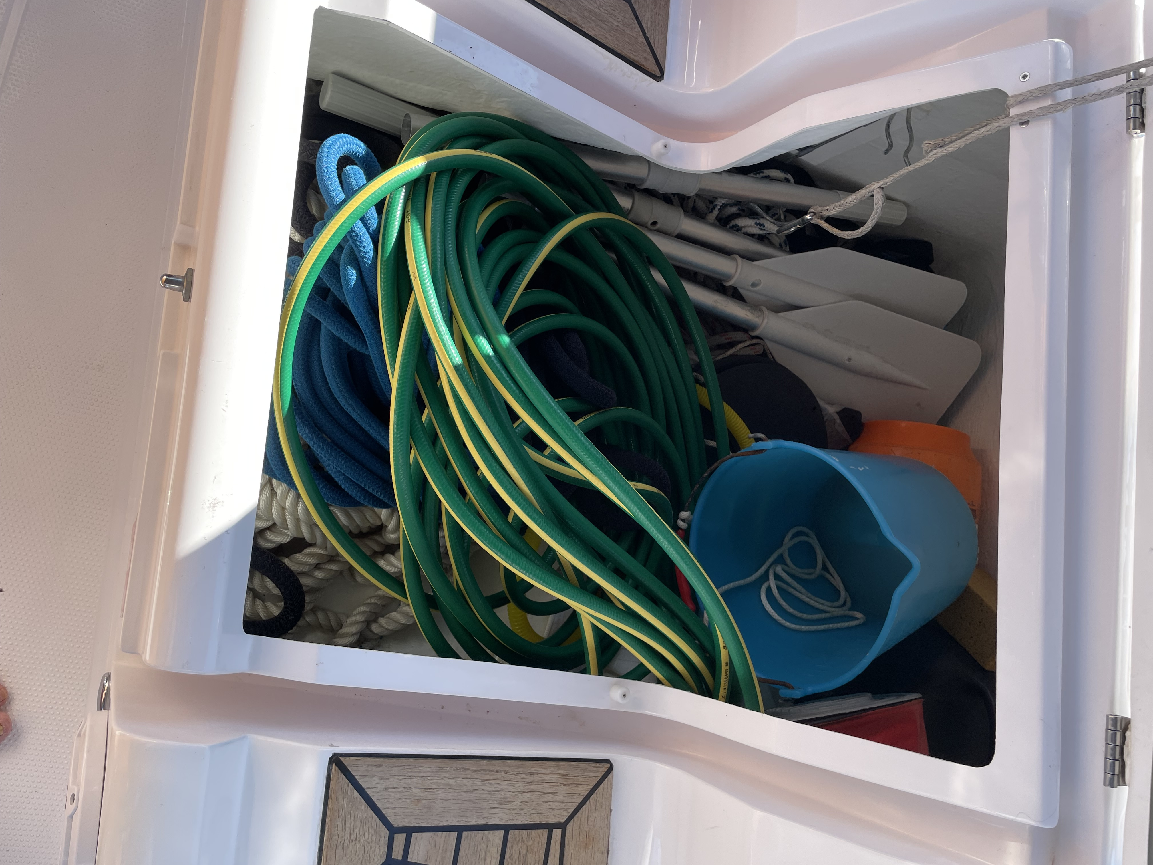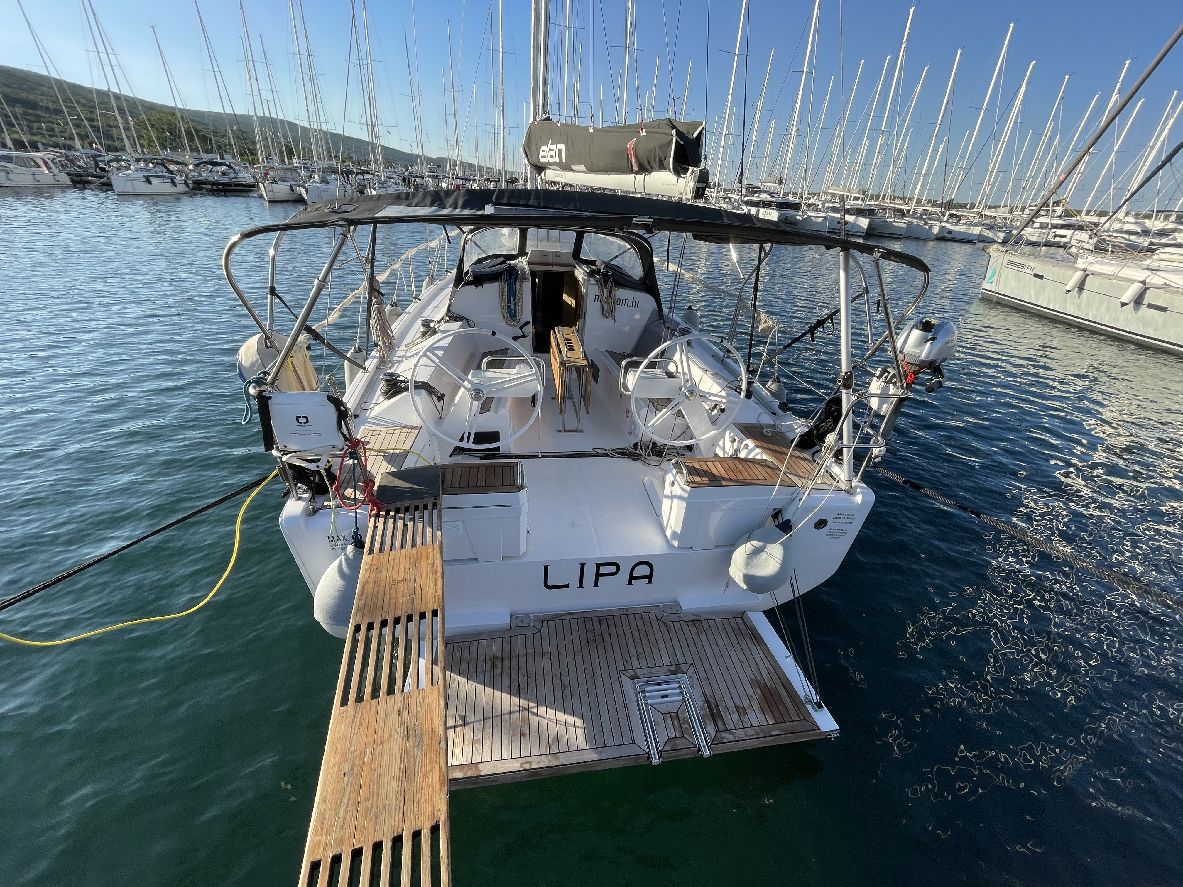 | Outside | Bathing platform, Bimini top, Cockpit shower, Refrigerator in cockpit, Cockpit speakers, Cockpit cushions, Electr. anchor windlass, Fender, Mooring lines, Sprayhood |