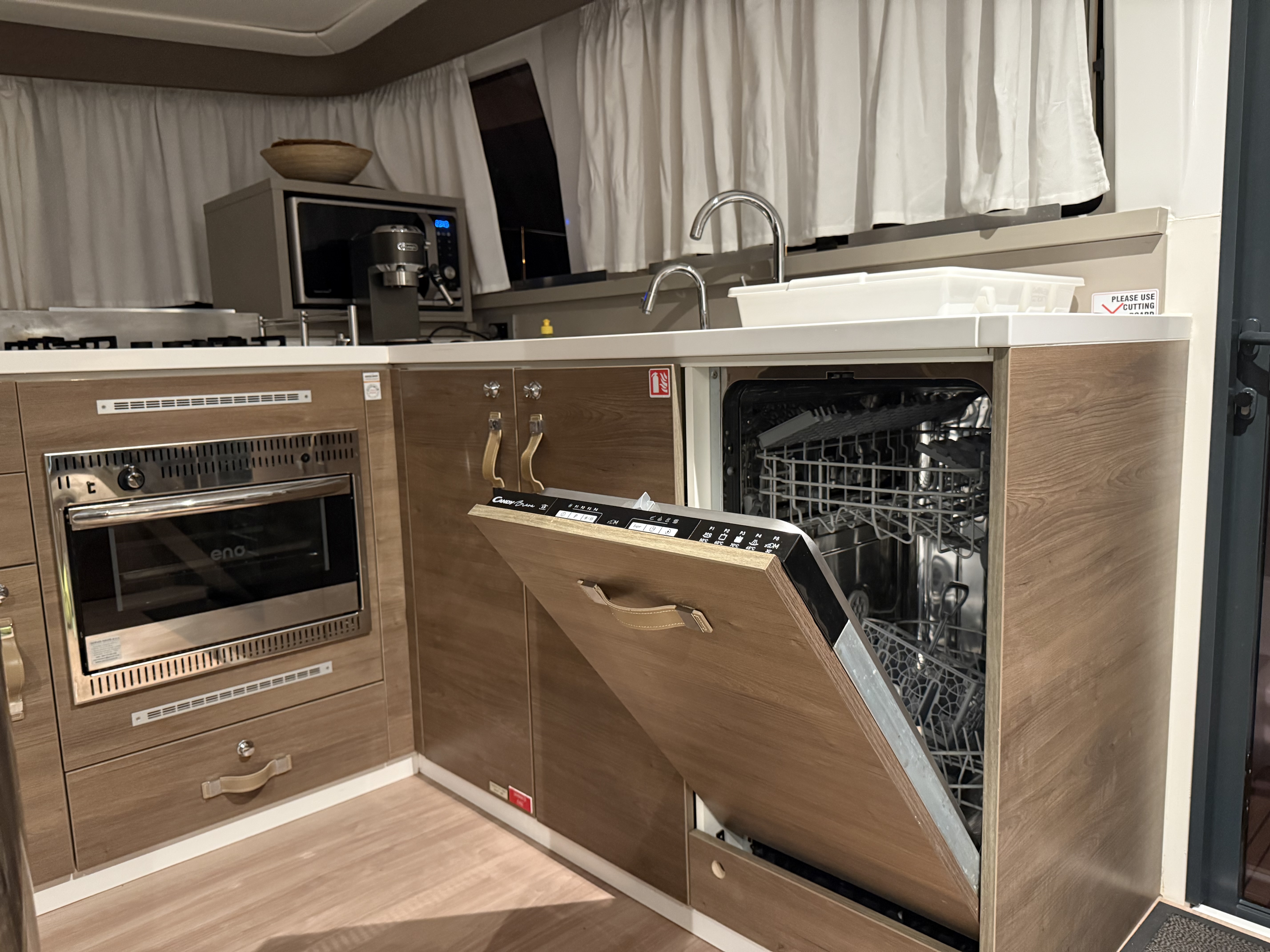 | Inside | 220V sockets, Black water tank, Generator, Dishwasher, Heating, Inverter 12V/220V, Airconditioning (independent from shore power), Refrigerator, Battery charger, LCD TV and DVD player, Microwave oven, Radio, WC (electr.) |