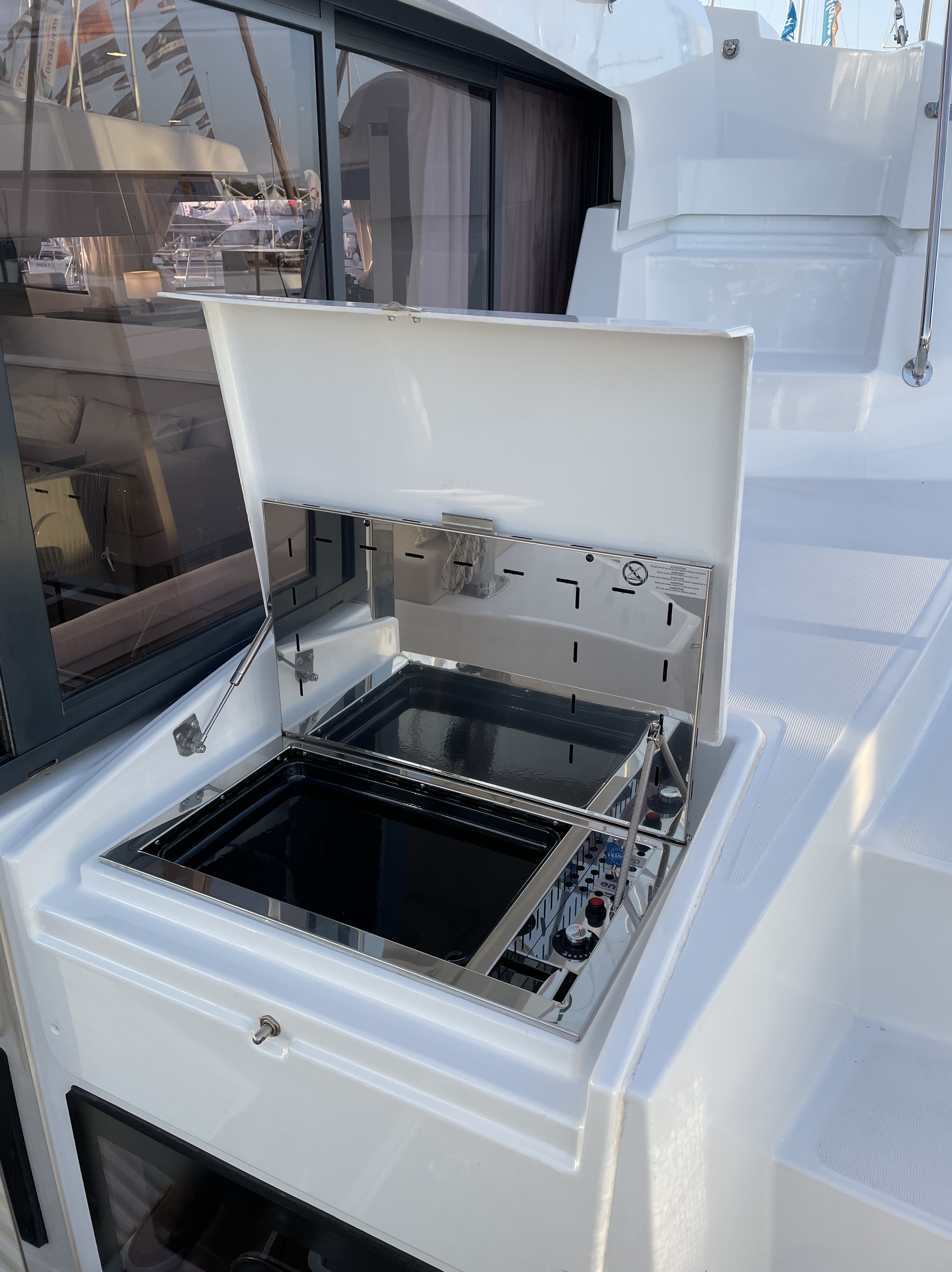 | Outside | 12V - connection, 220V shore connection, Anchor with chain, Bathing platform, Bimini top, Boat hook, Cockpit shower, Cockpit speakers, Cockpit cushions, Cockpit table, Electr. anchor windlass, Fender, Mooring lines, BBQ, hydraul. Gangway, Sun deck, Teak in cockpit, LED submarine lights, Winches |