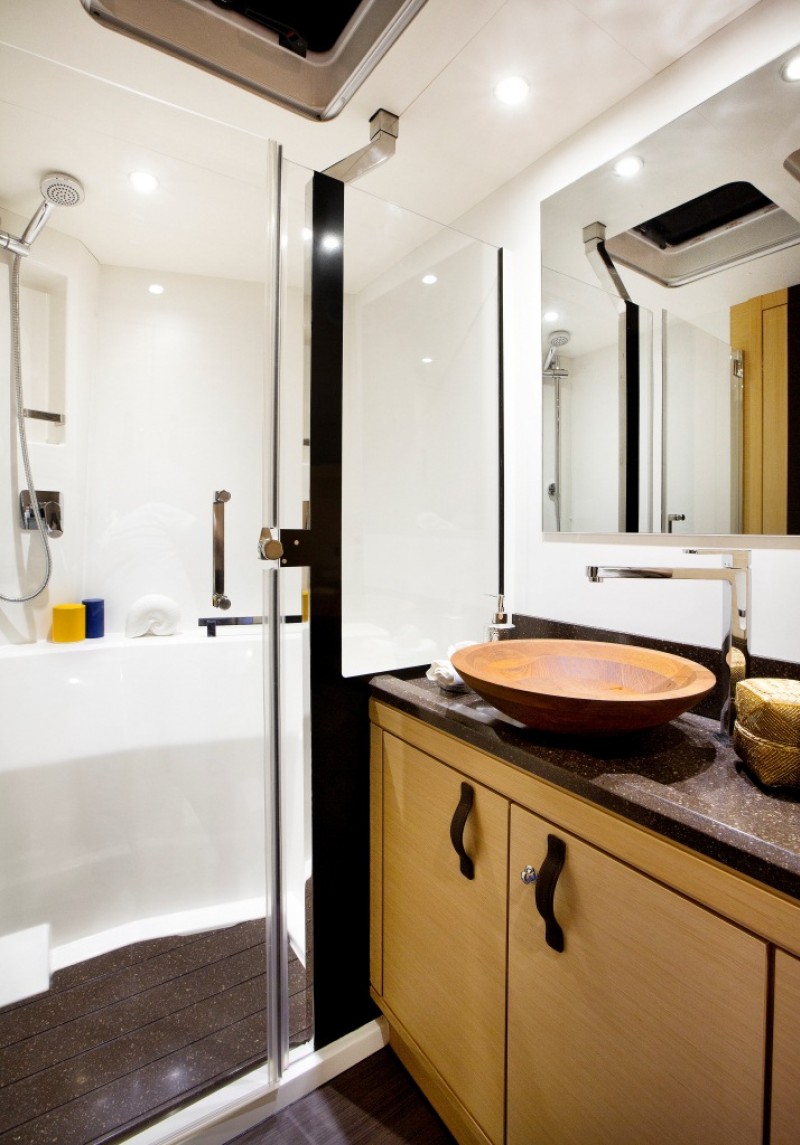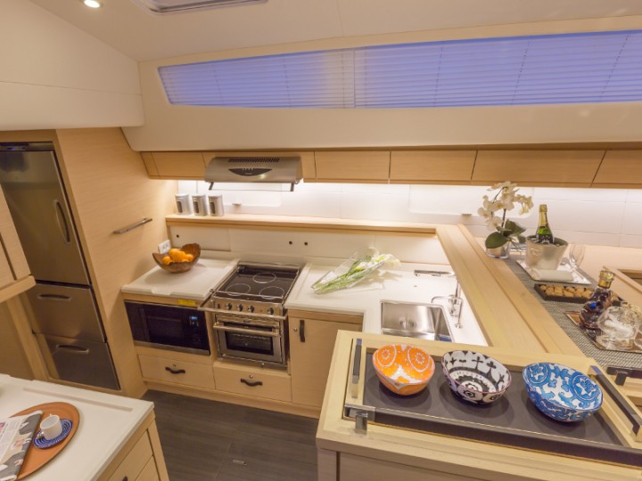 | Inside | Oven, Ice cube machine, Gas oven, Freezer, Generator, Dishwasher, Heating, Inverter 12V/220V, Coffee machine, Airconditioning (independent from shore power), Refrigerator, Speakers in saloon, Microwave oven, Pantry equipment, Sound system, Sink, TV, Watermaker, WC (electr.) |