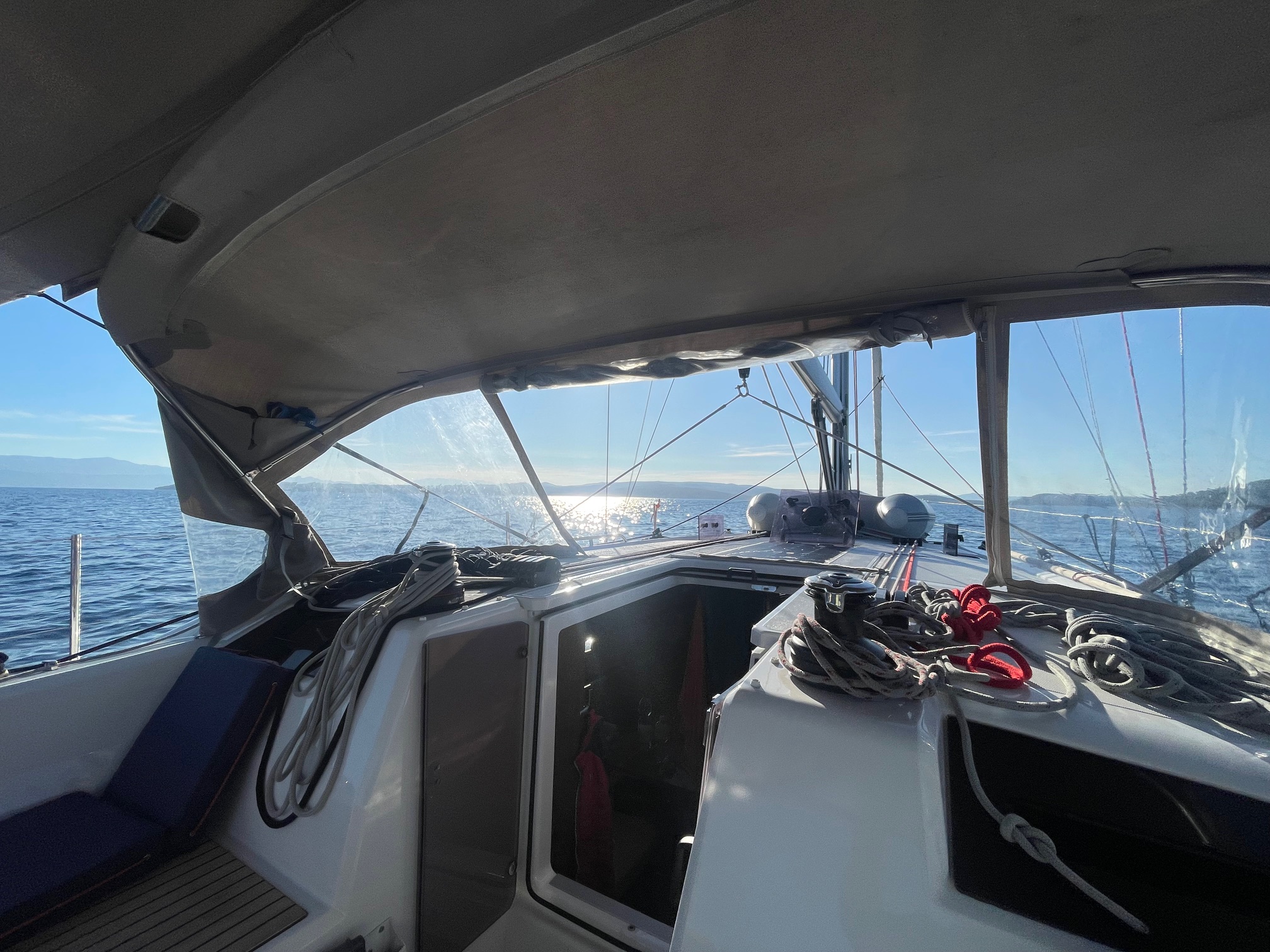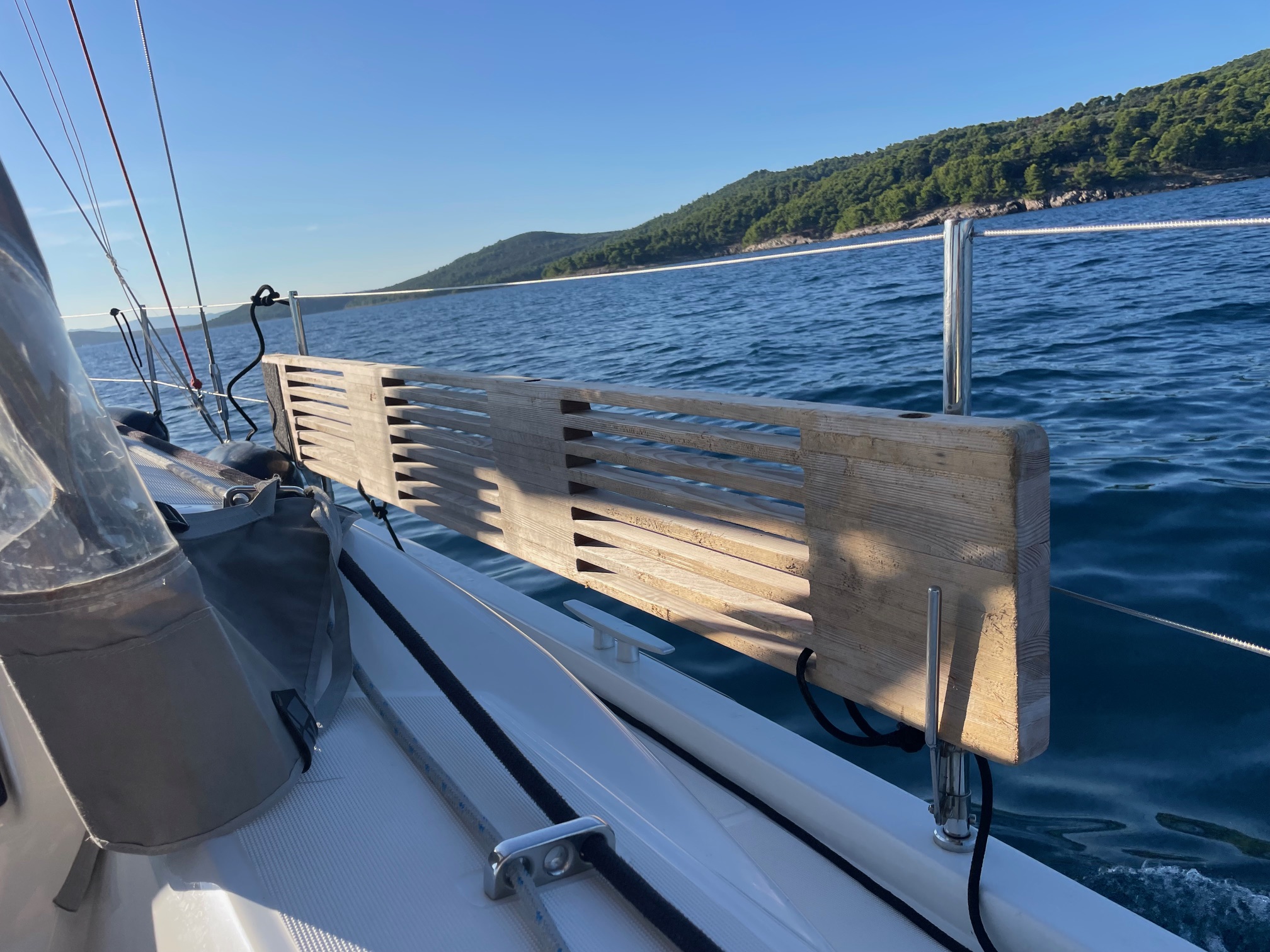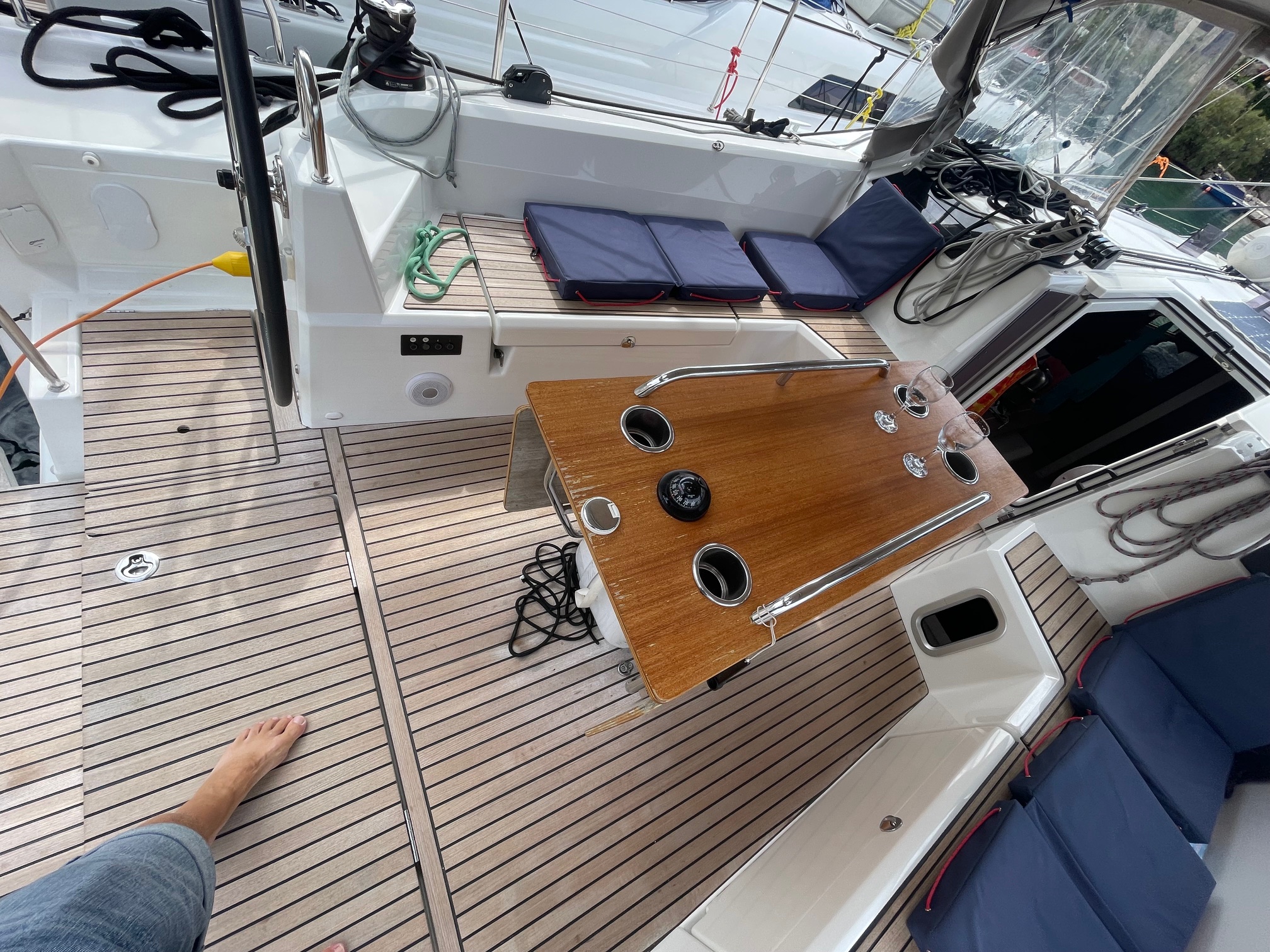 | Outside | 12V - connection, 220V shore connection, Anchor with chain, Bathing ladder, Bathing platform, Bimini top, Boat hook, Cockpit shower, Cockpit speakers, Cockpit cushions, Cockpit table, Cover brush, Jerry cans for diesel, Electr. anchor windlass, Halyard winches, Fender, Mooring lines, Gangway, Lifeline system, Solar panels, Sprayhood, Teak on bathing platform, Teak in cockpit, Windex |