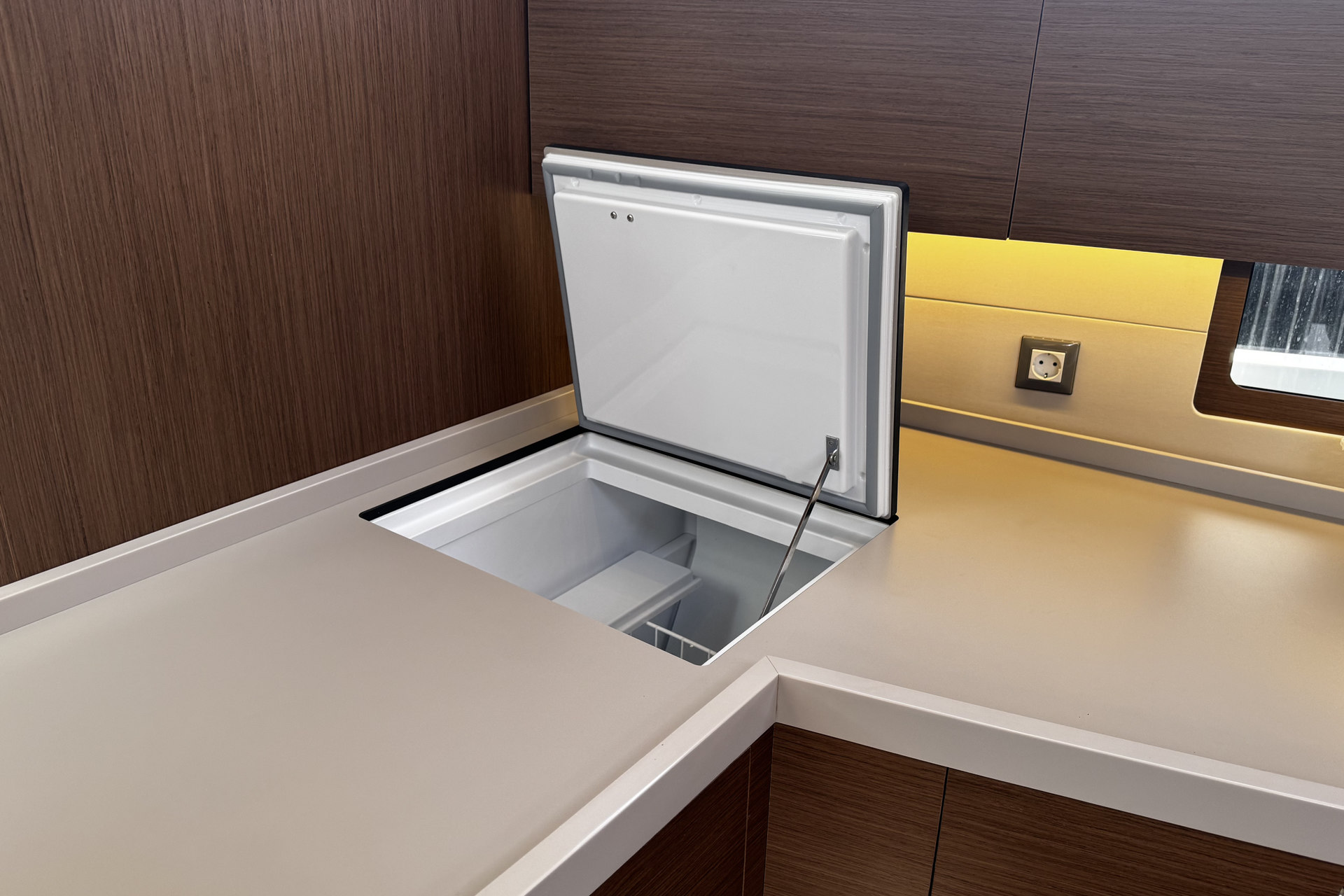 | Inside | 12V/220V sockets, Oven, Pressurised water, Gas oven, Freezer, Heating, Inverter 12V/220V, Refrigerator, Battery charger, Pantry equipment, Radio, Radio with USB and Bluetooth, Safe for valuables, Convertible salon table, Sink, TV, fans in cabins, Warm water, WC (electr.) |