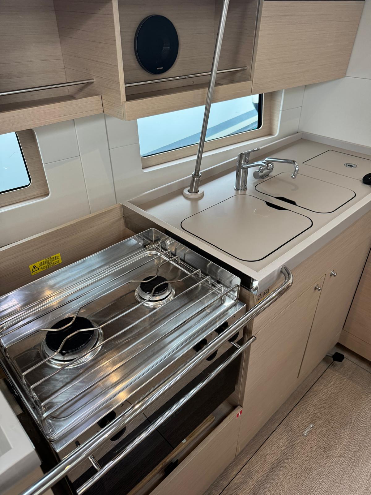 | Inside | 220V sockets, Oven, Clock, Black water tank, Gas oven, Generator, Heating, Inverter 12V/220V, Airconditioning (independent from shore power), Battery charger, Shore power cable, Speakers in saloon, Dinghy (byboat) pump, Pantry equipment, Radio, Funnel, USB Socket, Warm water, Kettle, WC (electr.) |