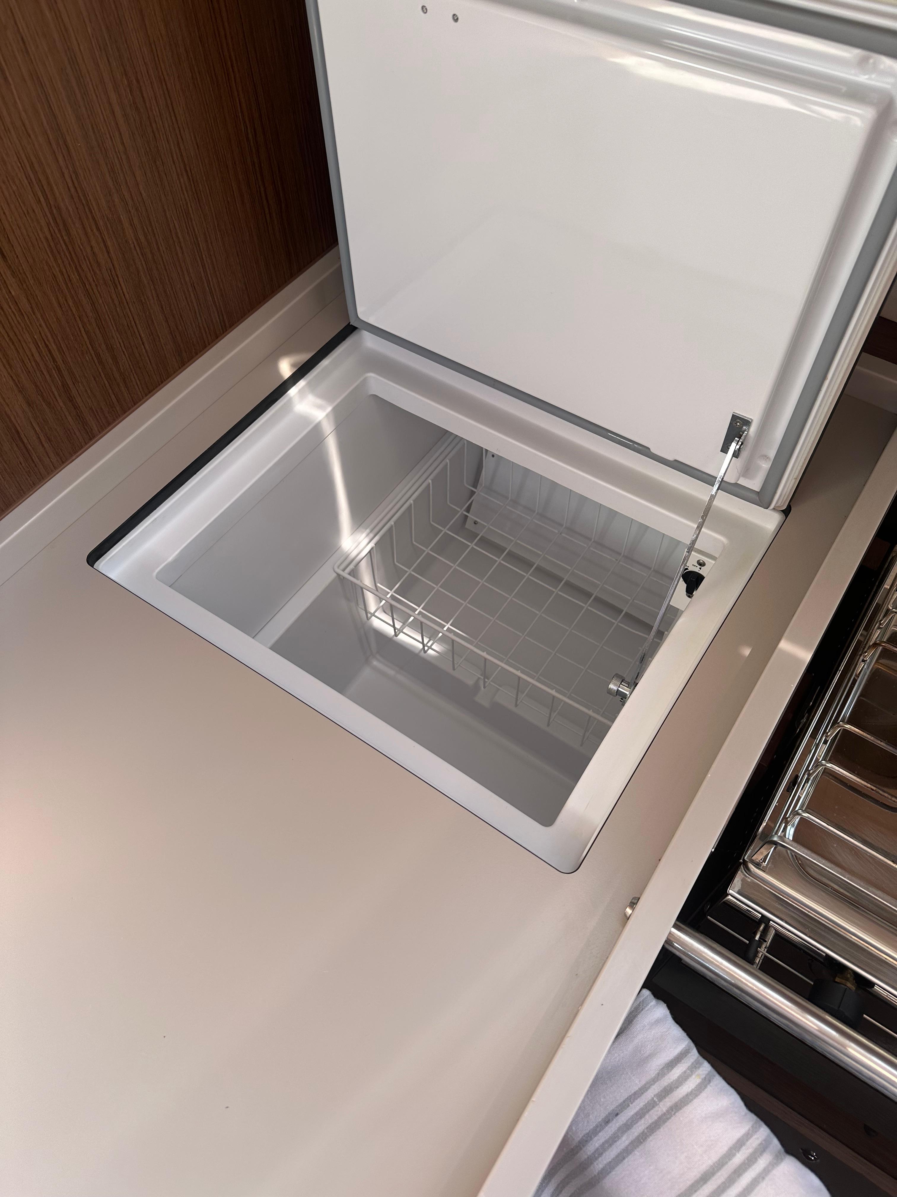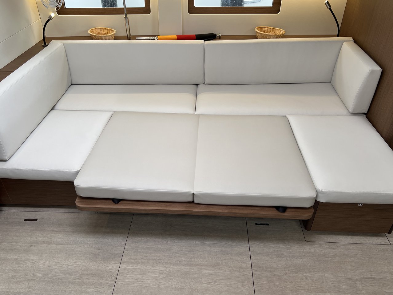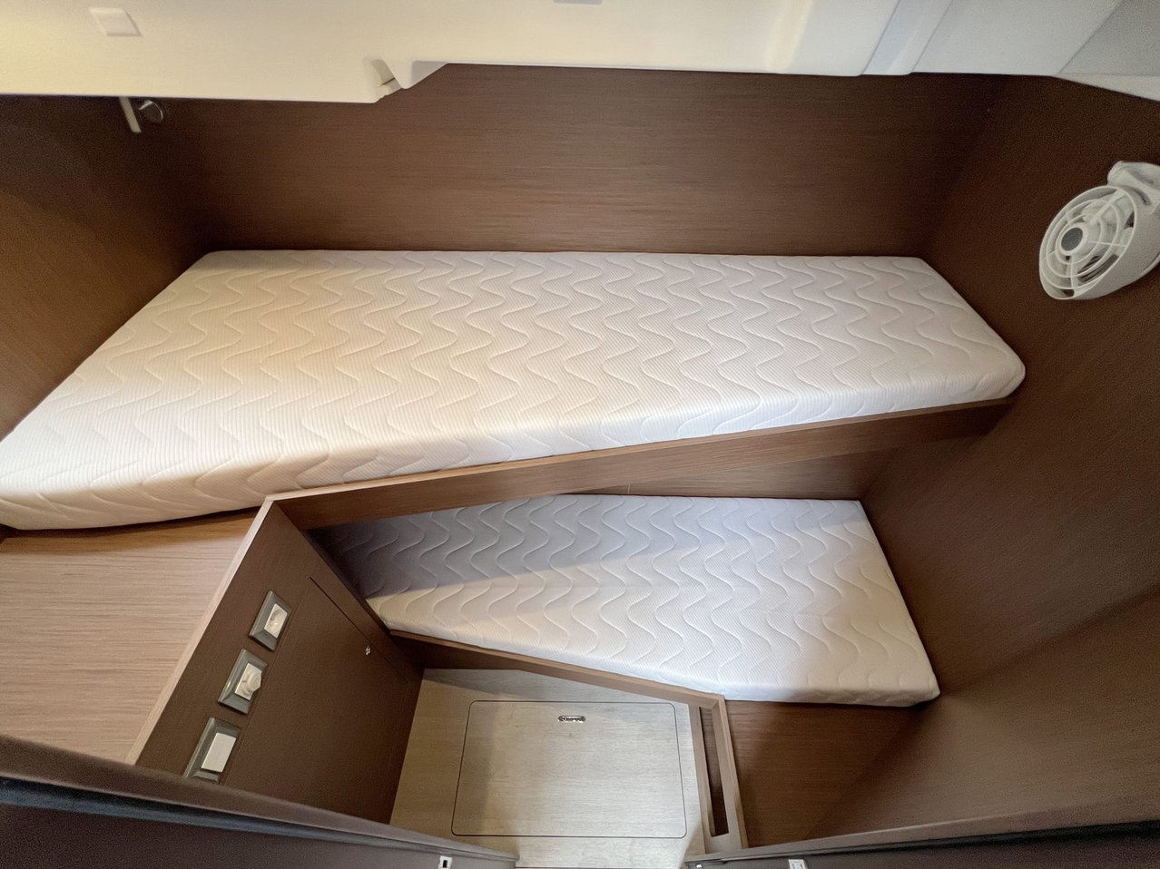 | Inside | 12V/220V sockets, Oven, Pressurised water, Gas oven, Freezer, Generator, Heating, Inverter 12V/220V, Airconditioning (independent from shore power), Cool box, Refrigerator, Battery charger, Speakers in saloon, Pantry equipment, Radio with USB and Bluetooth, Safe for valuables, Convertible salon table, Sink, TV, USB sockets in the cabins, fans in cabins, Warm water, WC (electr.) |