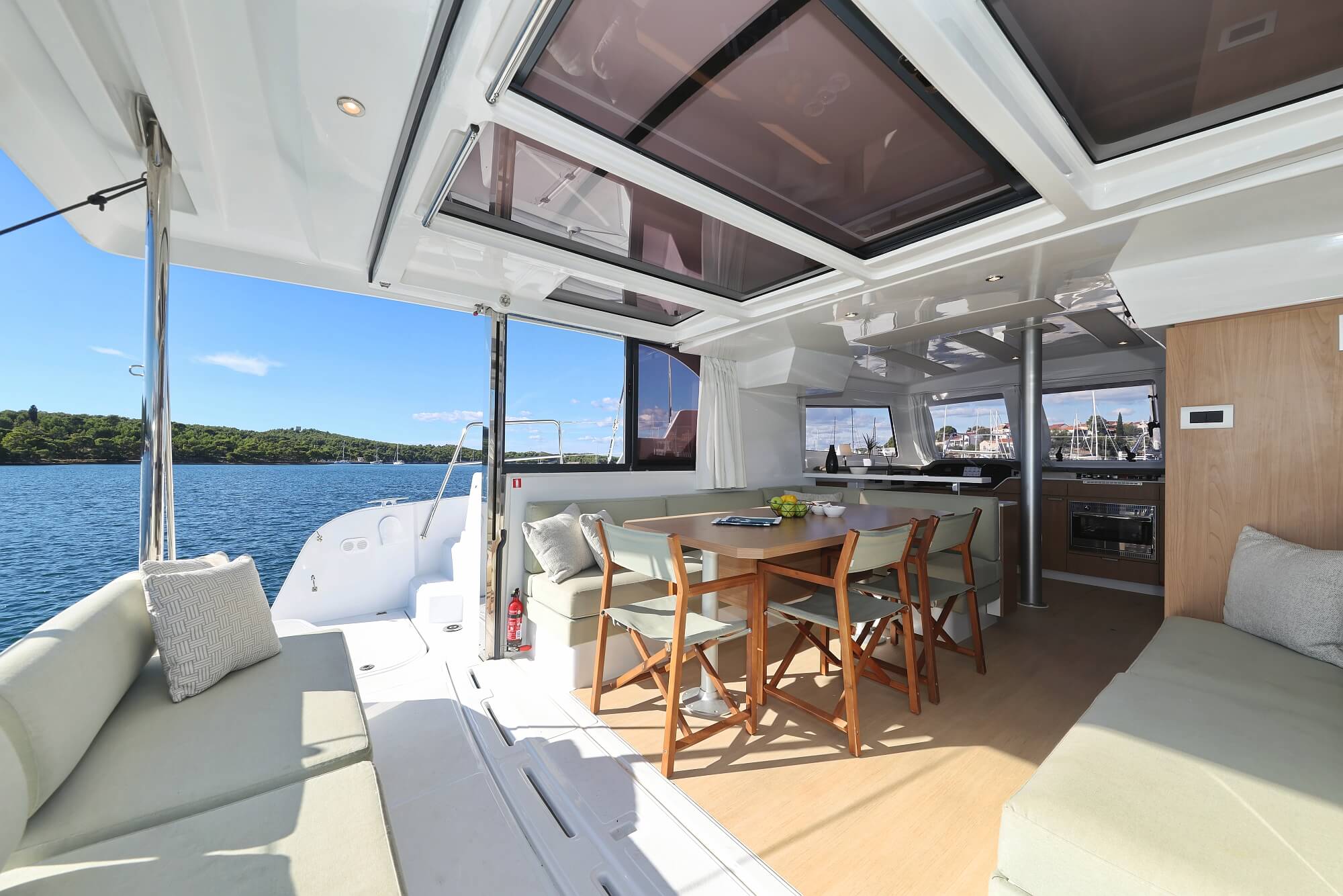 | Outside | Bathing platform, Bimini top, Cockpit shower, Cockpit speakers, Cockpit cushions, Cockpit table, Deck cushions, Solar panels, Sun deck |