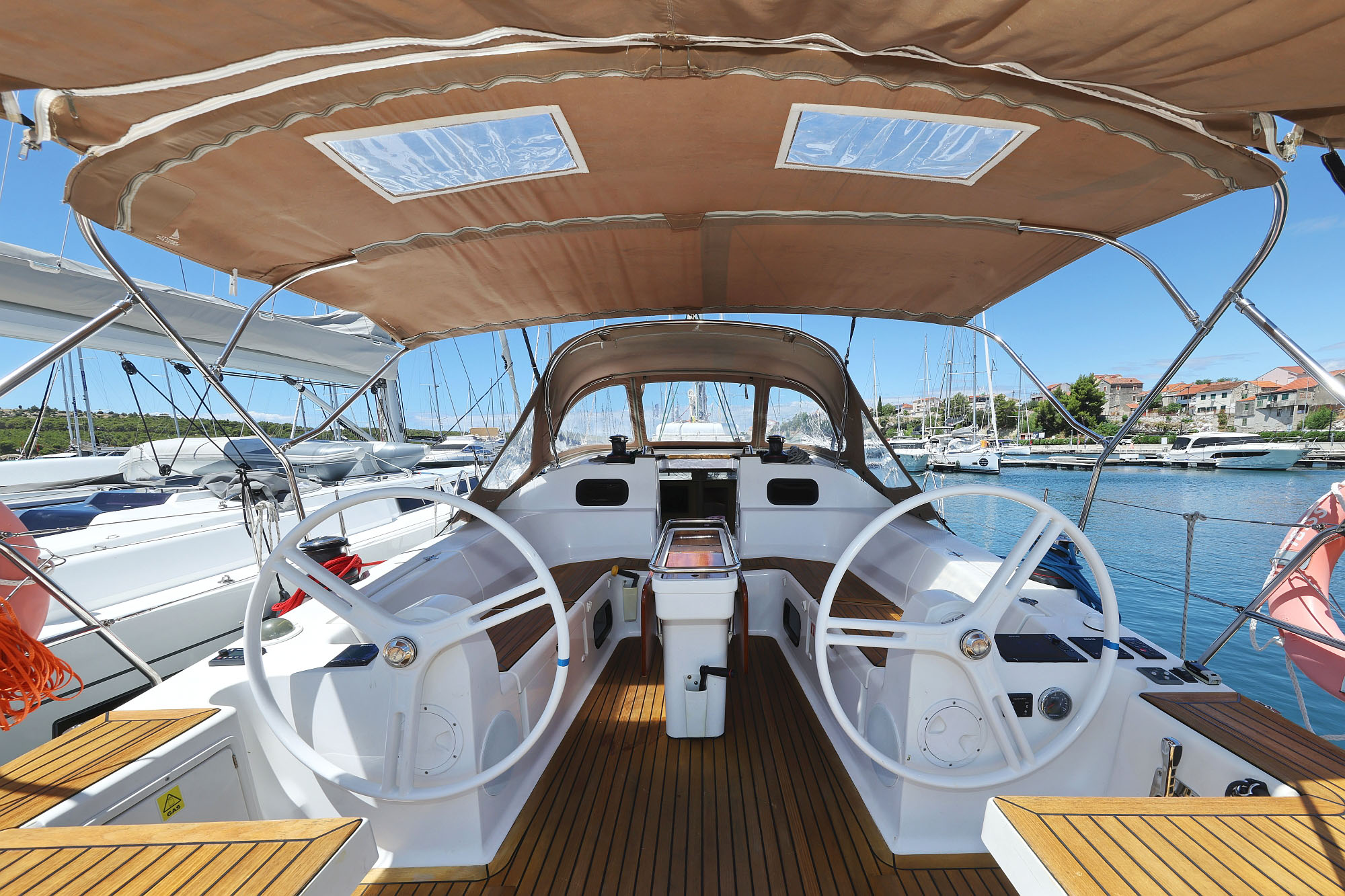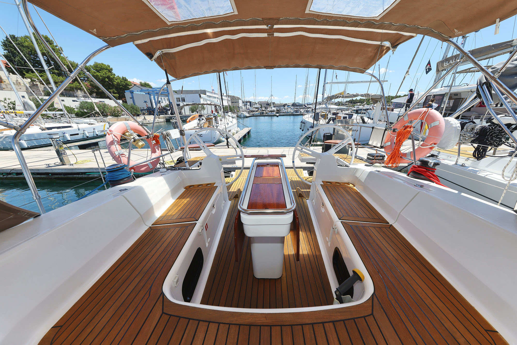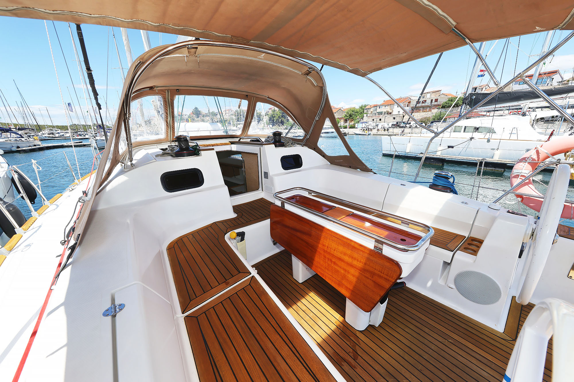 | Outside | 12V - connection, Bathing ladder, Bathing platform, Bimini top, Cockpit shower, Cockpit speakers, Cockpit cushions, Cockpit table, Deck lights, Deck cushions, Electr. anchor windlass, Genoa winches, Sprayhood, Teak in cockpit |