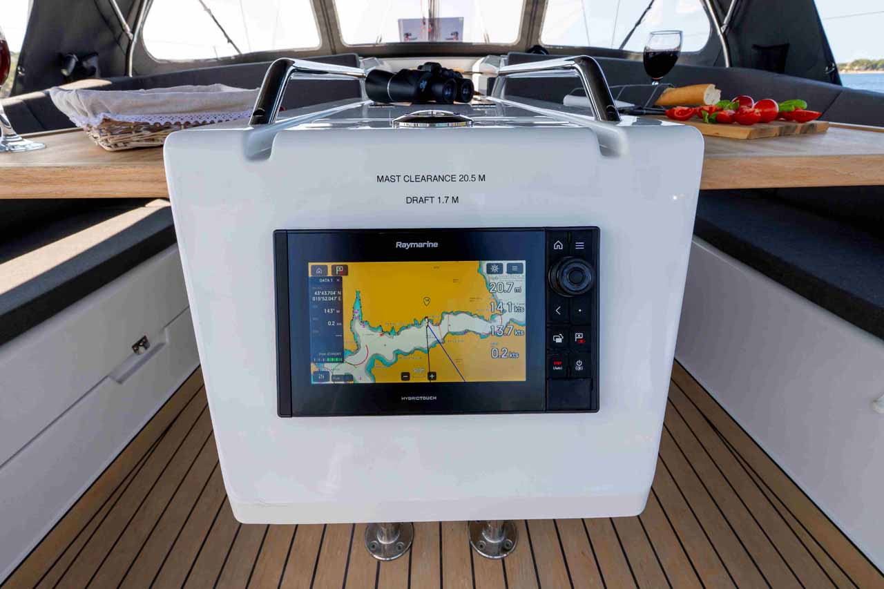 | Navigation | Barometer, Binoculars, GPS, GPS with chart plotter in cockpit, Harbour books, Hand bearing compass, Navigation set, Nautical charts, Tridata (Log, Echosounder, Windm.) |