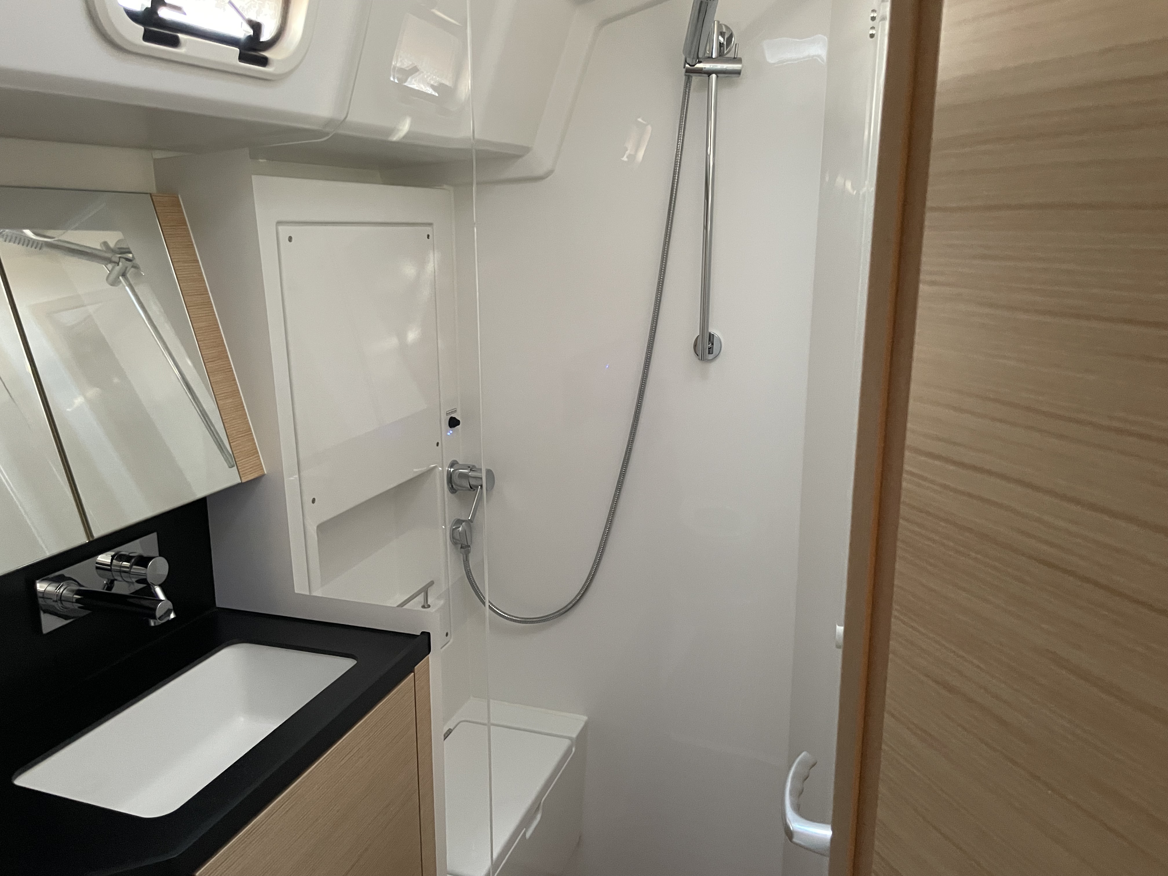 | Outside | 12V - connection, 220V shore connection, Bathing platform, Bimini top, Cockpit shower, Refrigerator in cockpit, Cockpit speakers, Cockpit light, Lowerable cockpit table, Electr. anchor windlass, Halyard winches, BBQ, Sun deck, Sprayhood, Sink on cockpit , Teak on bathing platform, Teak in cockpit, Teak deck, Wet bar |