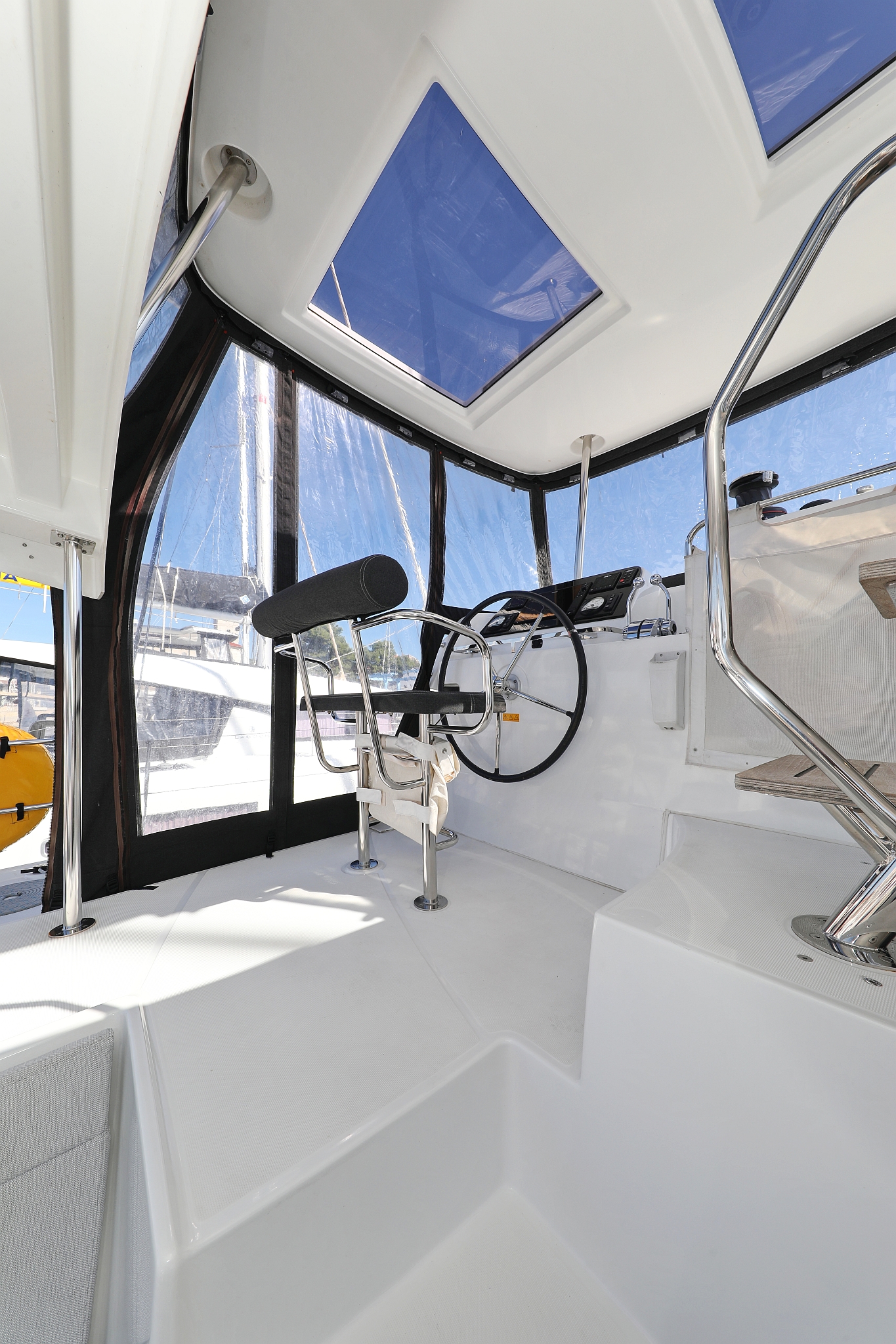 | Outside | 220V shore connection, Anchor with chain, Boat hook, Cockpit shower, Cockpit speakers, Cockpit cushions, Cockpit table with ice box, Deck cushions, Electr. anchor windlass, Foldable steering wheel, Fender, Mooring lines, Gangway, Hardtop, Solar panels, Sun deck, Teak in cockpit, Water hose, Winches |