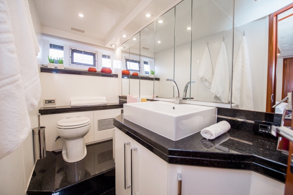 | Inside | Clock, CD Player, Freezer, Generator, Dishwasher, Inverter 12V/220V, Coffee machine, Airconditioning (independent from shore power), Refrigerator, Battery charger, Microwave oven, Mosquito nets, Pantry equipment, Radio, USB Socket, Warm water, Kettle, Watermaker, WC (electr.) |