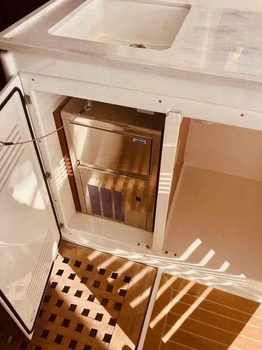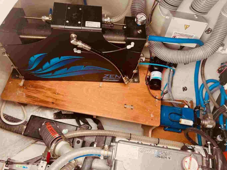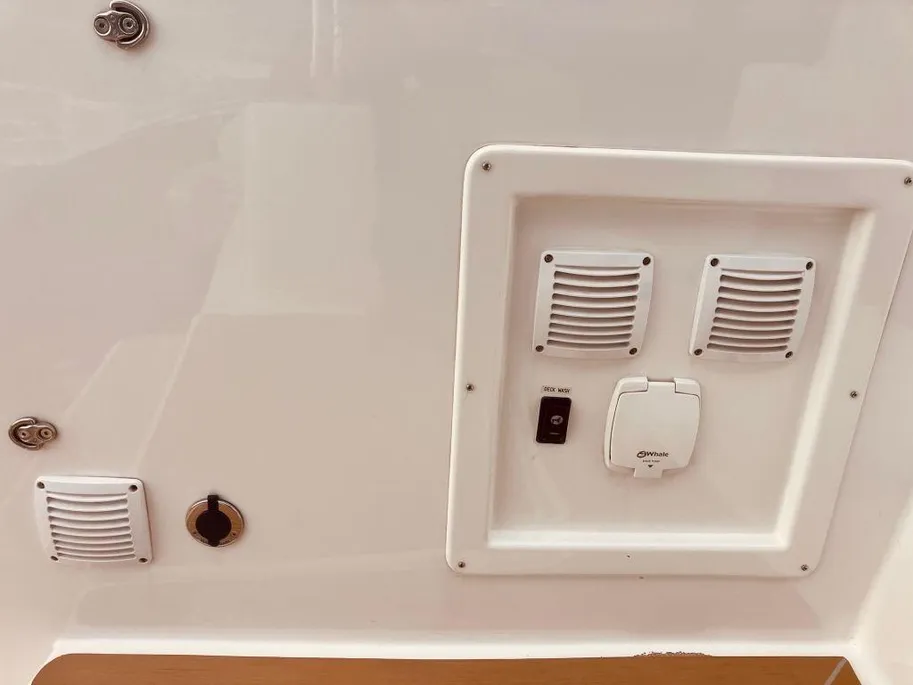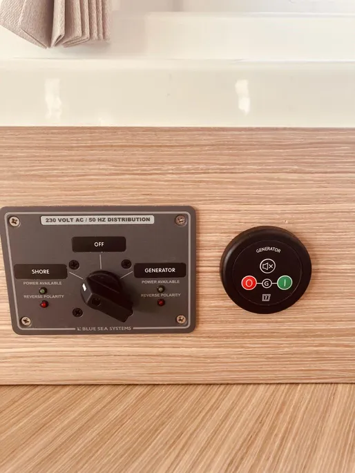 | Inside | 220V sockets, Oven, CD Player, Ice cube machine, Freshwater pump, Generator, Heating, Airconditioning (independent from shore power), Refrigerator, Battery charger, Radio, TV, Warm water, Watermaker, WC (electr.) |
